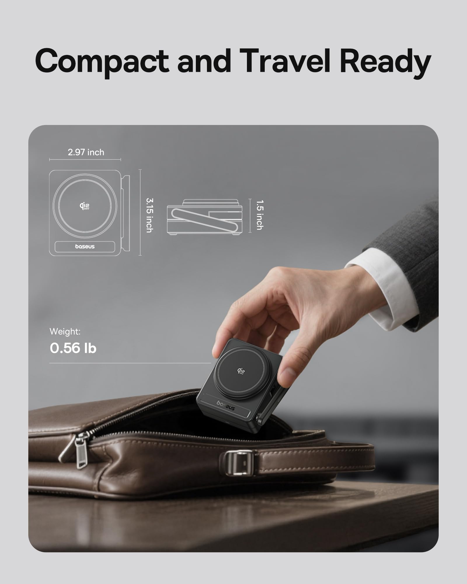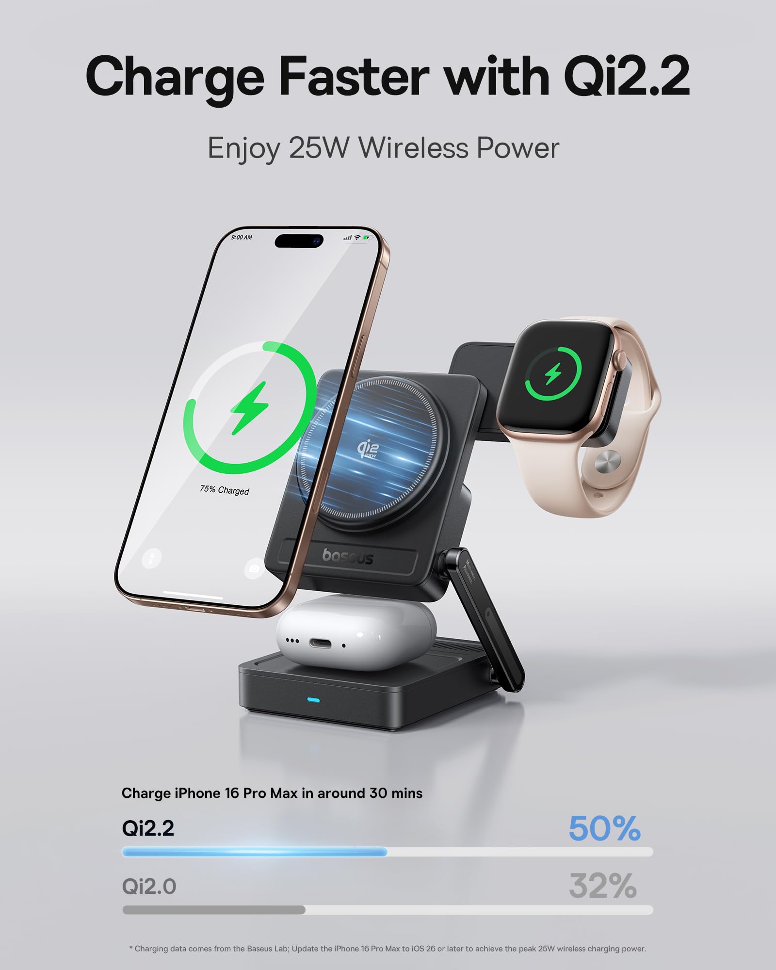 25W Qi2.2 Wireless Fast Charging: Baseus AF21 wireless charger features the latest Qi2.2 fast charging technology, instantly powering up iPhone 16 Pro Max to 50% in just around 30 minutes, 56% faster than the Qi2 15W charging. [Please note updating to iOS 26 or later to achieve the full 25W peak power.]