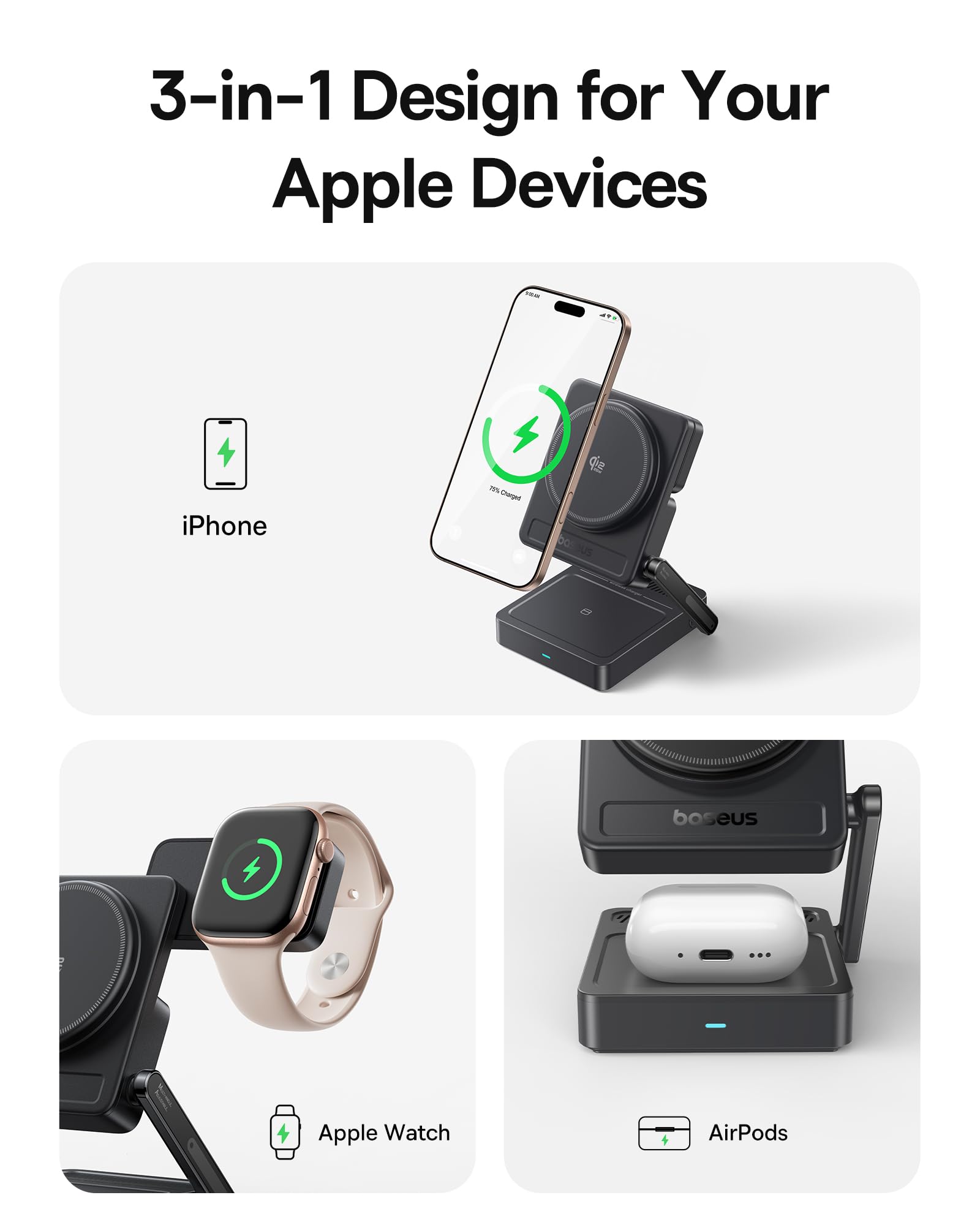 3-in-1 Apple Charging Station: Power your iPhone, Apple Watch, and AirPods all at once with one compact charger. It's widely compatible with iPhone 12 and newer, all Apple Watch models (S1–S10, SE, Ultra), and Qi-enabled earbuds. Keep all your essentials ready to go with this all-in-one Apple charging station.