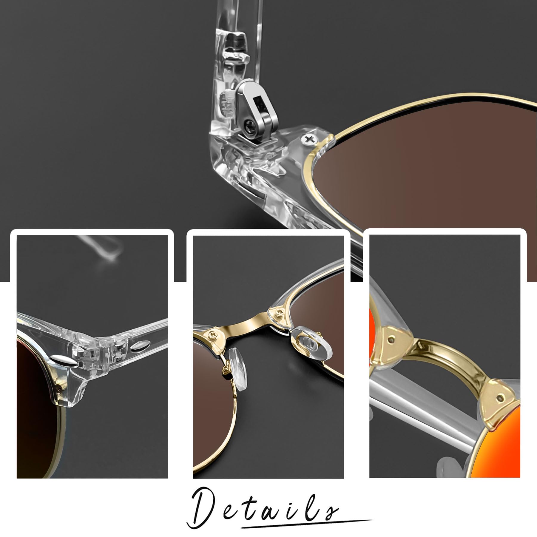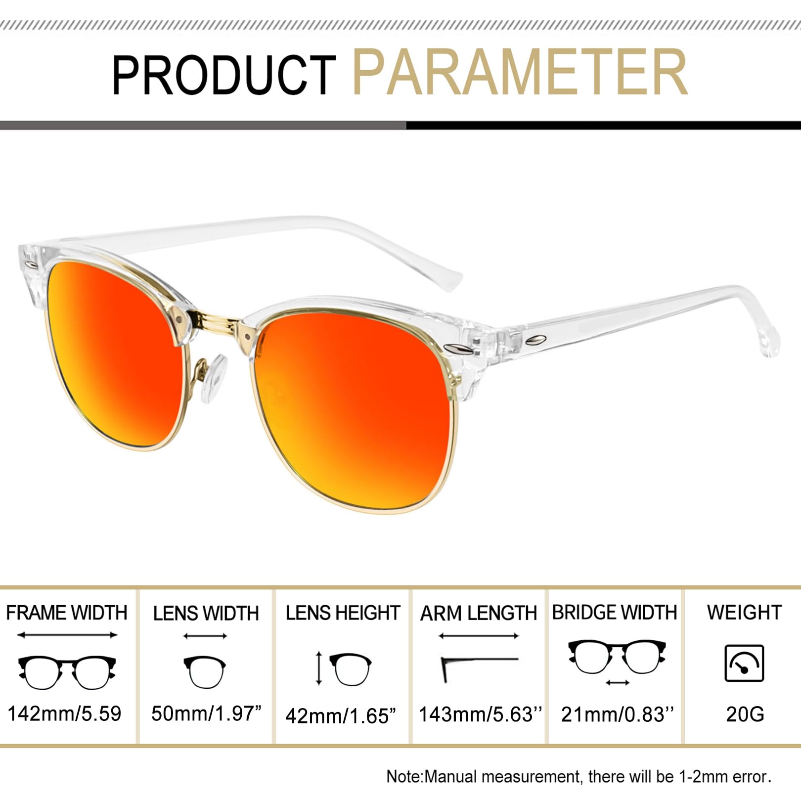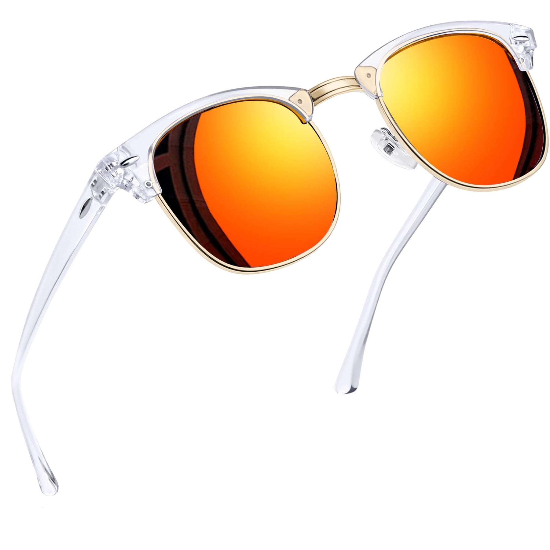 Timeless Browline Style: Club Masters sunglasses date back to the 1950s, were popular in the 1980s, and are still a classic today. Semi rimless sunglasses have a solid plastic browline area, with sturdy wire metal frame, soft silicone nose pads, double-burst metal hinges, and polarized lenses make clear frame sunglasses perfect for everyday use.Red mirrored sunglasses make you attractive, you may be the center when you wear trendy horn rimmed sunglasses at club or party