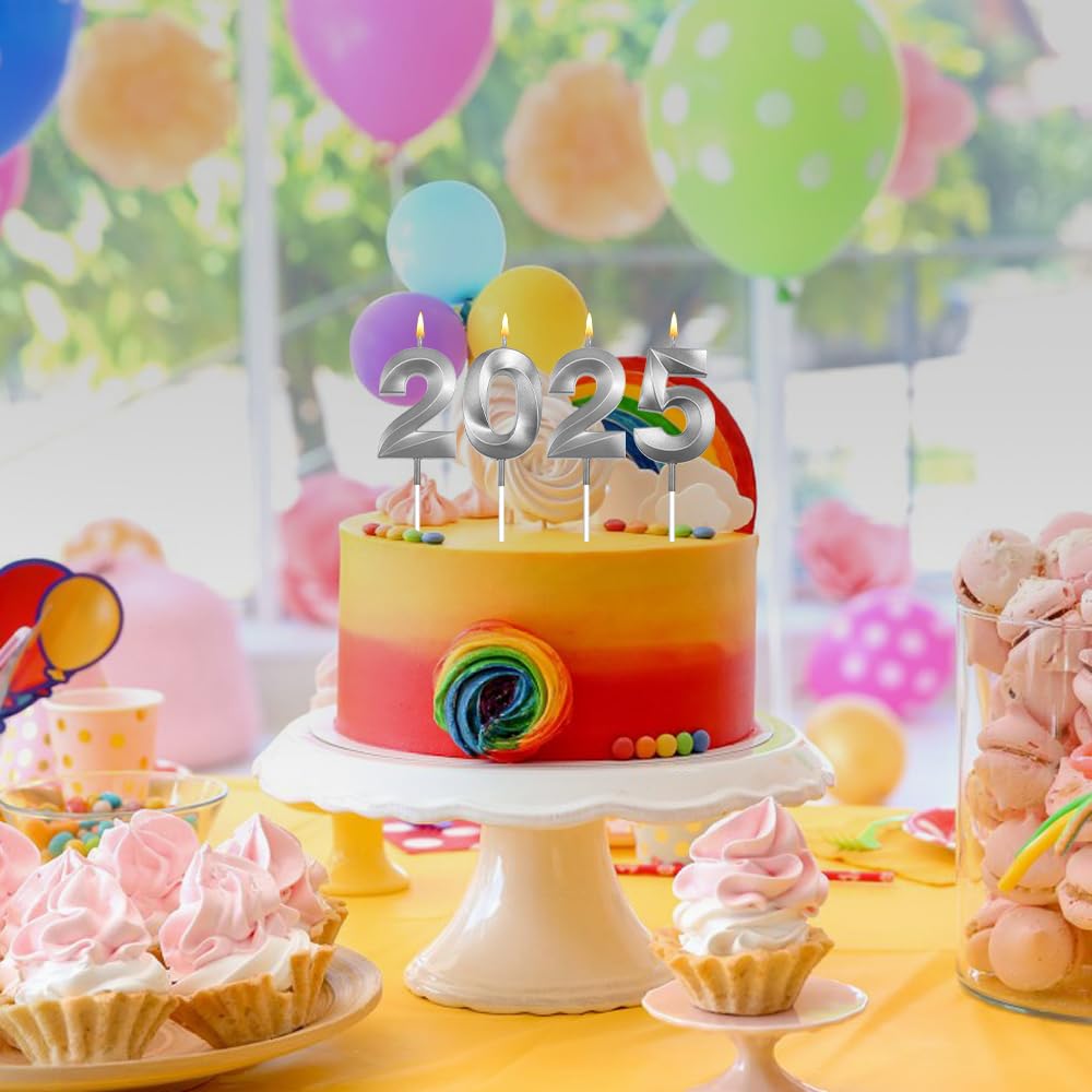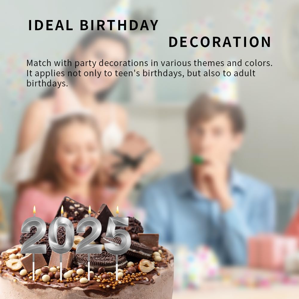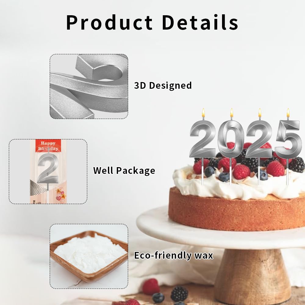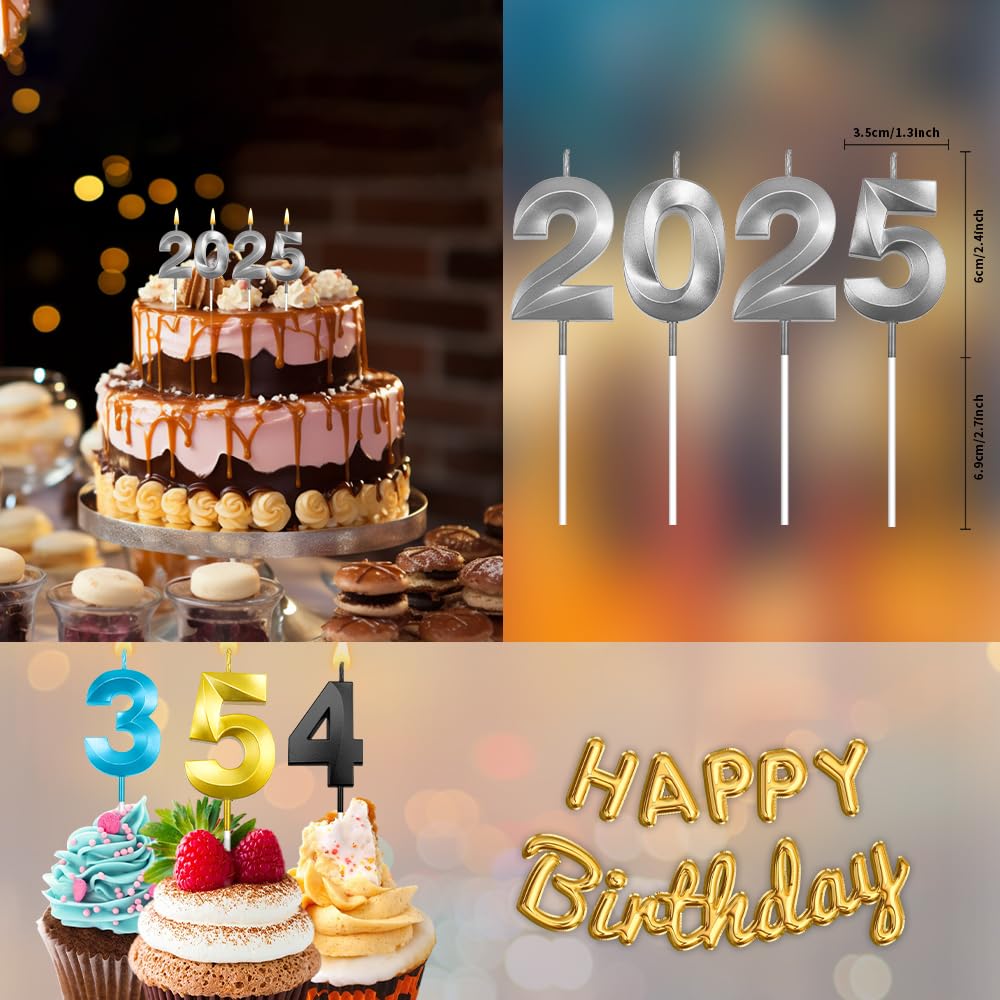 Graduation Candle 2025, 4 Pcs 3D Visual 2025 Silver Number Candles for Graduation Cake Decorations, Class of 2025 Cake Topper, 20, 22, 25, 50, 52 Birthday Candles Happy Birthday Cake Toppers
