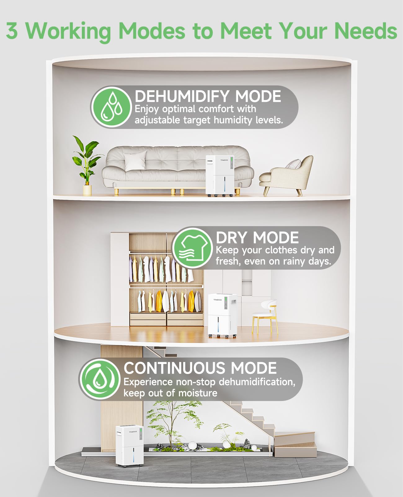 3 Versatile Dehumidification Modes - Elevate your indoor comfort with our bedroom dehumidifier’s 3 dynamic modes! The DEHU mode, effortlessly adjust humidity from 30% to 80% to create your ideal space, the DRY mode is perfect for quickly drying delicate clothes, the CONT mode effectively tackles moisture. Whether it’s a rainy day or a muggy night, easily choose the mode that fits your needs and enjoy a refreshing home atmosphere