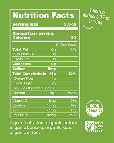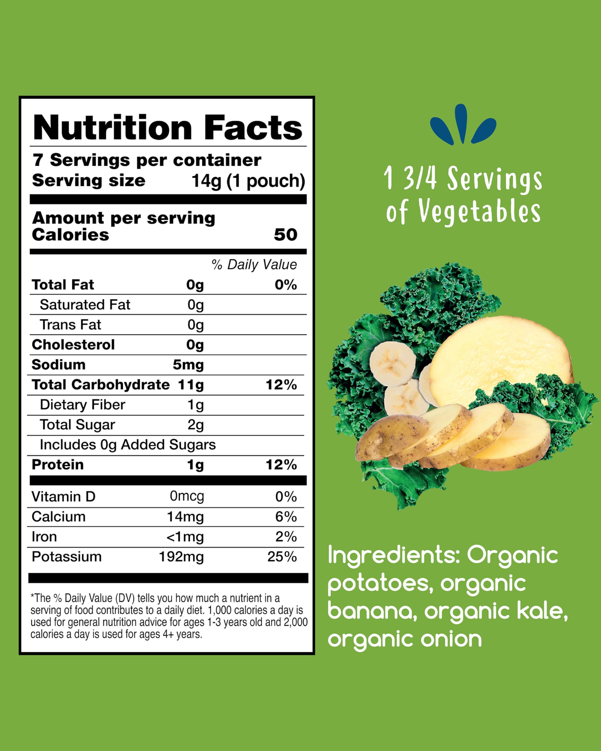 SIMPLE, CLEAN INGREDIENTS: We use only the best whole ingredients in our baby pouches and baby snacks to bring the benefits of fresh, homemade food directly to your table. Kale Potato Veggie Mash is made from organic kale, onion, potato and banana.