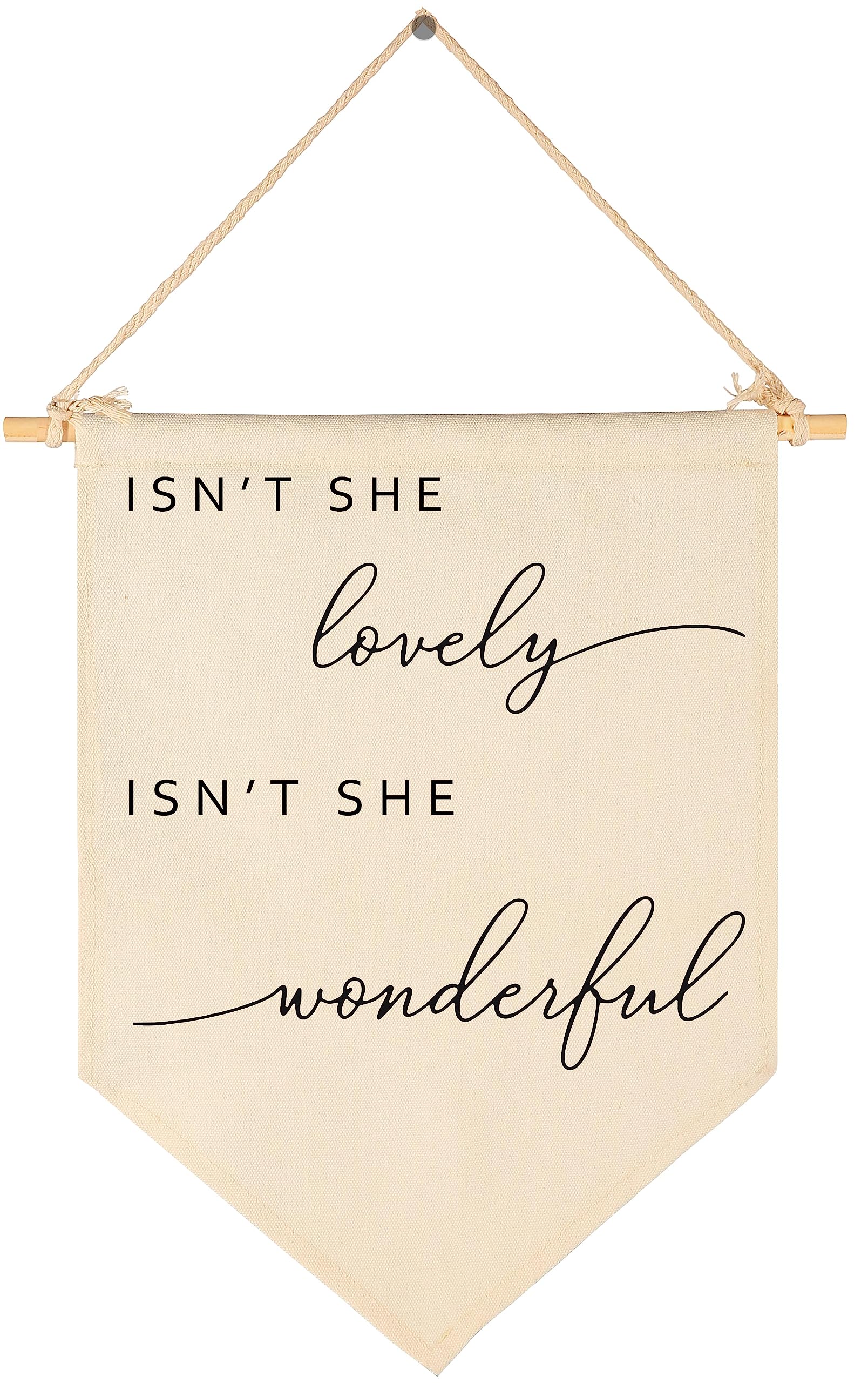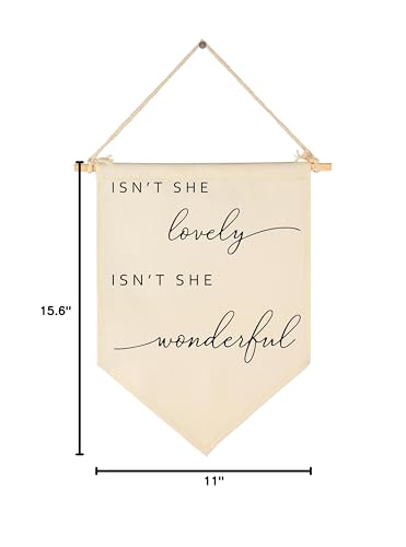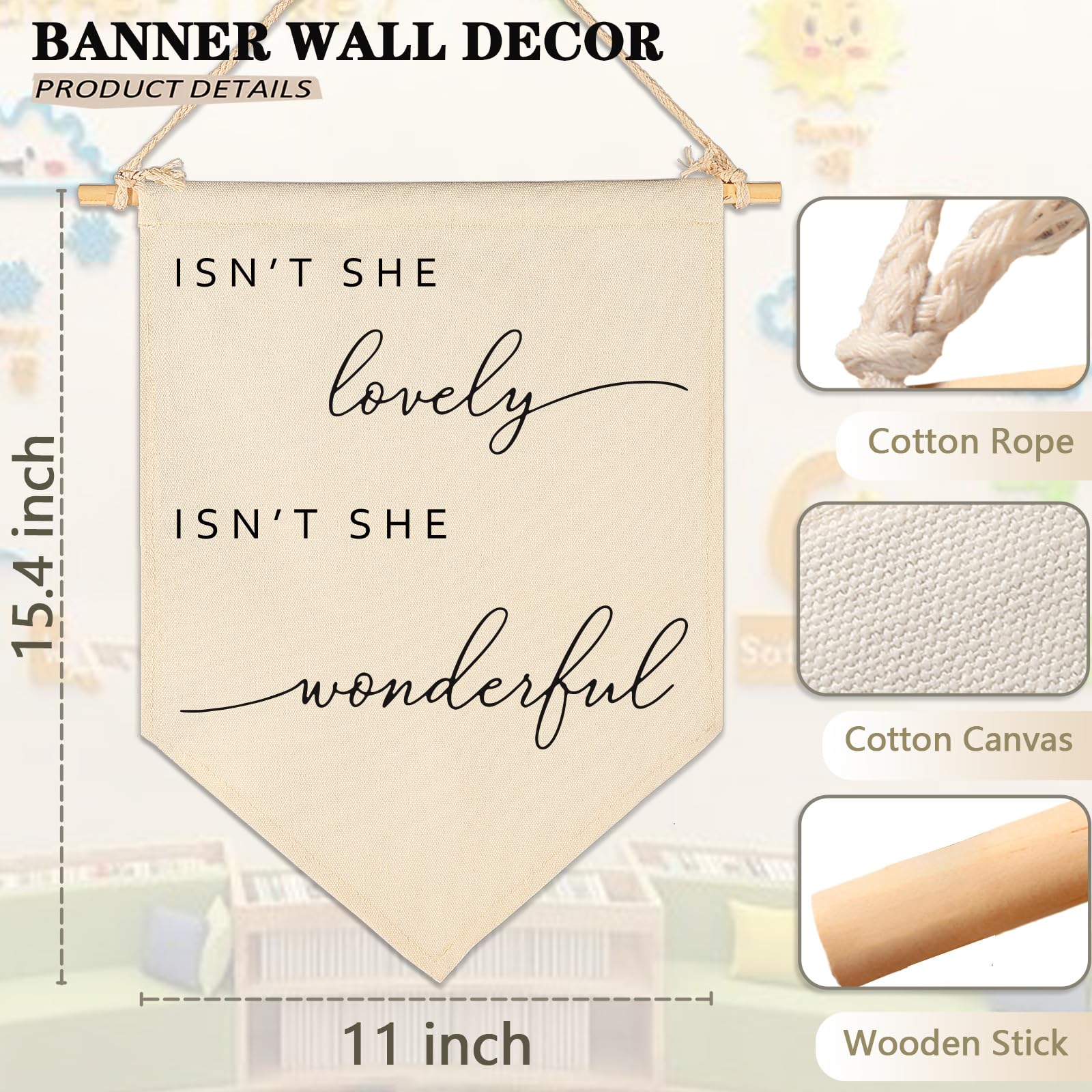 Crafted from natural cotton canvas, this 15.4 x 11 inch nursery wall banner brings a soft and calming touch to baby room, toddler space. The durable fabric keeps its shape with a natural texture, while the clear print stays bright with everyday use. Lightweight and easy to hang, it comes with a wooden dowel and pre-tied twine for quick setup on walls, doors or shelves. The versatile size fits small spaces without feeling crowded, making it perfect for creating a cozy nursery atmosphere. A thoughtful gift for baby showers, newborn arrival or first birthday.