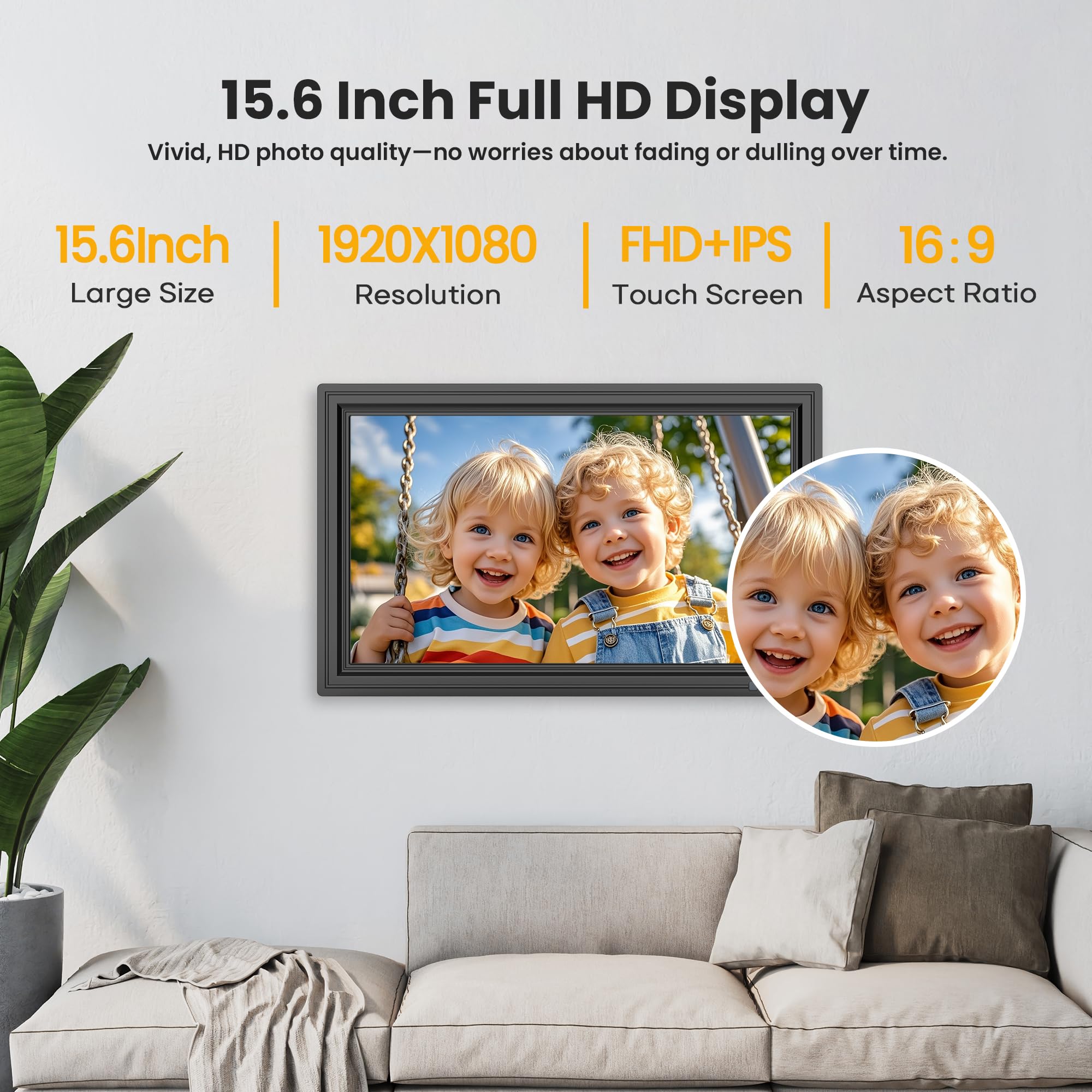 15.6 Inch Large Digital Picture Frame: Featuring 15.6 inch FHD 1080P IPS touch screen of a 1920 x 1080 resolution, gives you stunning viewing experience. Superior color fidelity ensuring photos or videos are clear and vivid. Full viewing IPS panel preserves vibrant, accurate colors from any position. Simple grandparent-friendly touch controls (swipe/tap) for effortless navigation.