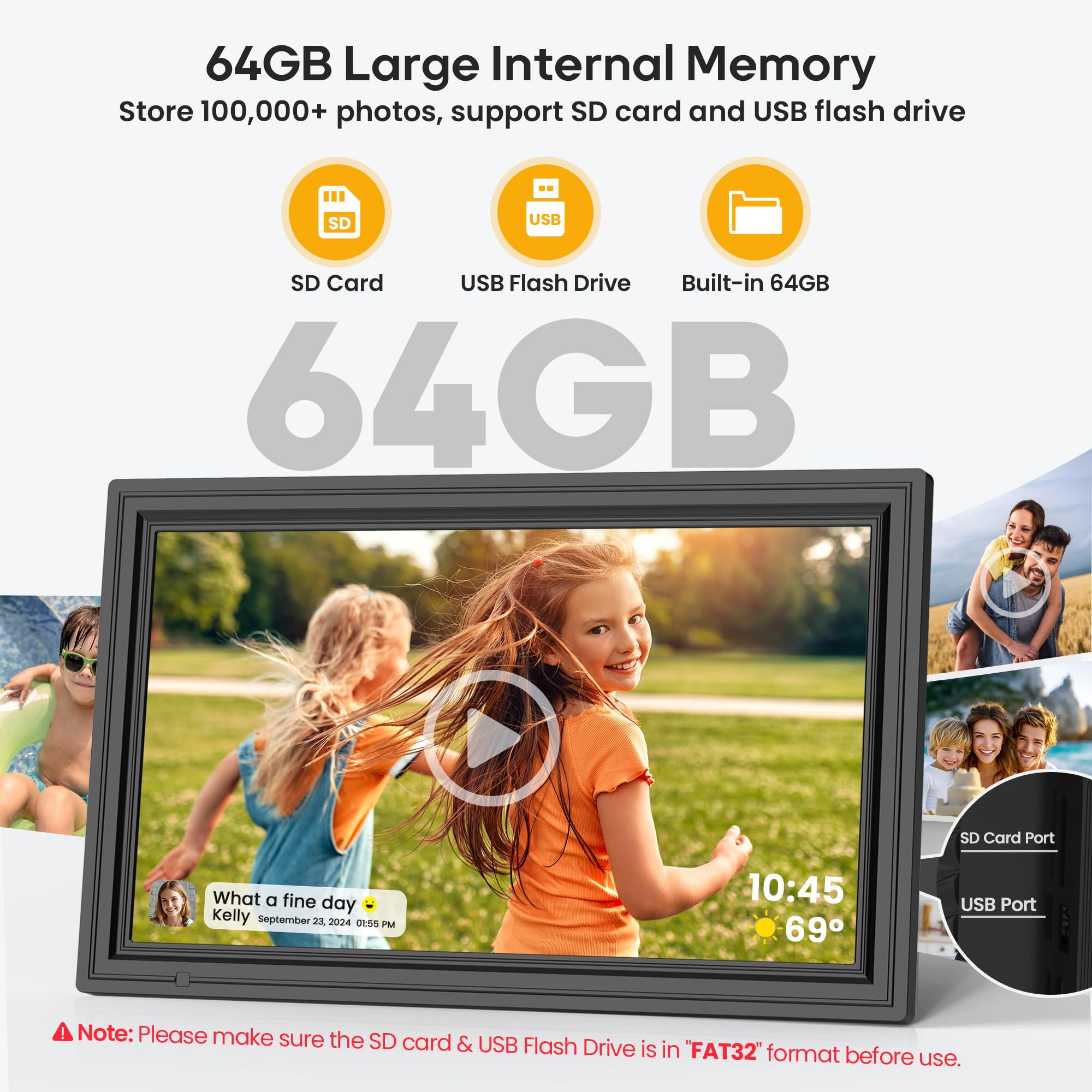 64GB Large Built in Storage: Never run out of space! This 15.6-inch digital frame holds 160,000+ photos (64GB built-in) and supports SD card and USB flash drive for easy transfers and backups. Note: 1. Please format the SD card and USB drive to "FAT32" before use. 2. For best compatibility, we recommend using a 32GB SD card or USB drive, as 64GB and 128GB options may not work properly with the frame.