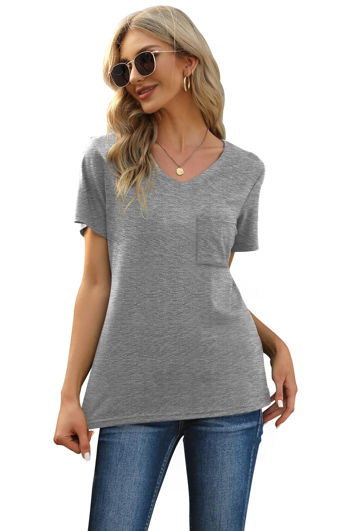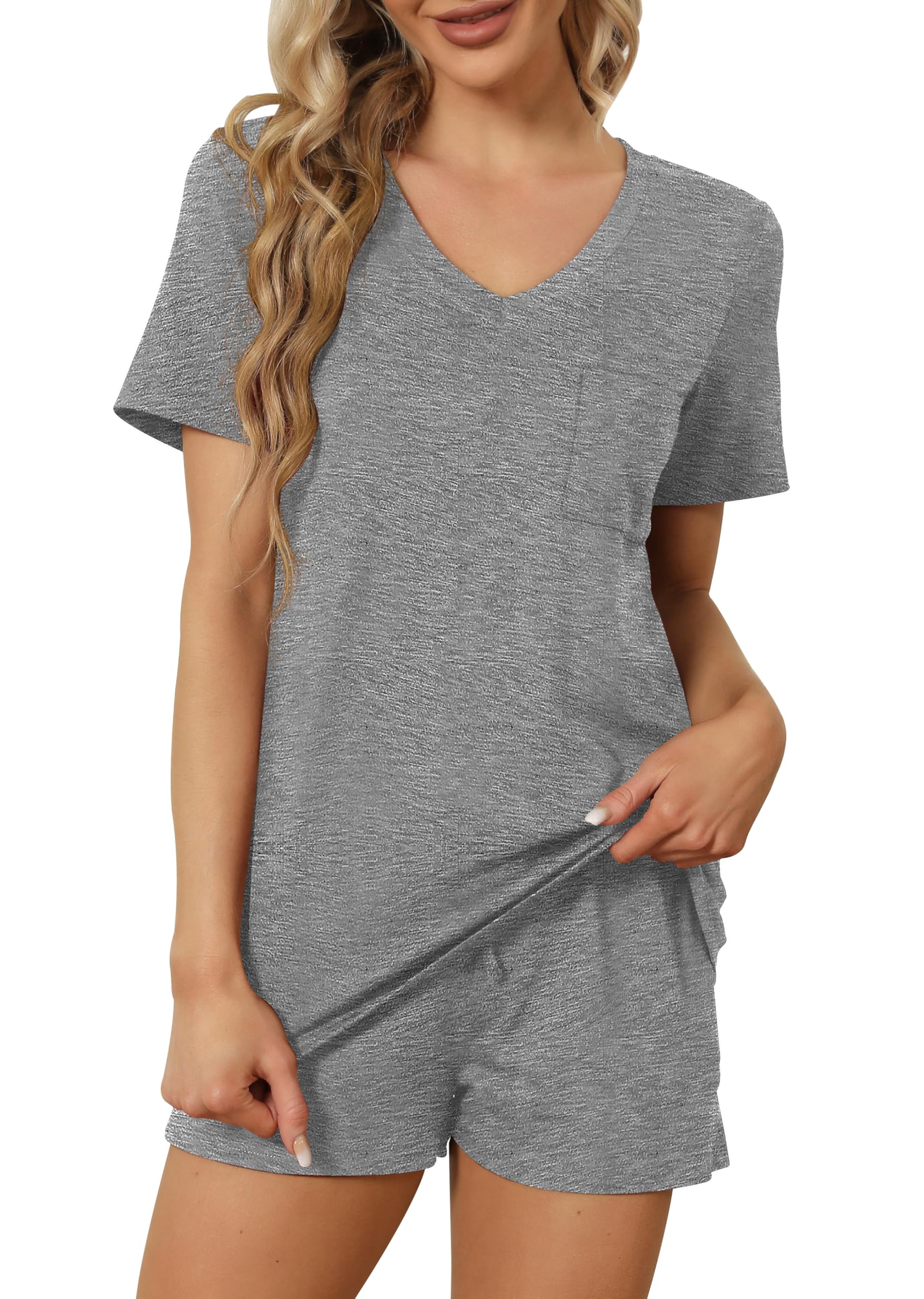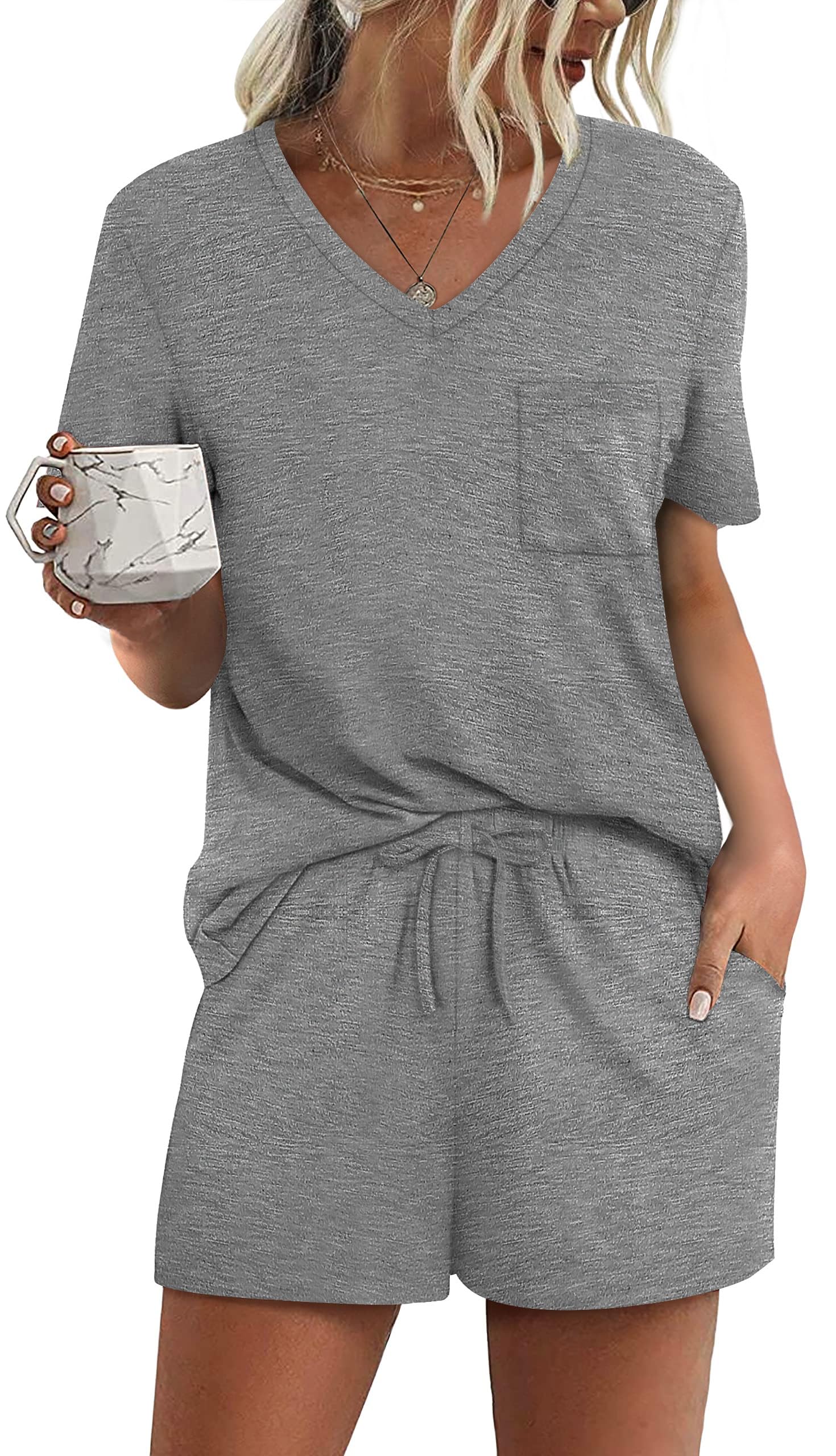 FEATURE --- The package including 1 x short sleeve t-shirt and 1 x short. The top has classic v neckline and a pocket. The short has elastic drawstring and side pockets. The cute top is perfectly complemented by shorts. Casual and sexy in daily life.
