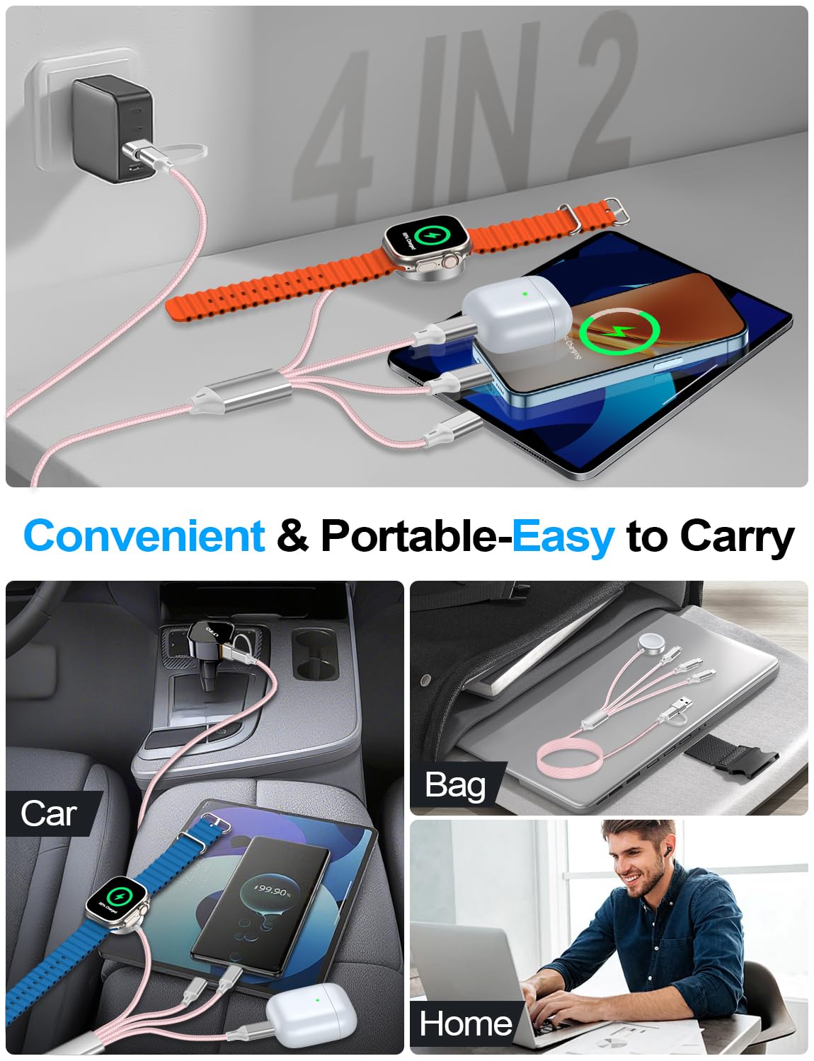 【Travel Essentials & Convenient】This 4-in-2 Type C/USB A cable is a travel essential and convenient to carry around with lightweight.Use this portable charging cable compatible with Apple Watch/iPhone and Samsung devices on flights, in cars, or with power banks–suitable for home, office, and travel accessories.It fits in your travel bag smoothly take it on the go, just charging your Apple watch/iPhone/Samsung or any other devices at anytime.