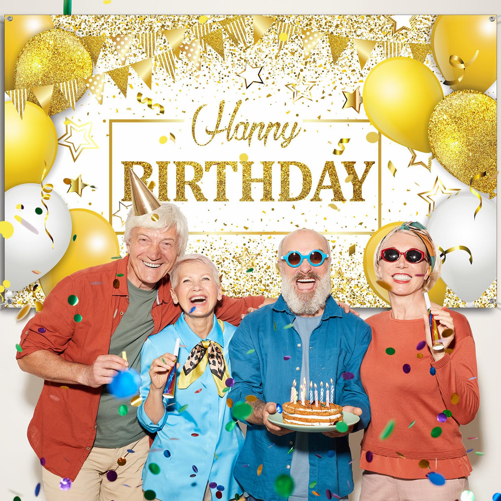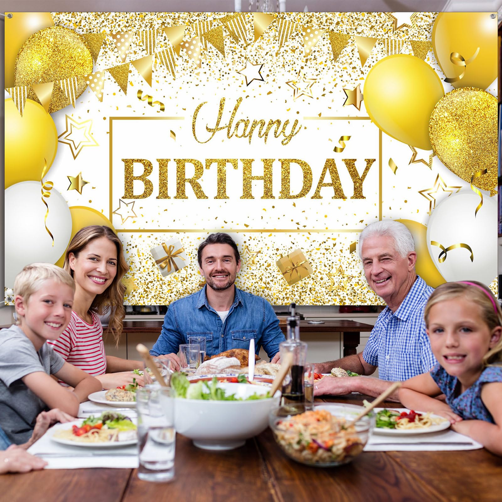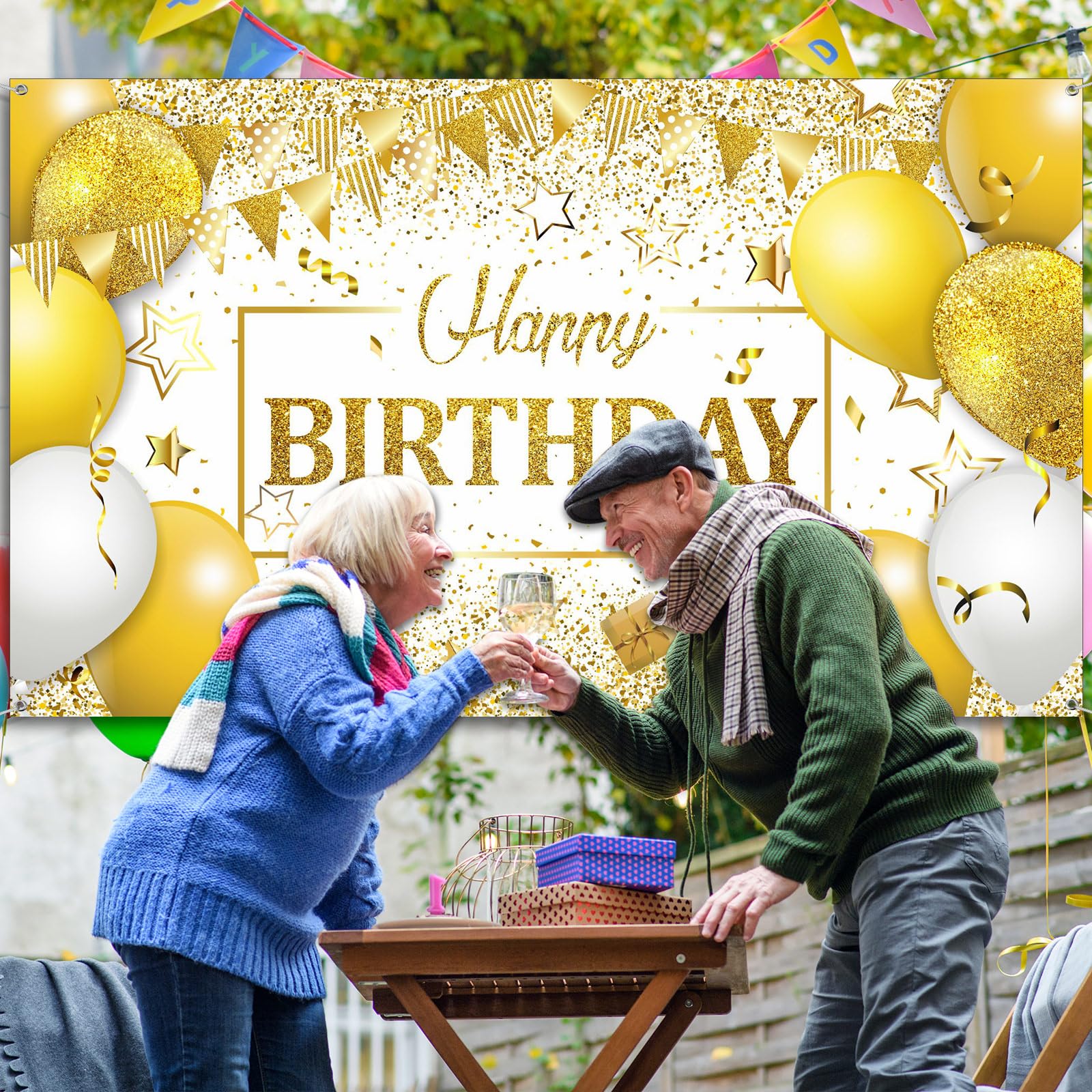 Package Content: there is 1 piece of happy birthday sign backdrop, designed in navy white and gold, and printed with classic patterns of balloons, gifts, glittery stars, adding an impressive touch to the birthday party, serving as an ideal decoration to create a memorable atmosphere for your birthday