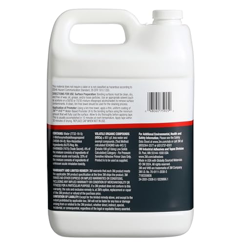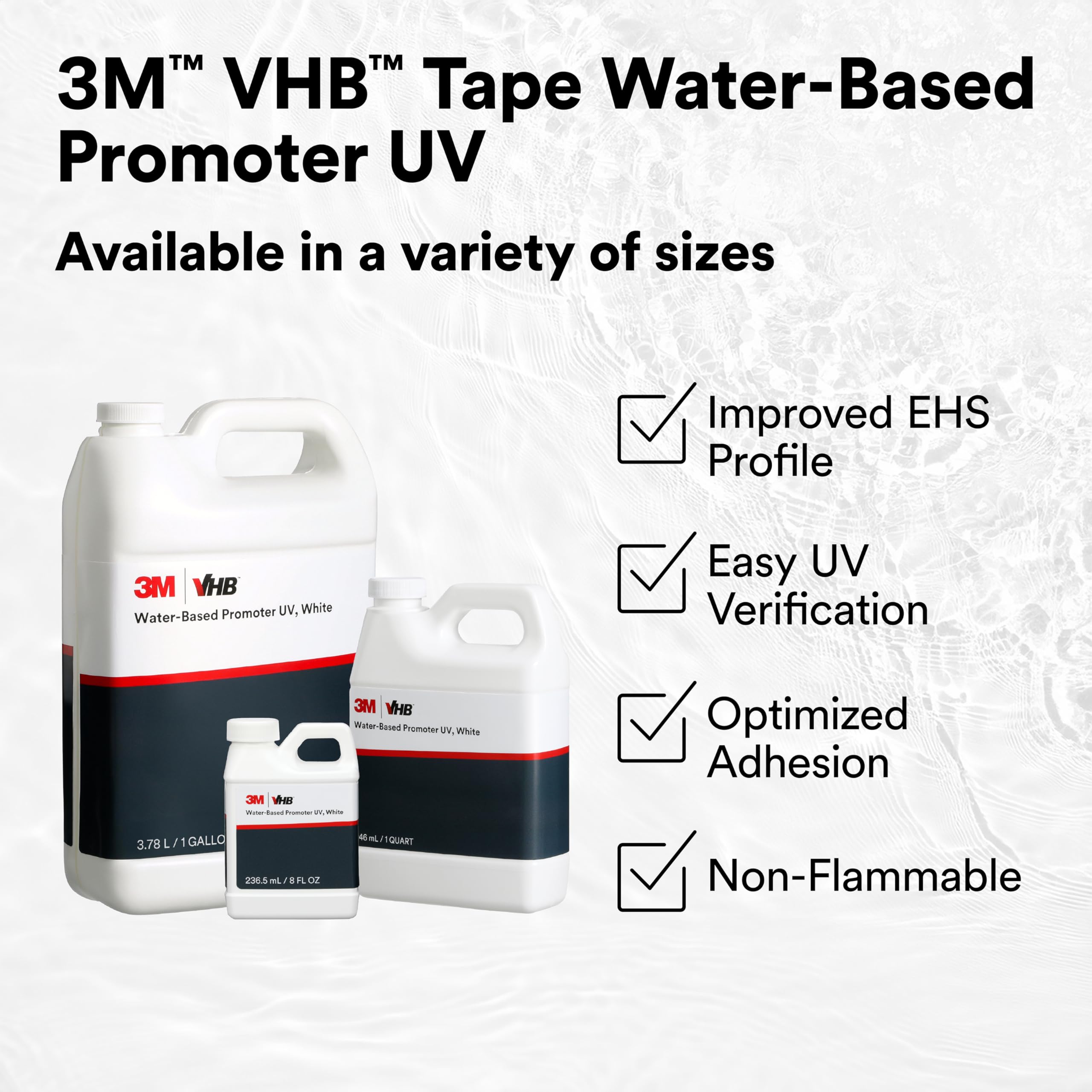 Not only does the 3M™ VHB™ Tape Water-Based Promoter UV enhance the performance of 3M™ VHB™ Tapes, but it also can help to improve your environmental health and safety profile. It helps you to increase the adhesion of 3M™ VHB™ Tape to a variety of different substrates, including (but not limited to): ABS, PMMA, Polycarbonate, FRP, PVC, Metal, Paint, and more. Choose the 3M™ VHB™ Tape Water-Based Promoter UV for enhanced adhesion, sustainability, and a brighter future. Experience the reliability and peace of mind that comes with using a product that not only delivers exceptional performance but also aligns with your commitment to environmental responsibility.