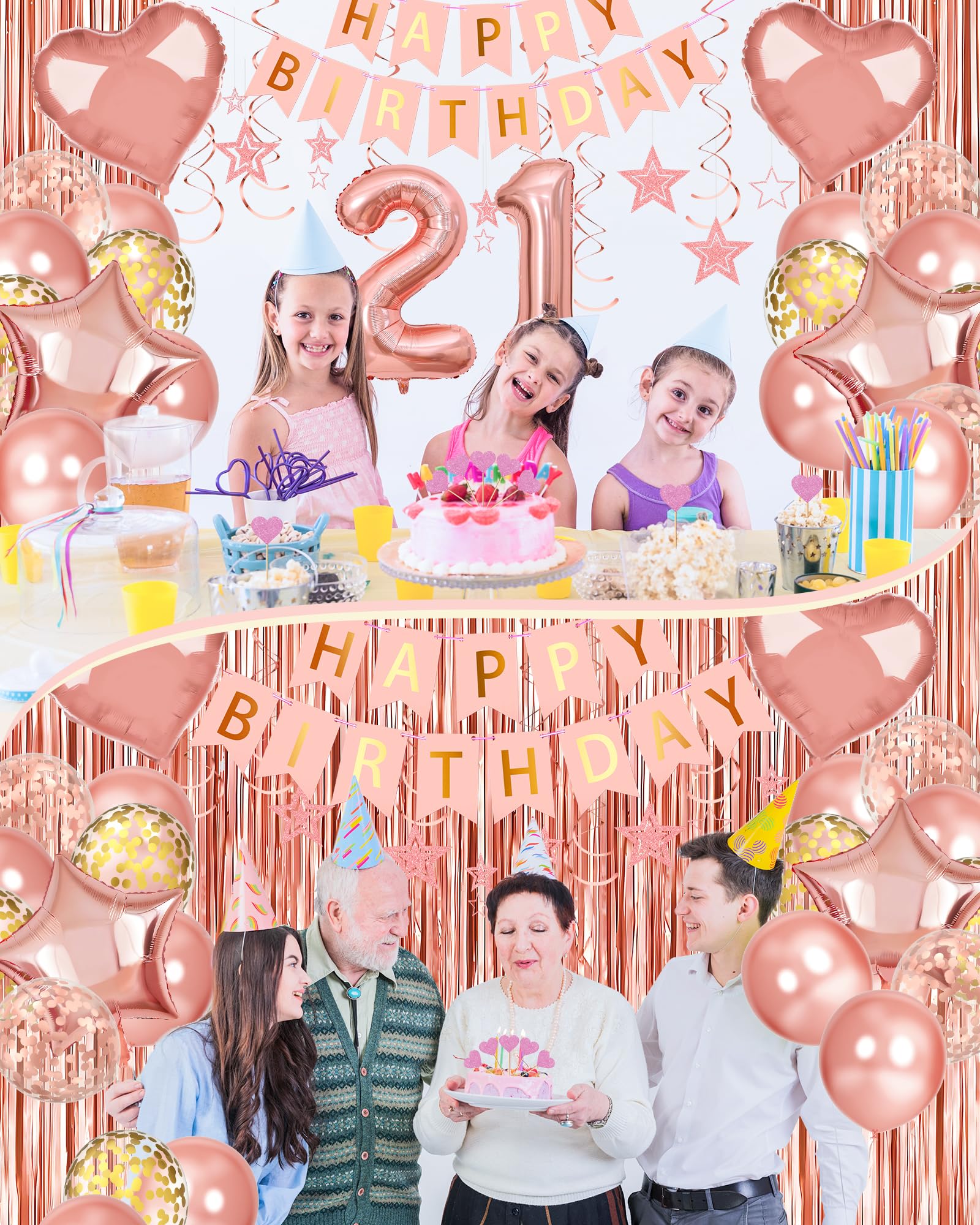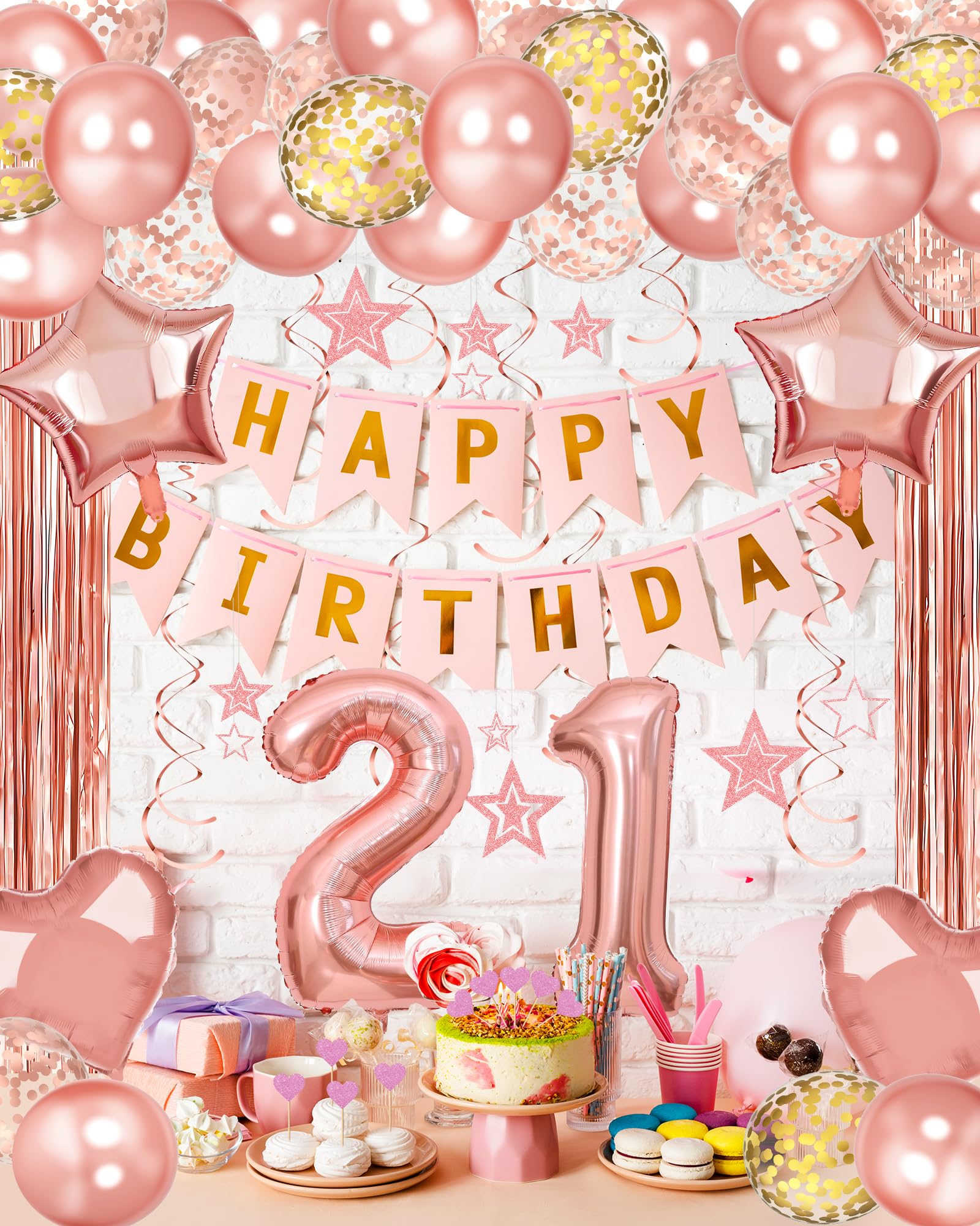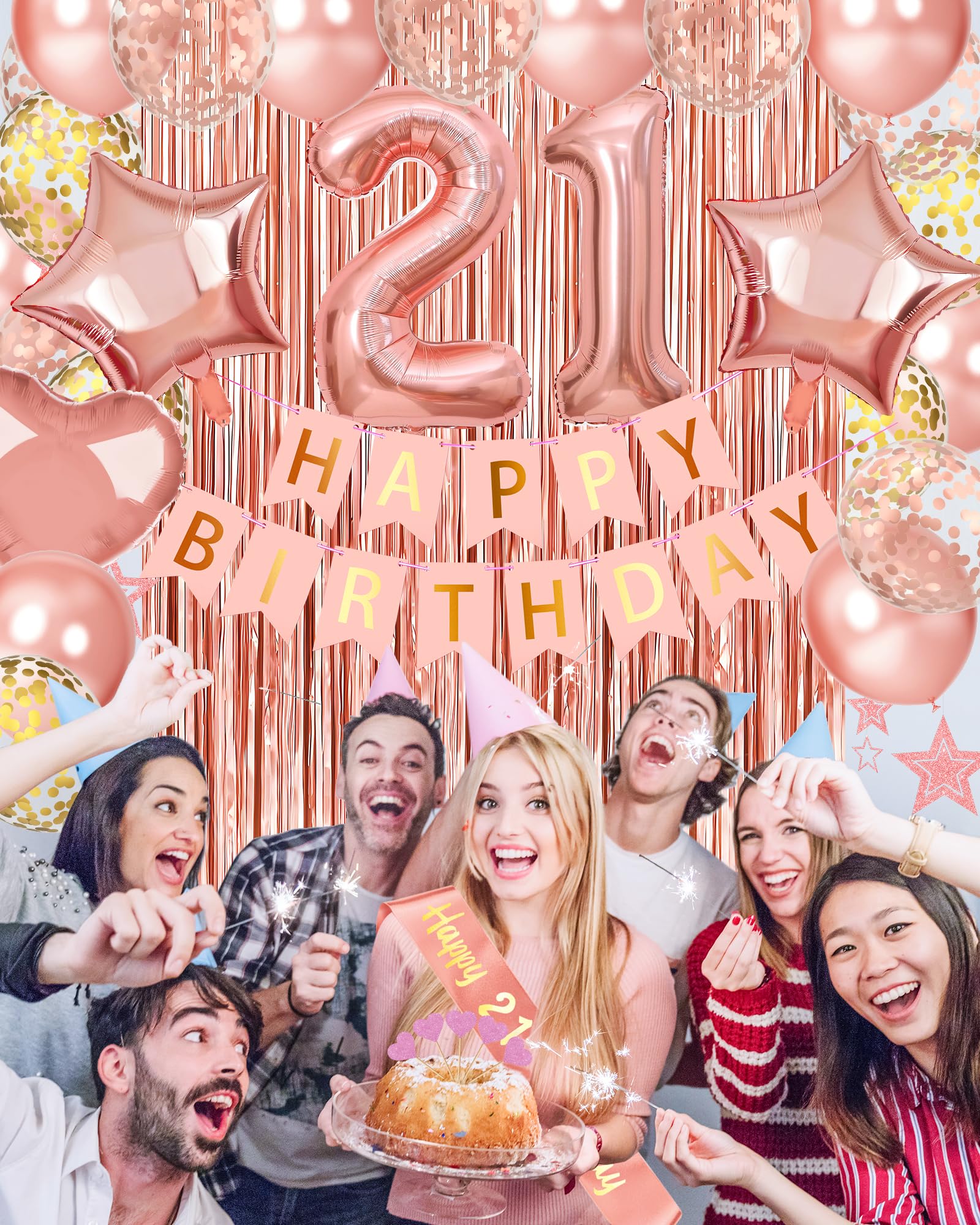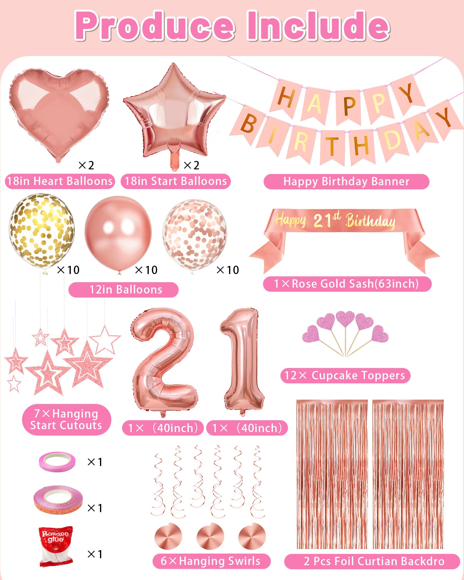 VALUE PACK: This rose gold decorations including all stuffs you need for girls and women 21th birthday party: 1 string of Happy Birthday Banner, 2 pcs 40" rose gold number balloons "21", 1pc 63"long rose gold sash, 2 pcs 3.28*6.56ft Foil Curtain Backdrops, 10 pcs rose gold latex balloons, 20 pcs gold and rose gold confetti balloons, 4 pcs heart and star shaped foil balloons, 6pcs rose gold hanging swirls, 7pcs glitter rose gold hanging stars, 12pcs cupcake toppers, 2pcs ribbon and 100 dot glue.