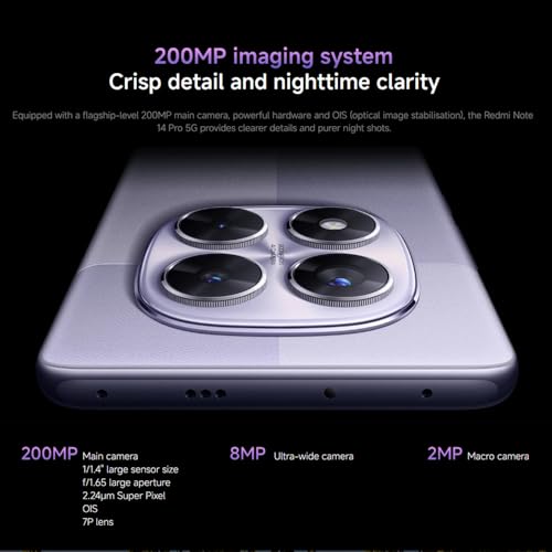 Exceptional imaging performance 200MP imaging system Crisp detail and nighttime clarity Equipped with a flagship-level 200MP main camera, powerful hardware and OIS (optical image stabilisation), the Redmi Note 14 Pro 5G provides clearer details and purer night shots. Capture ultra-clear 200MP images with rich details and vibrant colors thanks to the power of End-to-End (E2E) AI Remosaic algorithms, which greatly enhance processing speed and image quality. 4× lossless zoom Optical-level lossless zoom With both 2× and 4× optical-grade lossless zoom, you can easily switch between different focal lengths to frame your shot without a pixel out of place. Captivating night shots Discover the allure of the dark RAW algorithms have been further refined, retaining more image details, making night shots even more stunning. With Smart-ISO Pro, Redmi Note 14 Pro 5G provides incredible HDR photos which automatically adjusts your phone camera to capture better details in both dark and bright areas of a scene. It makes sure each photo you take is not overexposed with dark areas clearer, leading to better light and shadow balance. IP68 dust and water-resistant Wet-touch technology The same quick response Stay connected without interruption and enjoy smooth scrolling even with wet, oily, or soapy fingers. Corning® Gorilla® Glass Victus® 2 Drop and scratch-resistant +200% Front drop resistance* The flagship-level durable glass screen delivers unparalleled strength that effortlessly withstands accidental drops. Flagship 3D curved screen Fits comfortably in your hand MediaTek Dimensity 7300-Ultra 45W turbo charging Efficient charging and battery health The battery health management algorithm learns your daily charging habits and adjusts the voltage and current in real-time, effectively delaying battery aging.