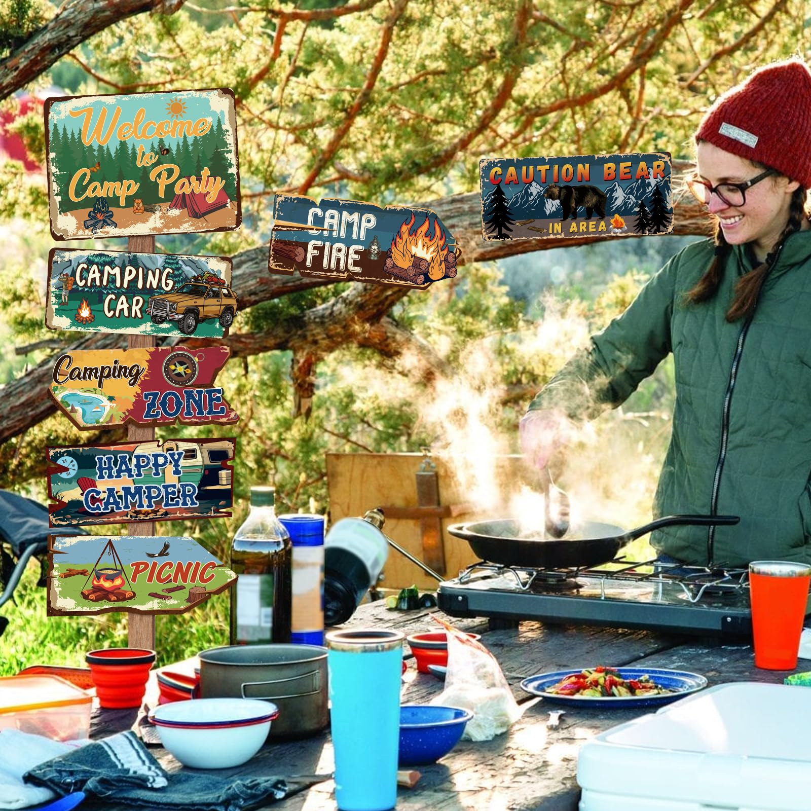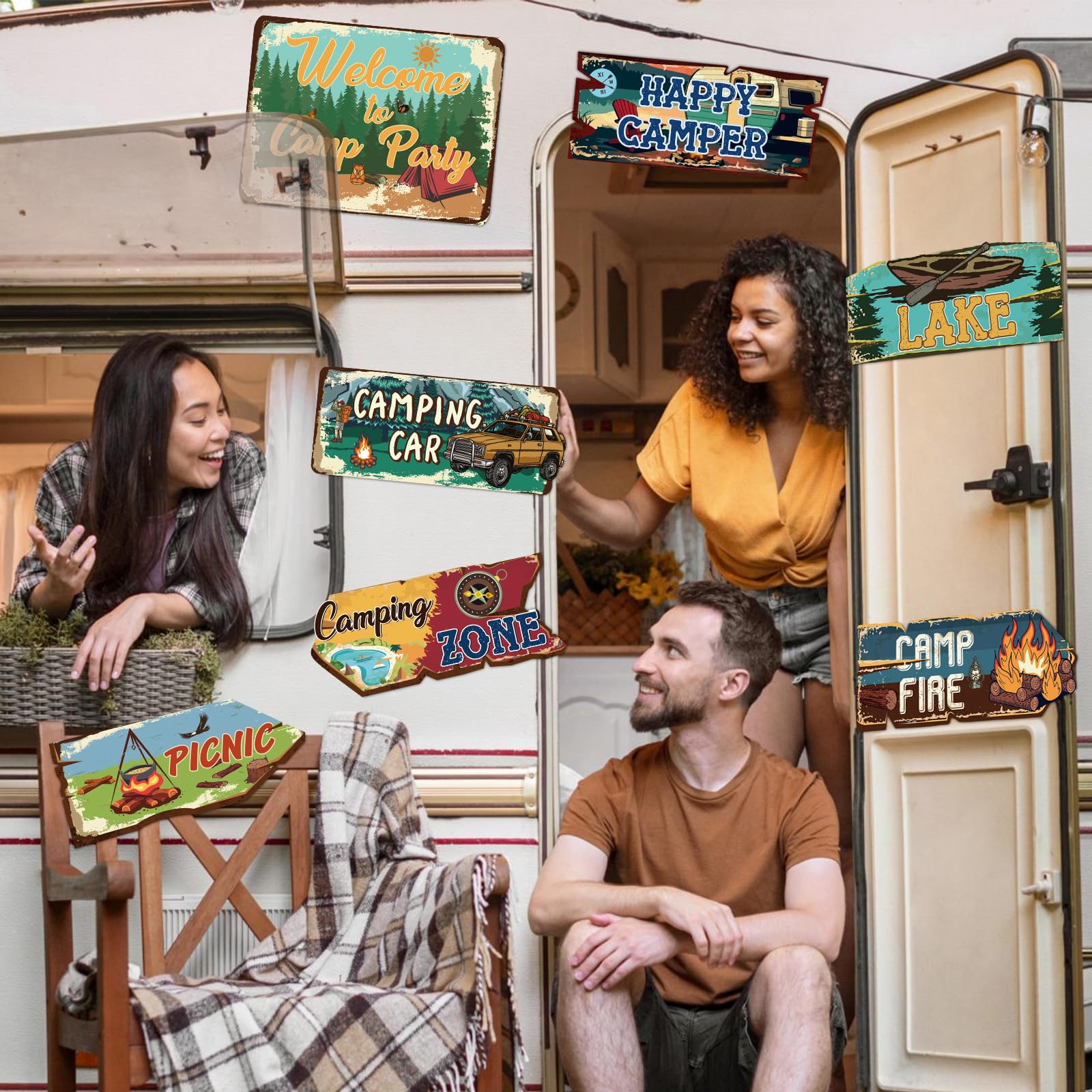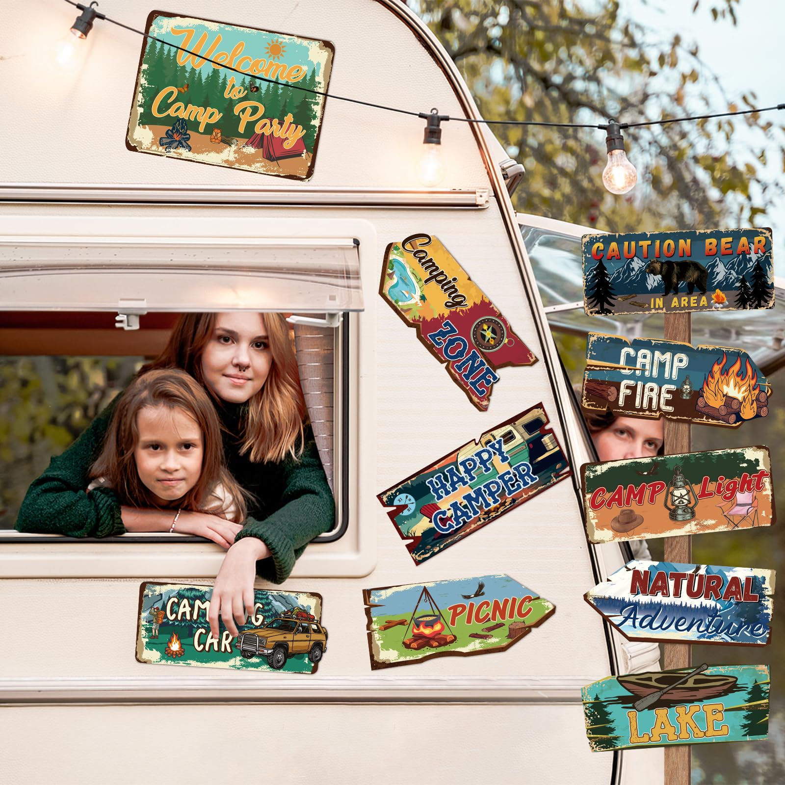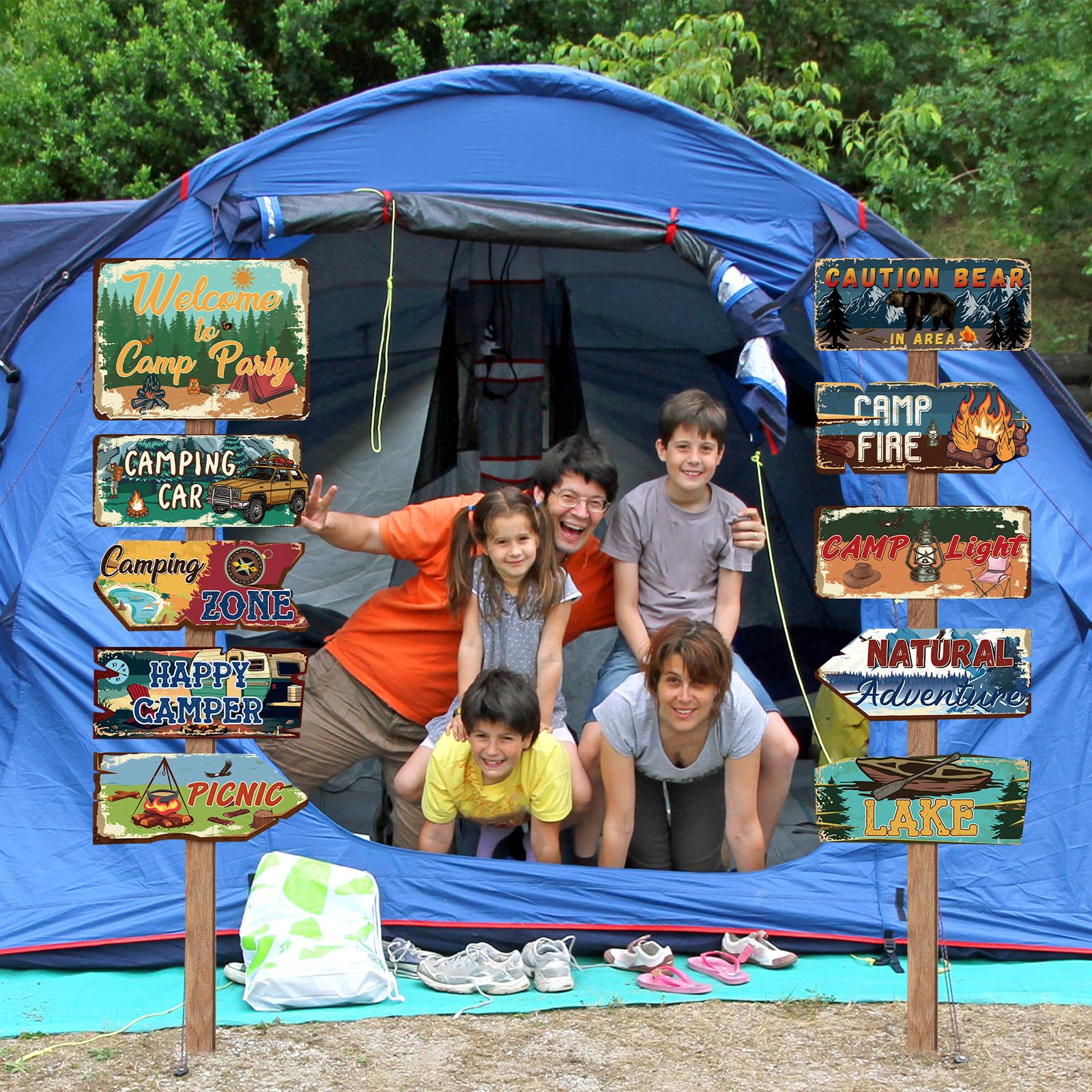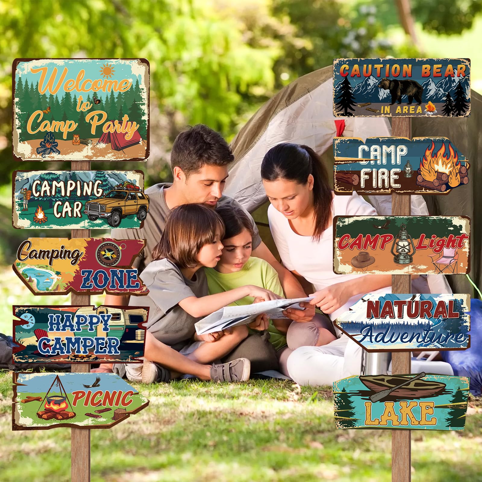 Designated area: Camping signs have messages that include Welcome to Camp Party, Caution in Area, Natural Adventure, Picnic, Happy Camping, Camp Light, Camping Car, Lake, Camp fire, Camping Zone, and is great fun as camping party decorations, party area signs, and outdoor camping supplies