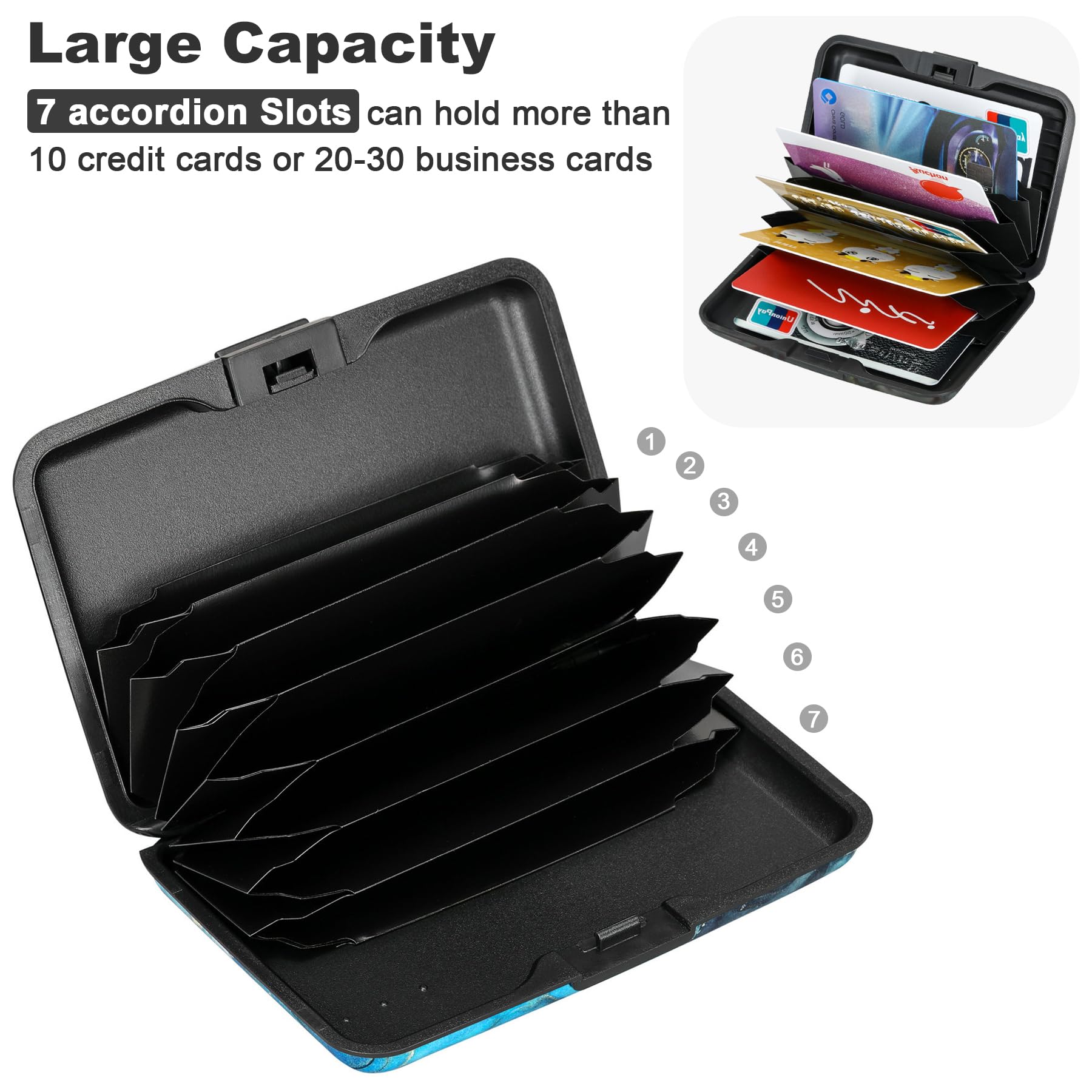 Latches safely and securely when not in use. Rounded corner wouldn't damage on your clothes. With 7 accordion Slots, Capacity for up to more than 10 credit cards or more than 20 business cards.