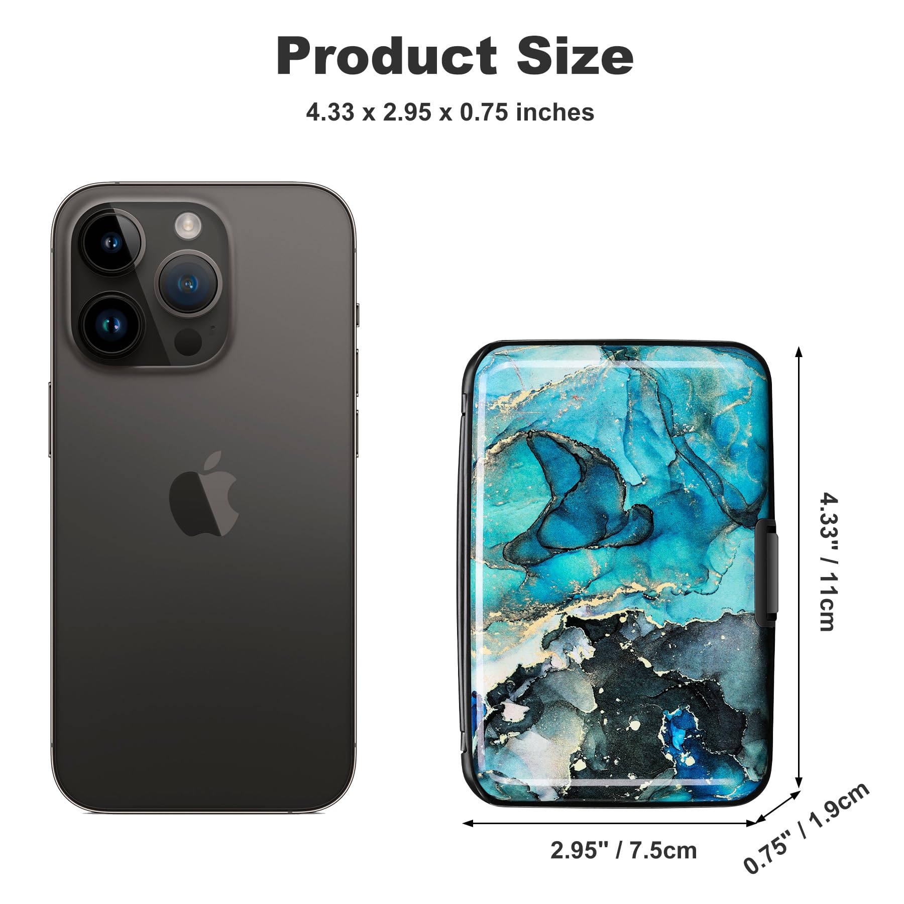 The size is 4.33 x 2.95 x 0.75 inches, Slim and small exterior design, are fit in your front pocket,suitable for travel and business carrying.