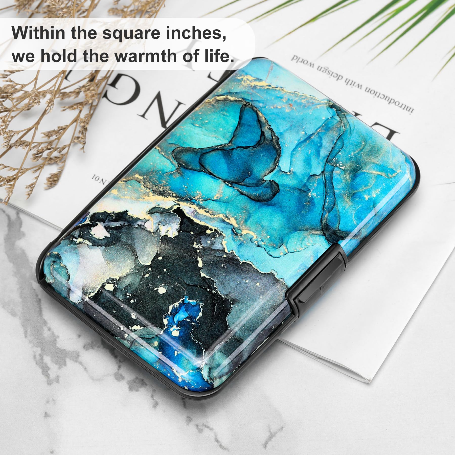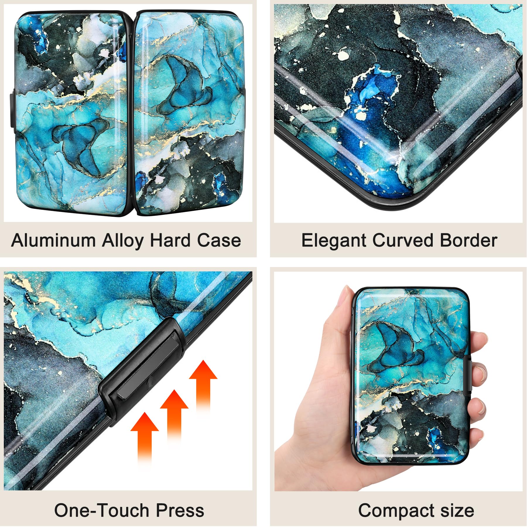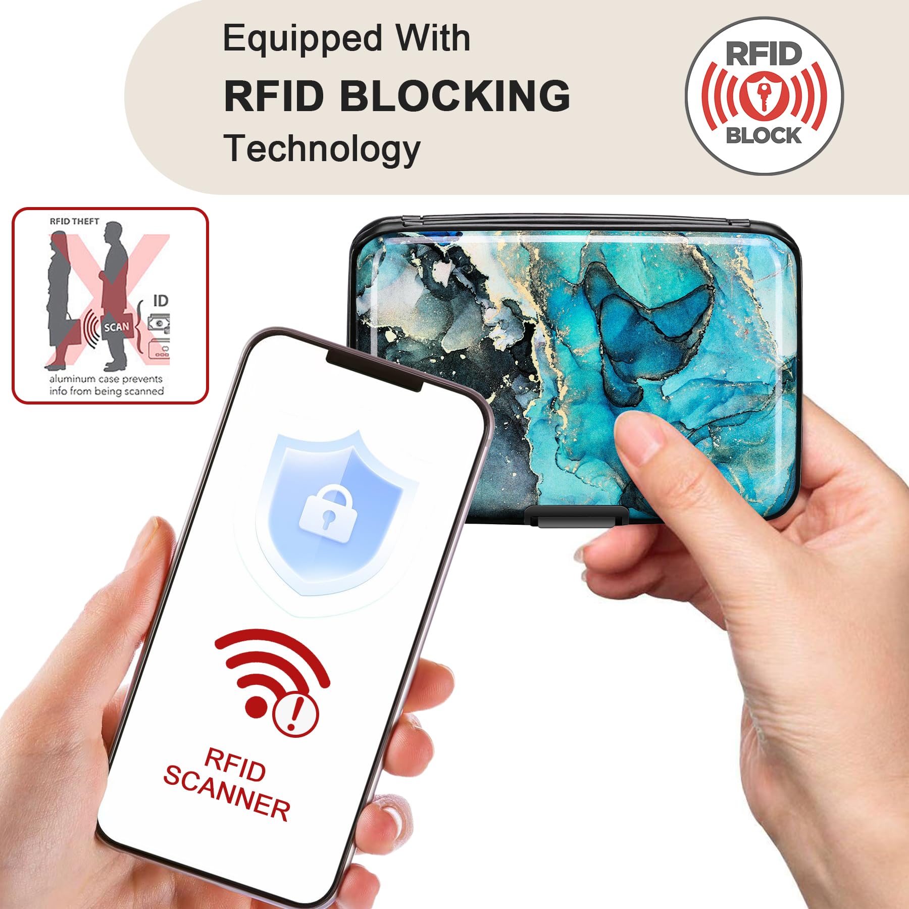 This credit card holder is made of aluminum shells, ABS plastic frame and clasp closure, RFID-blocking will protect your card data from RFID scanners and readers.
