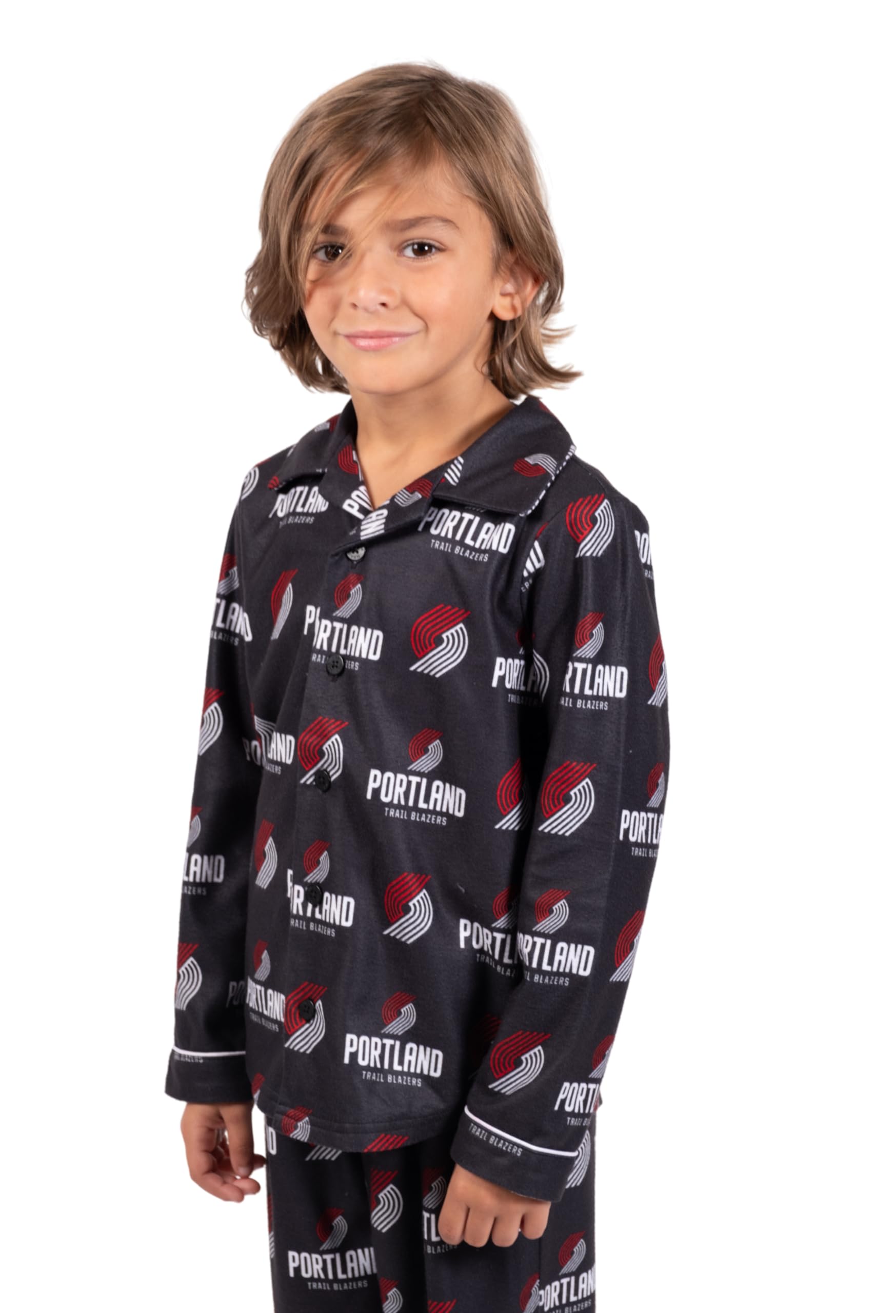 STYLISH DESIGN: This set includes a button-up shirt, elastic waistband bottoms, and an all-over print of your favorite NBA team's primary and secondary logos.