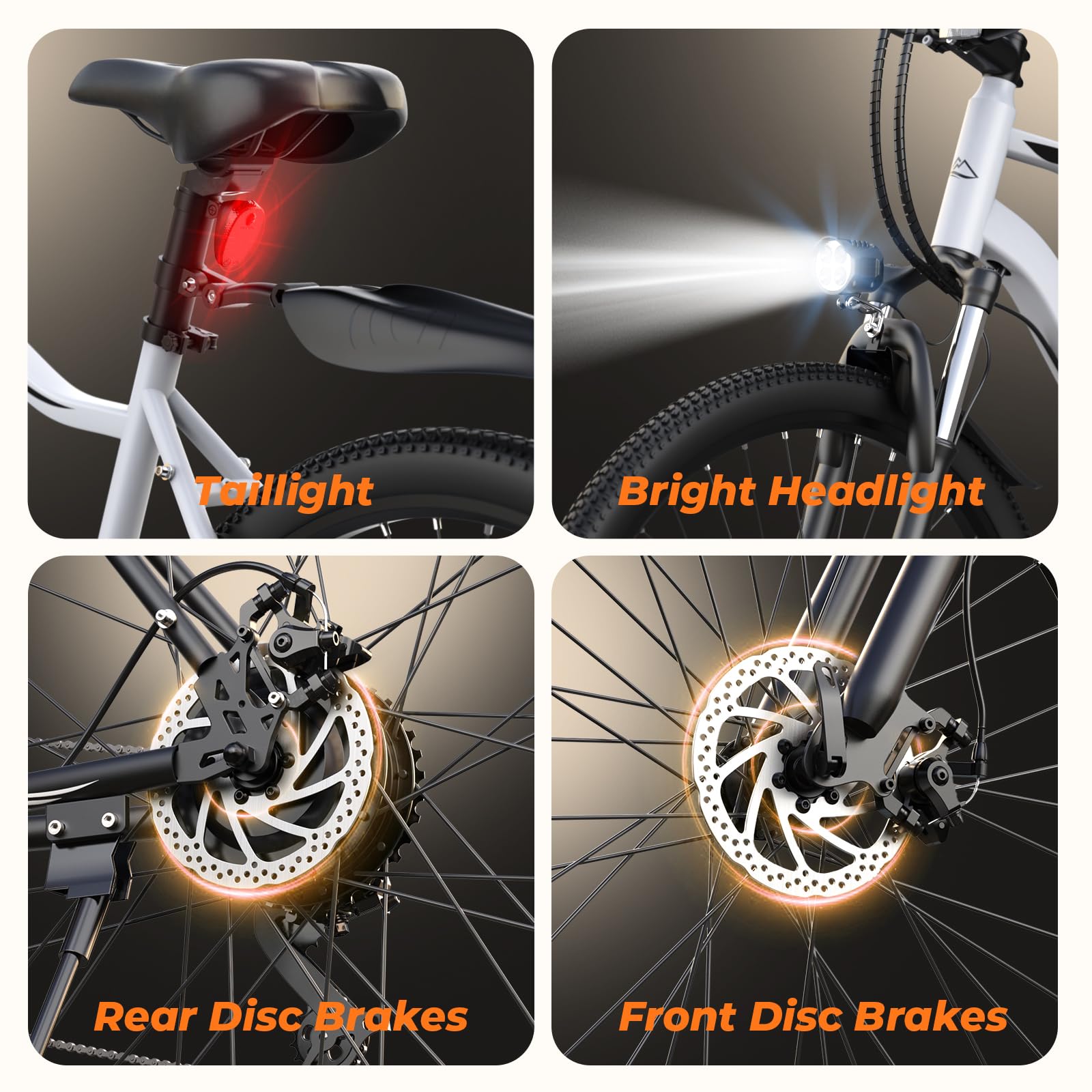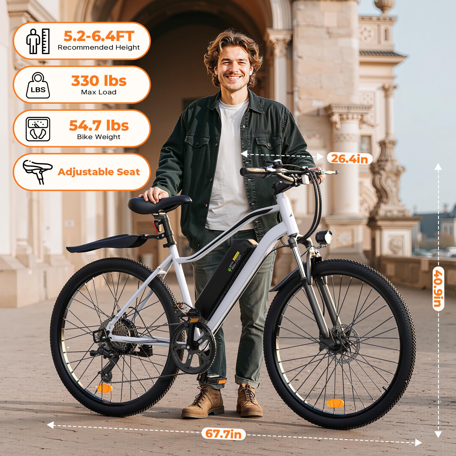 【Comfortable Ride】The bright white frame enhances visibility, complemented by integrated LED headlights and a taillight for after-dark safety. Includes front reflectors and fenders for extra protection and peace of mind. The ebike has a max load of 330 lbs.