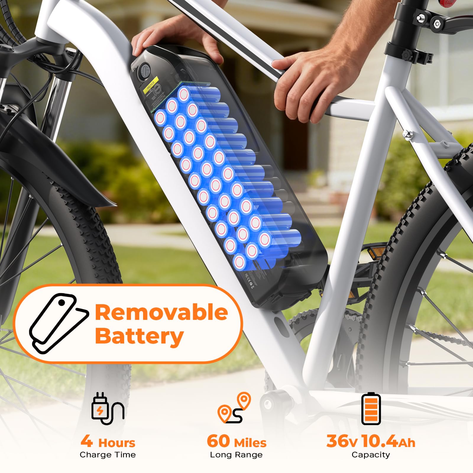 【Power Style】This e-bike is powerful 750W peak motor generates 65 Nm of torque, paired with a smooth 7-speed gear system that supports speeds up to 20 MPH. Powered by a high-capacity 36V 10.4Ah battery, The charging time is 4h and the max driving range is over 60 miles.. 5 speed modes (10/12/15/18/20 MPH) to match your riding style and terrain.