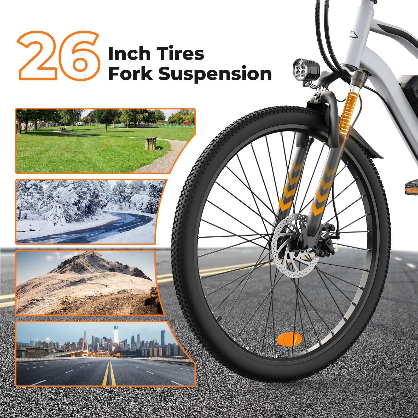 【26" Riding Experience】Equipped with sturdy 26" tires, this e-bike offers superior stability and grip on diverse terrains. A front suspension fork smooths out bumps, while mechanical dual disc brakes ensure crisp, dependable stopping power—perfect for daily commutes and weekend adventures.