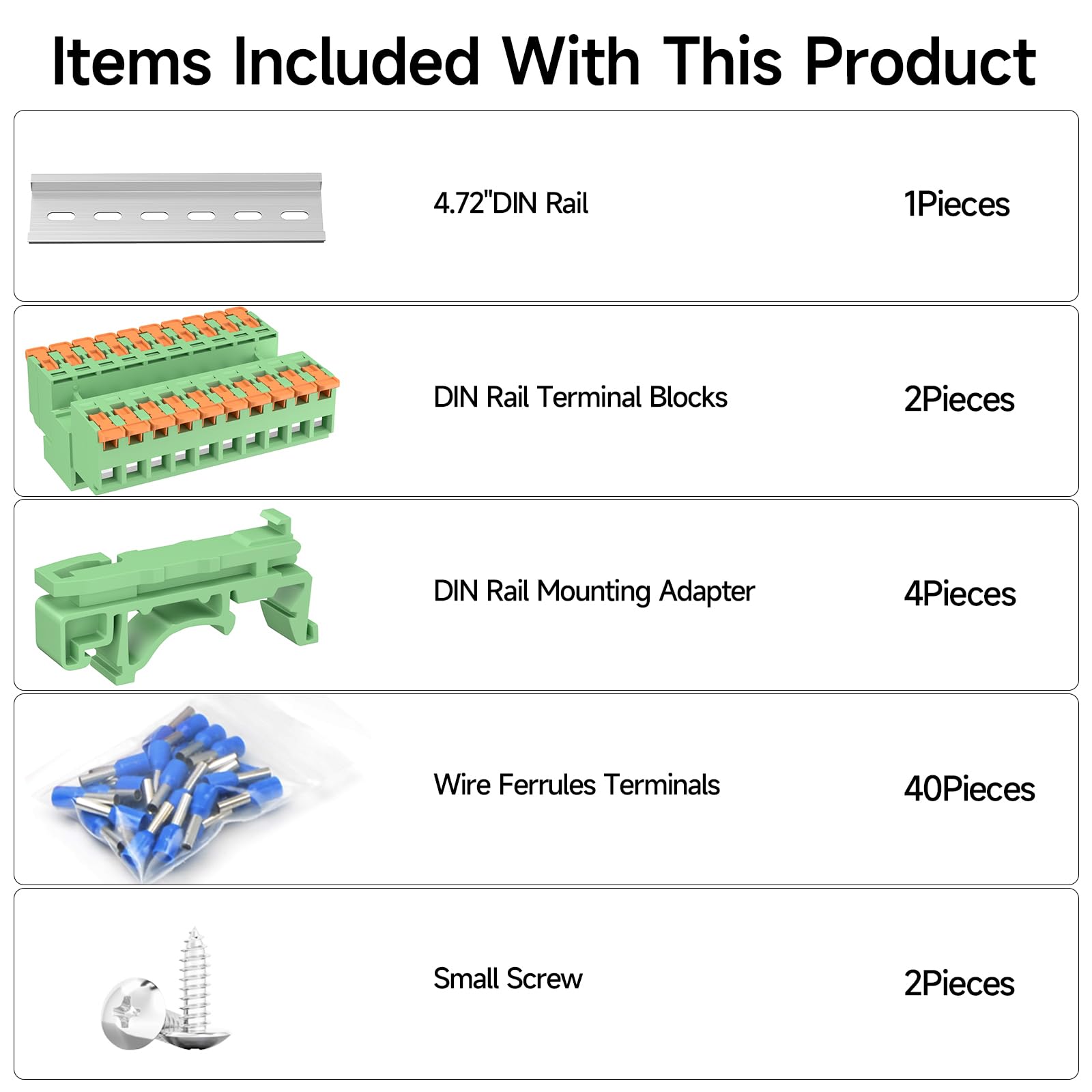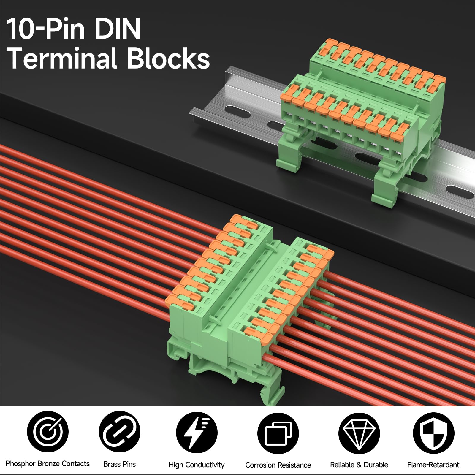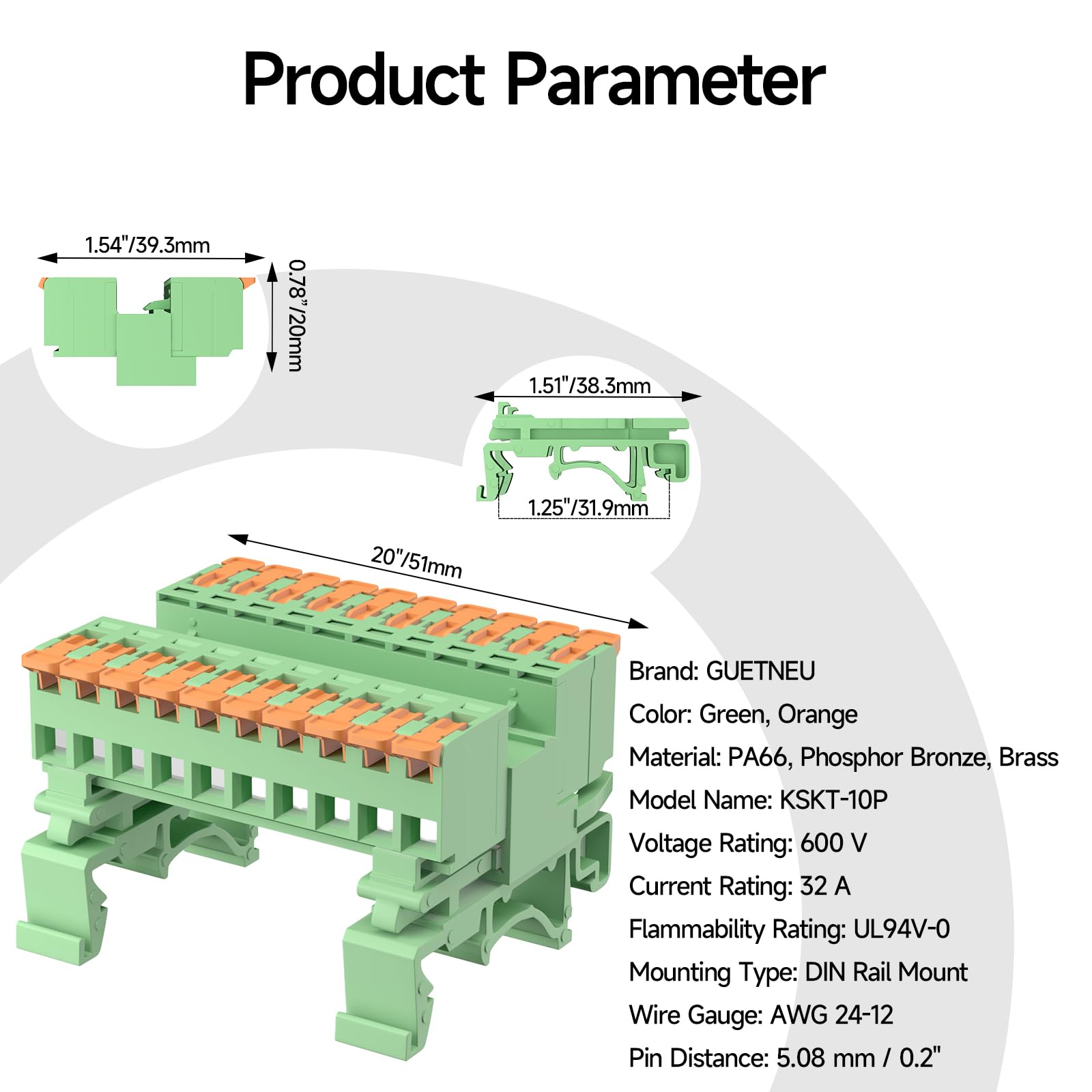 Product Parameters: Brand: GUETNEU Color: Green, Orange Material: PA66, Phosphor Bronze, Brass Model Name: KSKT-10P Voltage Rating: 600 V Current Rating: 32 A Flammability Rating: UL94V-0 Mounting Type: DIN Rail Mount Wire Gauge: AWG 24-12 Pin Distance: 5.08 mm / 0.2" Package Includes: 2 DIN Rail Terminal Blocks, 4 DIN Rail Mounting Adapter, 40Pcs Wire Ferrules Terminals, 4.72 Inch DIN Rail, 2 Screws
