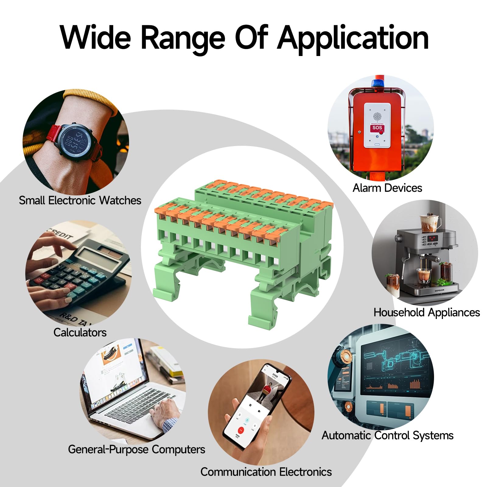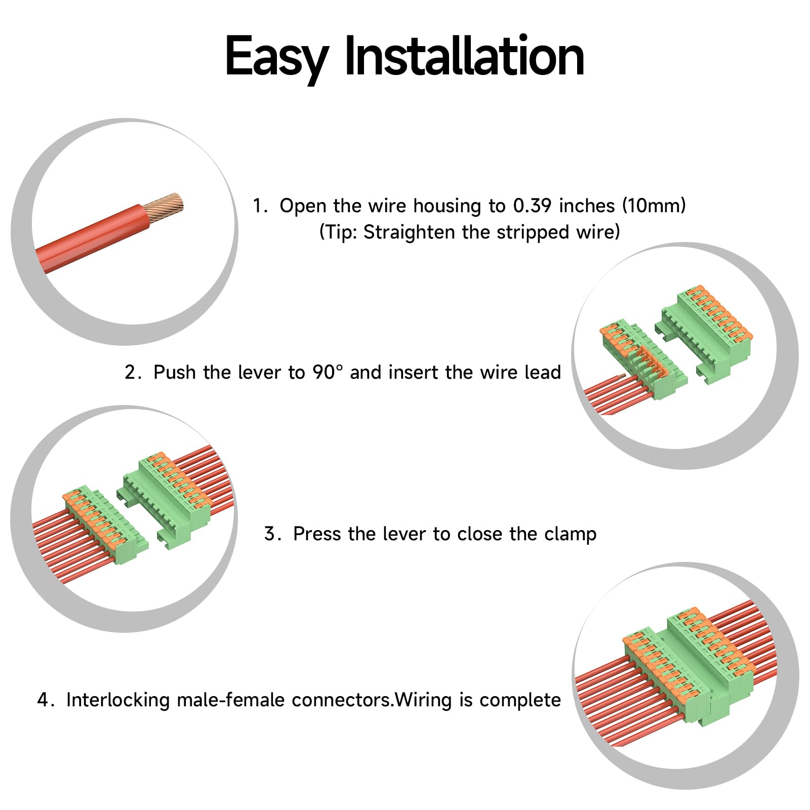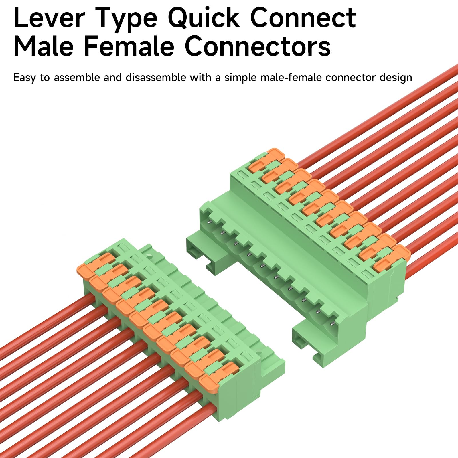 Fast, Simple, Efficient: Pluggable male-female connection, requiring no screwdriver or welding, allowing for quick wiring; The hook shape and latch design of the mounting feet perfectly accommodate this terminal and DIN Rail, enabling fast installation and removal, with a secure fit that is not easily dislodged