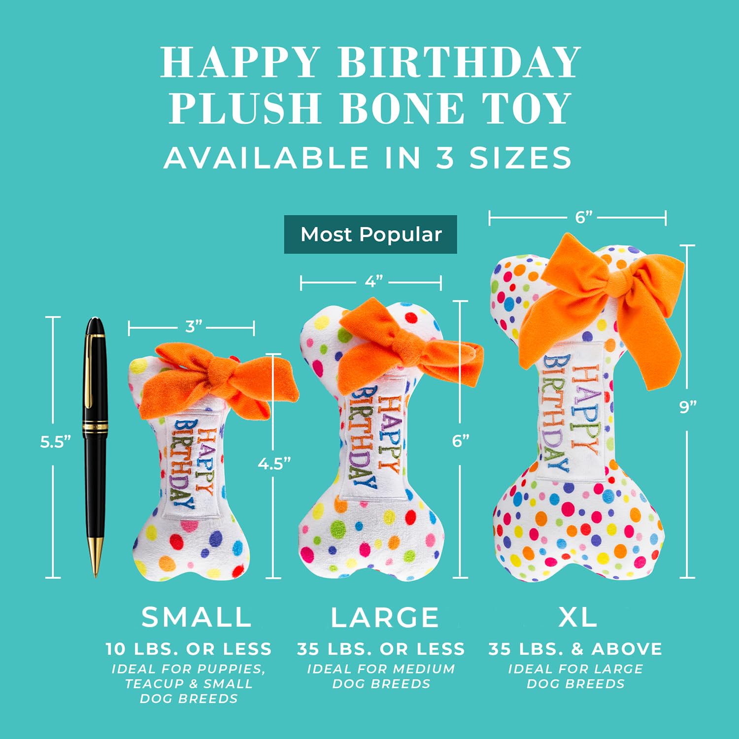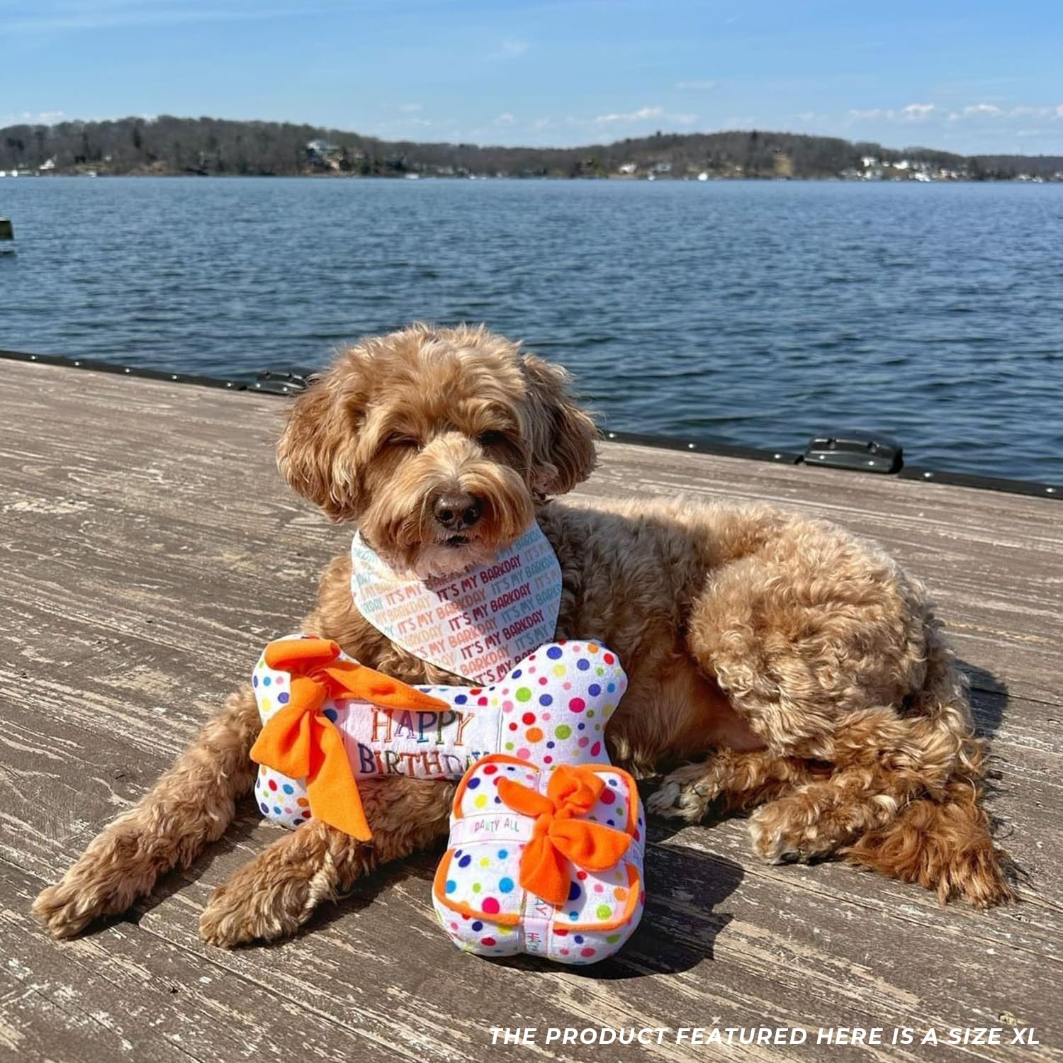 Funny Parody Plush Dog Toy: Treat your beloved furry friend to our Birthday Bone plush toy! Adorned with a cheerful orange bow and vibrant polka dots, this toy also has a hidden squeaker inside for added fun. The front features embroidered accents that read "Happy Birthday," while the back reads "Pawty All The Time". It’s a playful, cute interactive dog toy that combines style & fun. Our XL size features a durable fuse mesh lining that is suitable for aggressive chewers. Size XL 9"x6"x1.5".