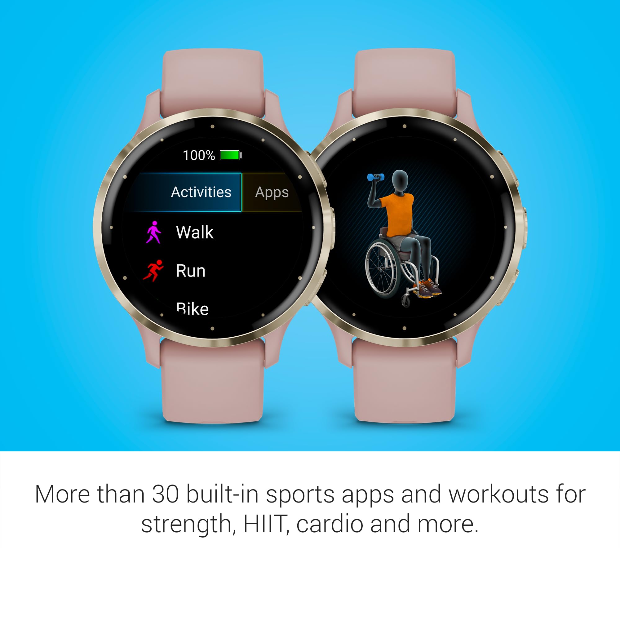 Know the real you with the Venu® 3S smartwatch, the ultimate on-wrist coach designed to support your goals — whatever they may be. Featuring a bright, colorful display and up to 10 days of battery life, this smaller-sized GPS smartwatch is purpose-built with advanced health and fitness features to help you better understand your body. Body Battery™ energy monitoring helps you keep your energy levels in check with personalized insights based on sleep, naps, stress, workouts and more. Improve the quality of your sleep with personalized sleep coaching and nap detection plus even more details such as HRV status (data presented is intended to be a close estimation of metrics tracked). During the day, switch up your activities with animated workouts and more than 30 built-in sports apps — including for active wheelchair users — plus advanced training features to keep you going strong. With its built-in speaker and microphone, the Venu 3S smartwatch makes it easy to make and take calls right from your wrist when paired to your smartphone — and even reply to texts by using your phone’s voice assistant. Plus, enjoy connectivity features such as music storage, Garmin Pay™ contactless payments (with a supported country and payment network) and more.