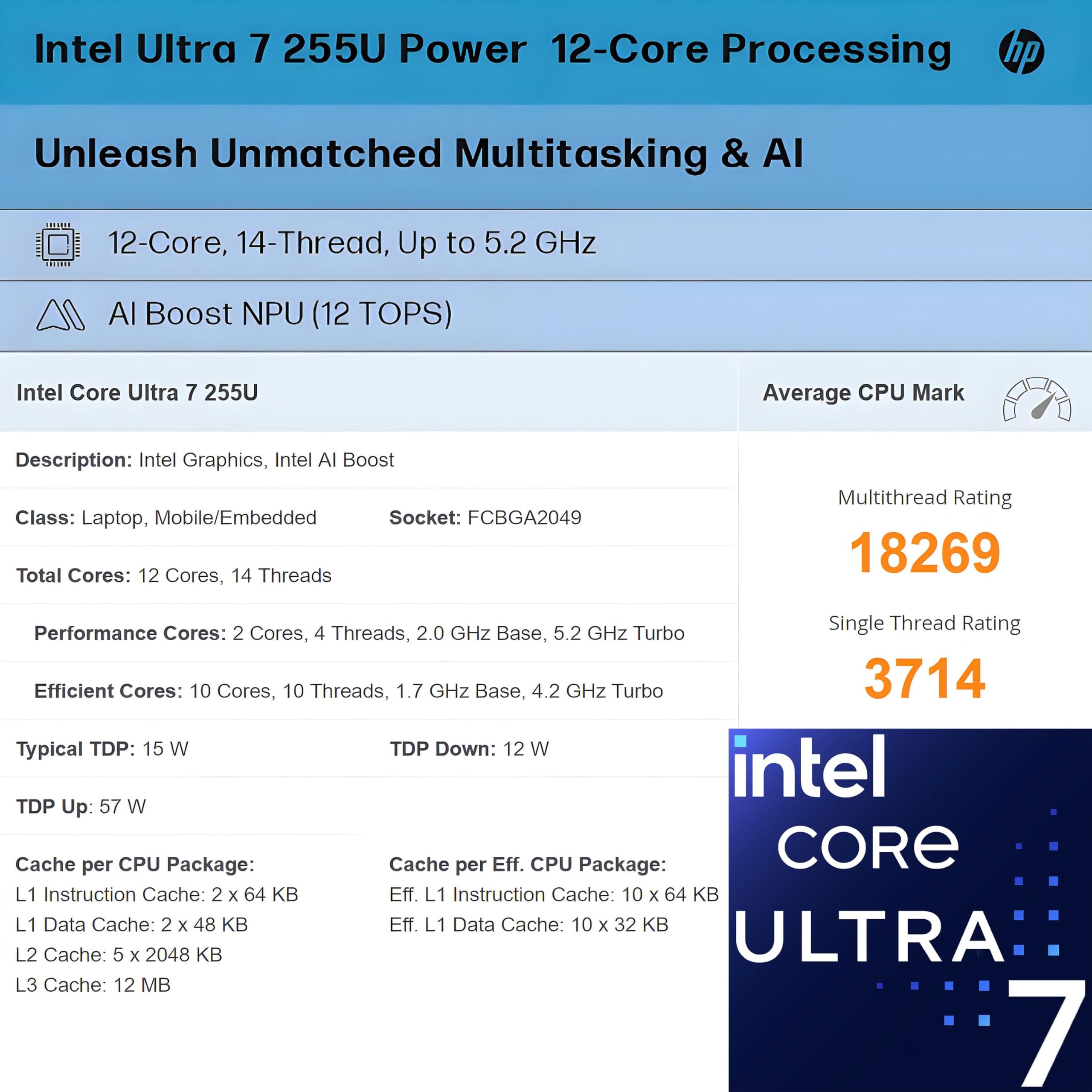 HP Elitebook 660 G11 CPU: Intel Core Ultra 7 155U, 12C (2P + 8E + 2LPE) / 14T, Max Turbo up to 4.8GHz, 12MB. This 1st Gen Core Ultra processor has come to replace 13th generation Core processors; it has 12 cores (2 + 8 + 2) and 14 threads at its disposal. Its Performance cores, of which there are 2, are HT-enabled and run at up to 4.8 GHz while its Efficient cores, of which there are 10 (8 main cores plus 2 extra ones found in the Low Power Island) run at up to 3.8 GHz.