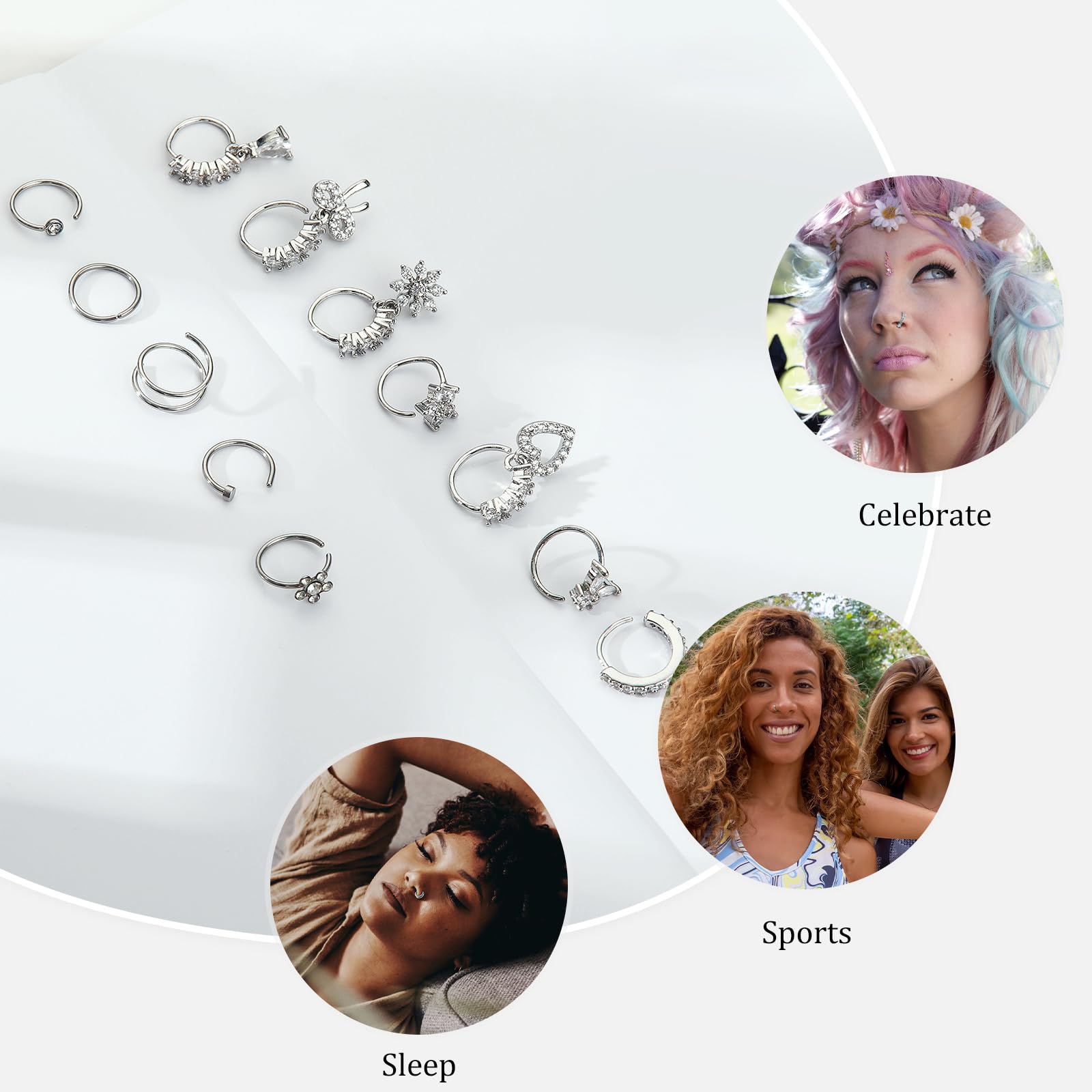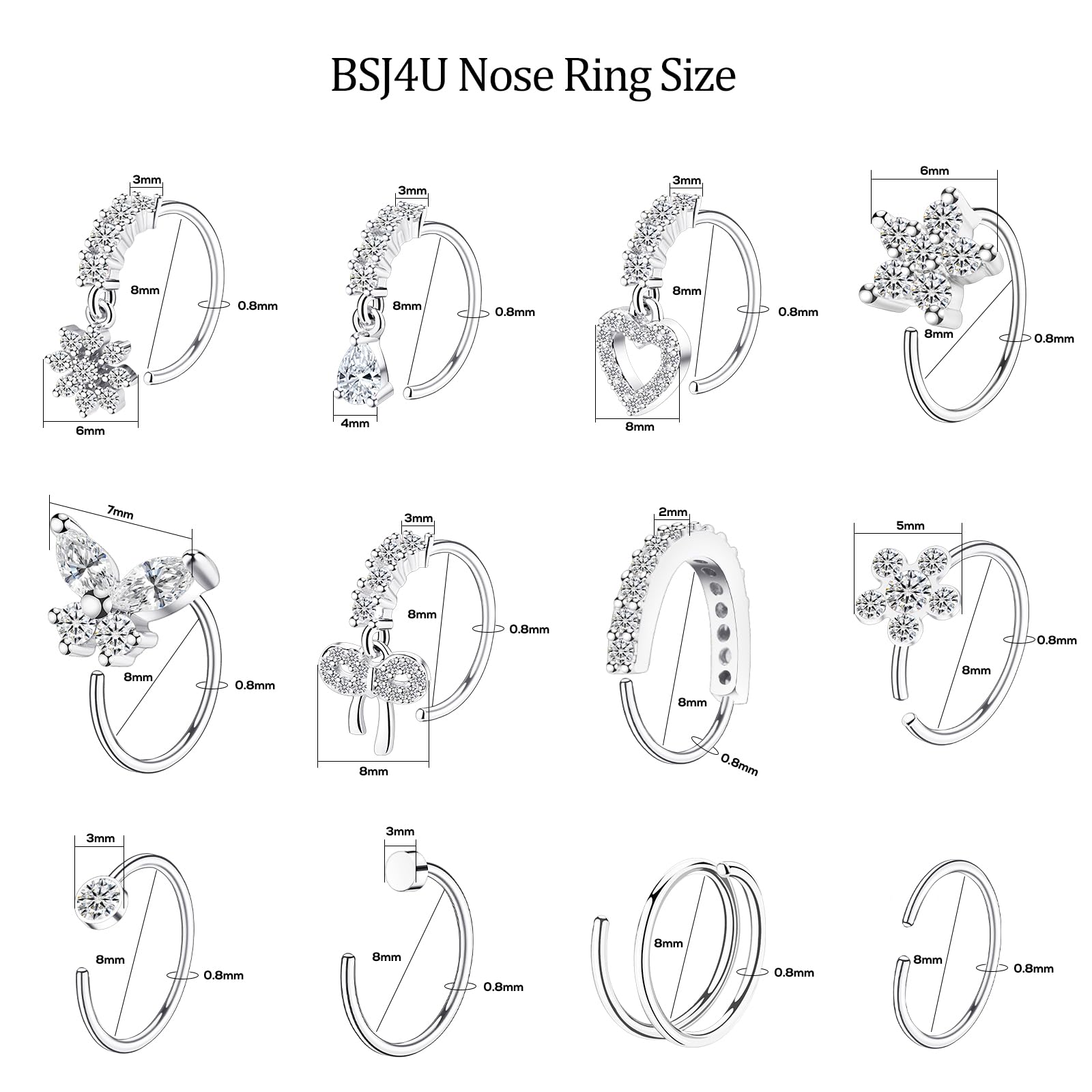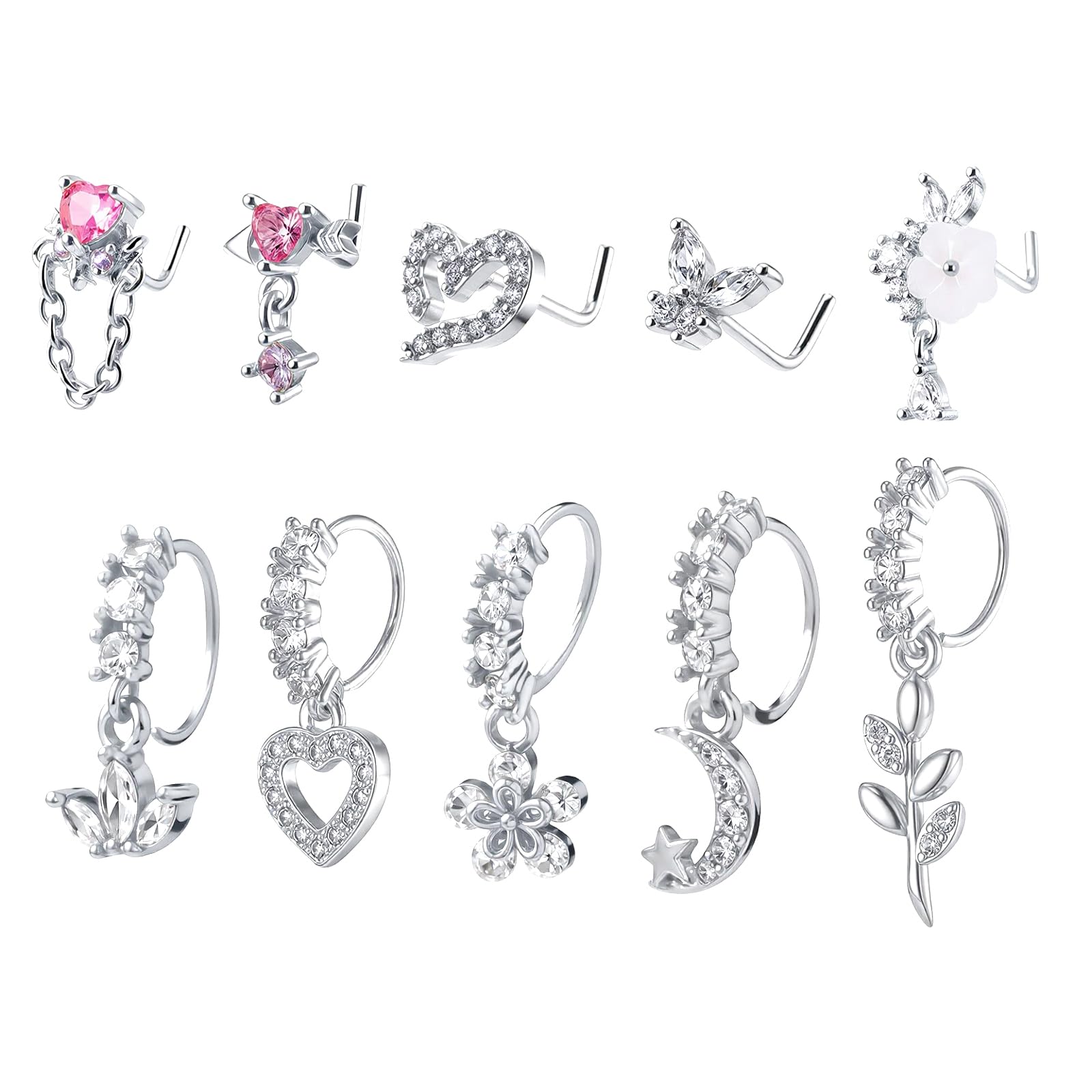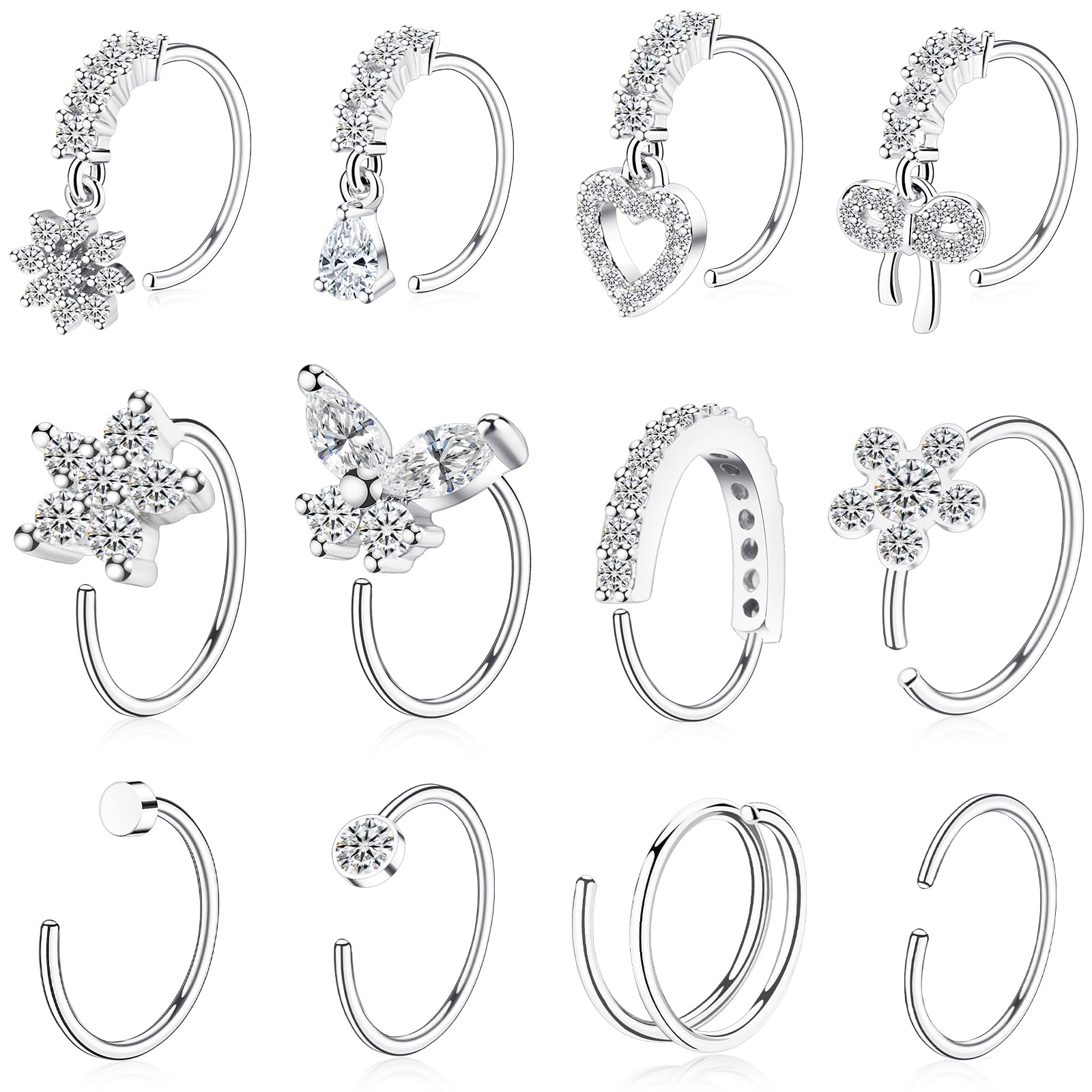 Nose Ring Pack: Nose ring set includes 12pcs silver nose rings hoops, heart nose ring, butterfly nose ring, flower nose ring, bow nose ring, double hoop nose ring, etc, perfect for everyday wear, mixing & matching to suit any mood or occasion
