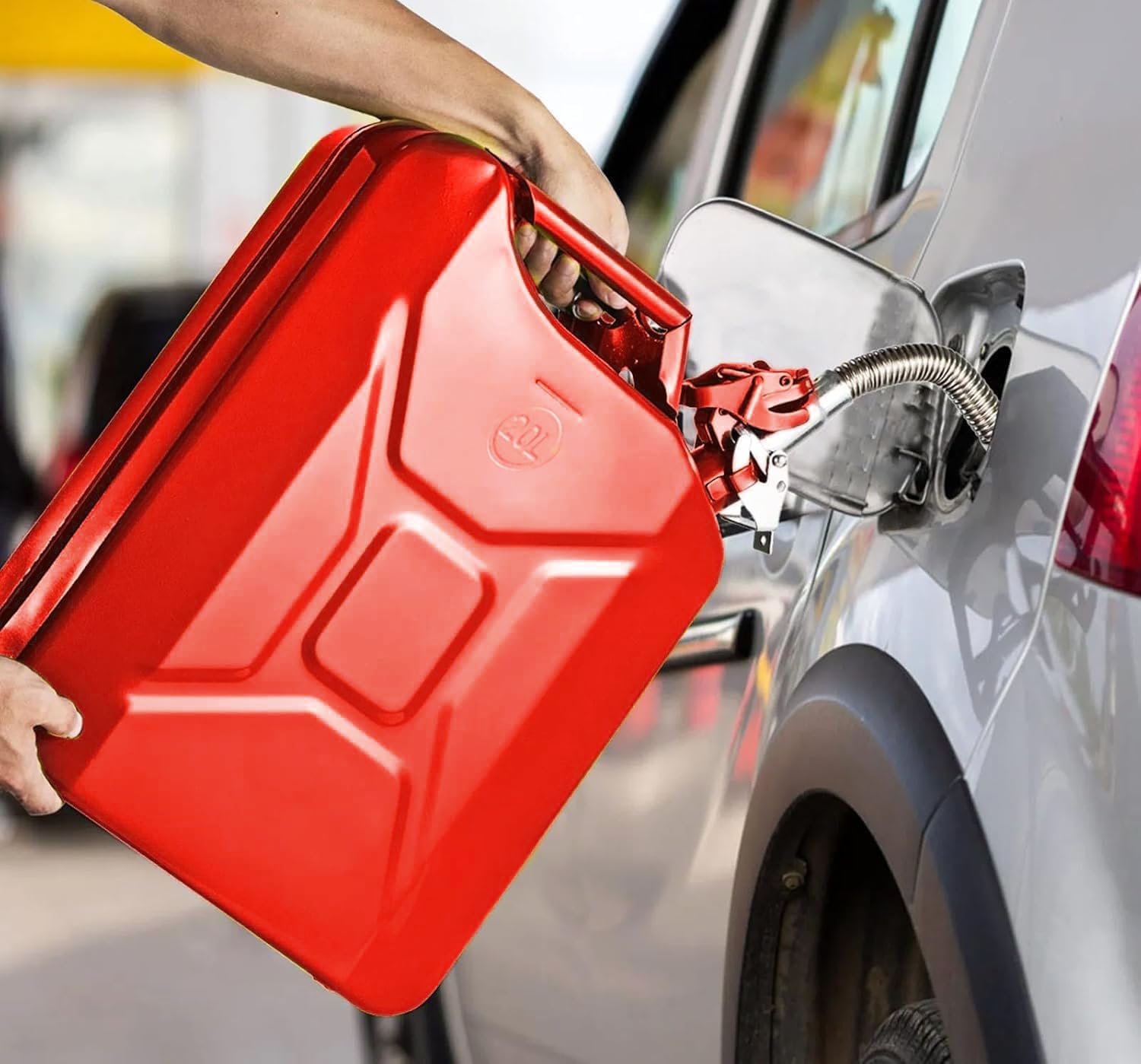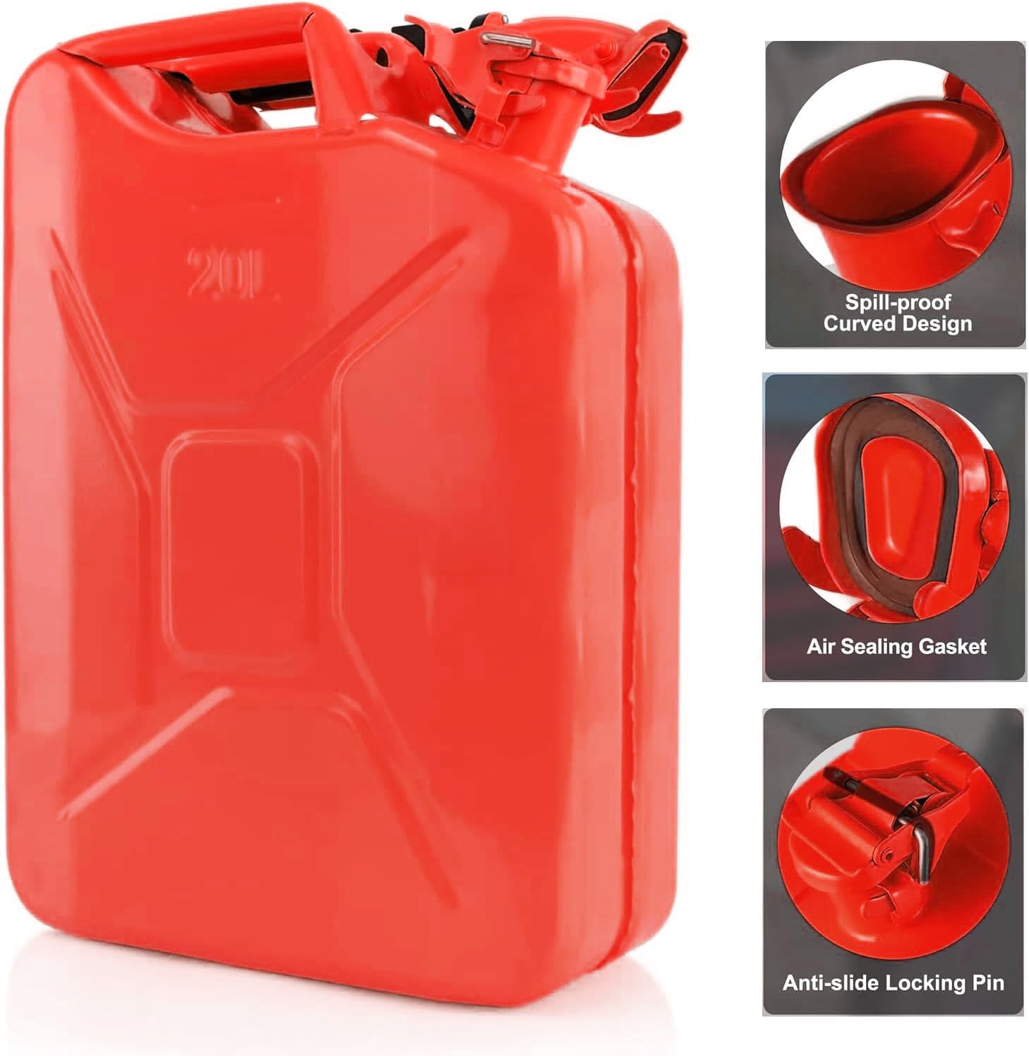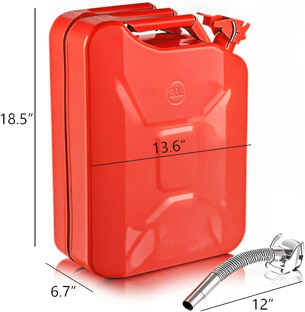 Specifications Material: 0.8mm Cold-Rolled Steel Capacity: 5.3 Gallons / 20L Color: Green/Red Weight: 6.4 lbs Dimensions: 13.68"L x 6.70"W x 18.5"H Package Contents 1 x 5 Gallon Jerry 1 x Stainless Spout 1 x Instruction Manual