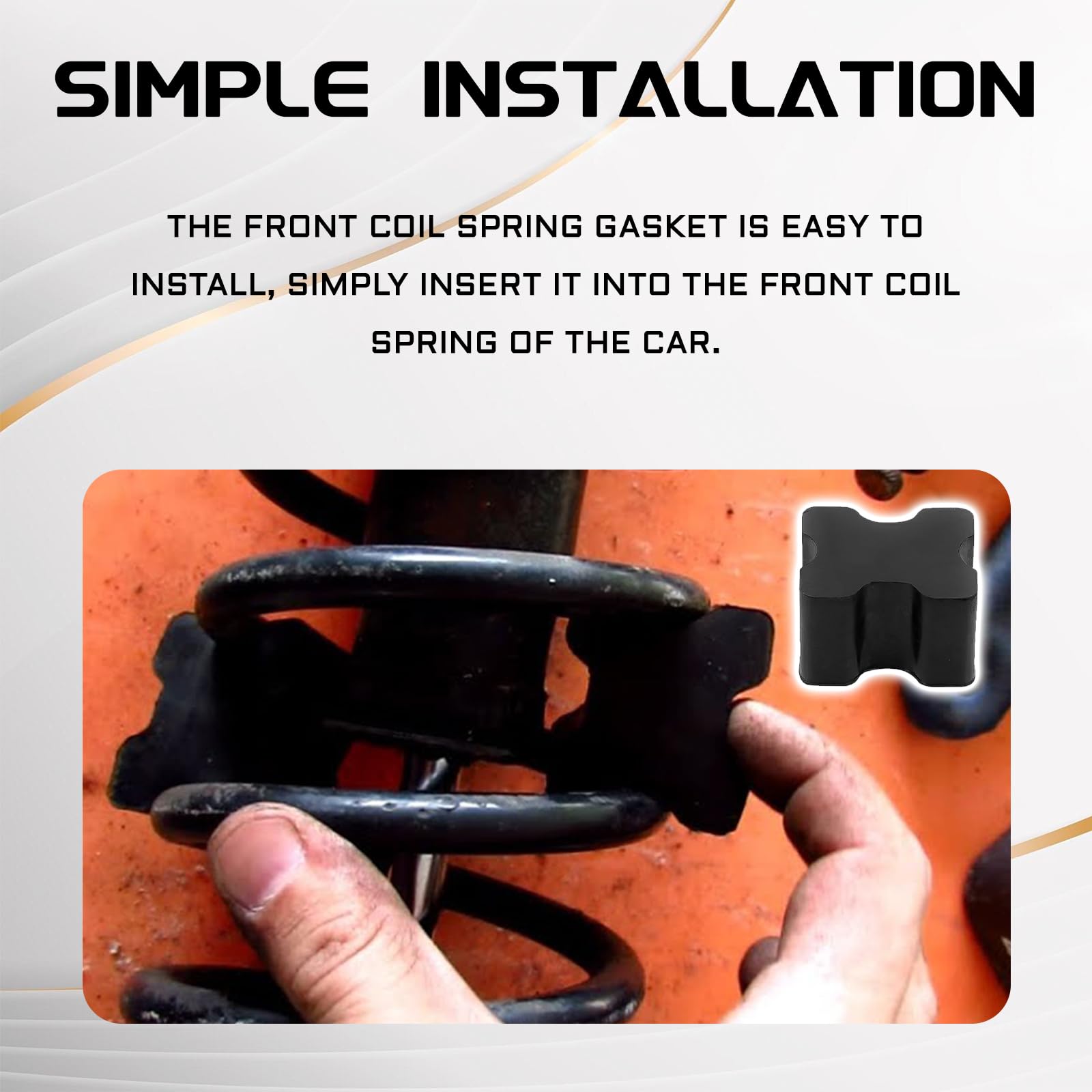 【Easy to Install】This heavy duty rubber car coil spring booster is easy and quick to install. Just insert it into the front coil spring of the car and it will fit tightly after installation. Tips: Due to different car models, a spring compression tool may be required to leave enough space between the coils to ensure that the gasket can be perfectly embedded between the spring and the mounting part
