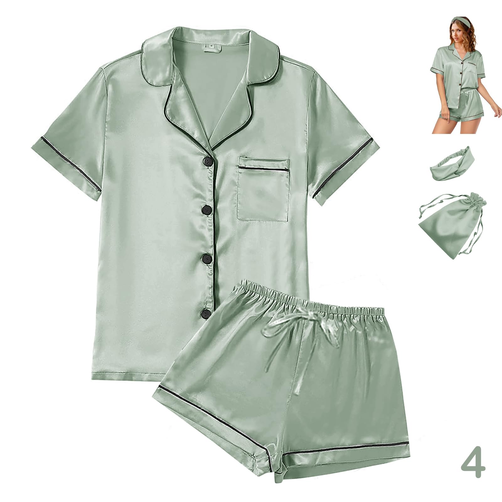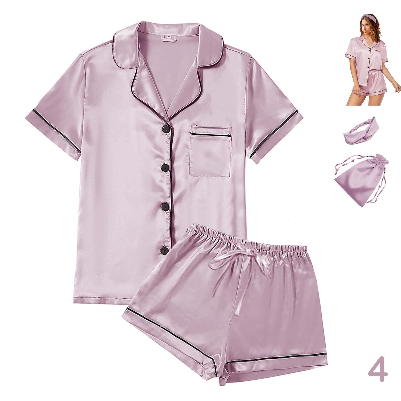 Perfect Combination-PLEASE NOTE the package contains:1xShort Sleeves Top, 1xShorts,1xHeadband, 1xPouch Bag =TOTAL 4PCS PER PACK. “W” = Piping in WHITE; “B” = Piping in BLACK. "A04"=Floral Pattern1.Also 8 SIZE RANGES: XS-S-M-L-XL-XXL-3XL-4XL.Please check carefully before order! This Womens Satin Pajama set shorts silk pajamas sets Pjs set sleepwear Pj sets Loungewear with headband + Pouch Bag has sufficient quantity and elegant soft quality to satisfy the needs of you.