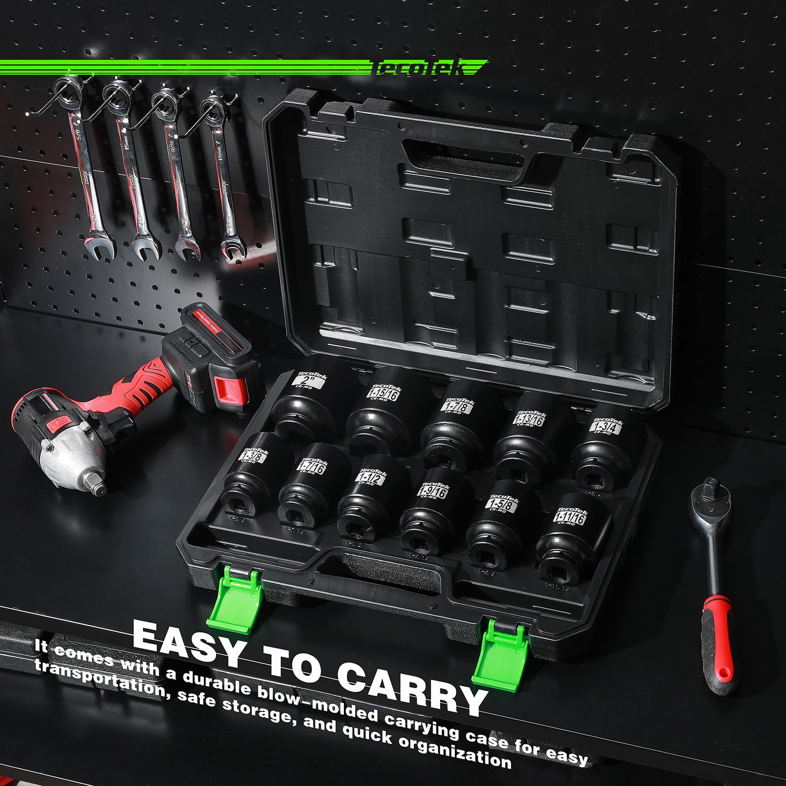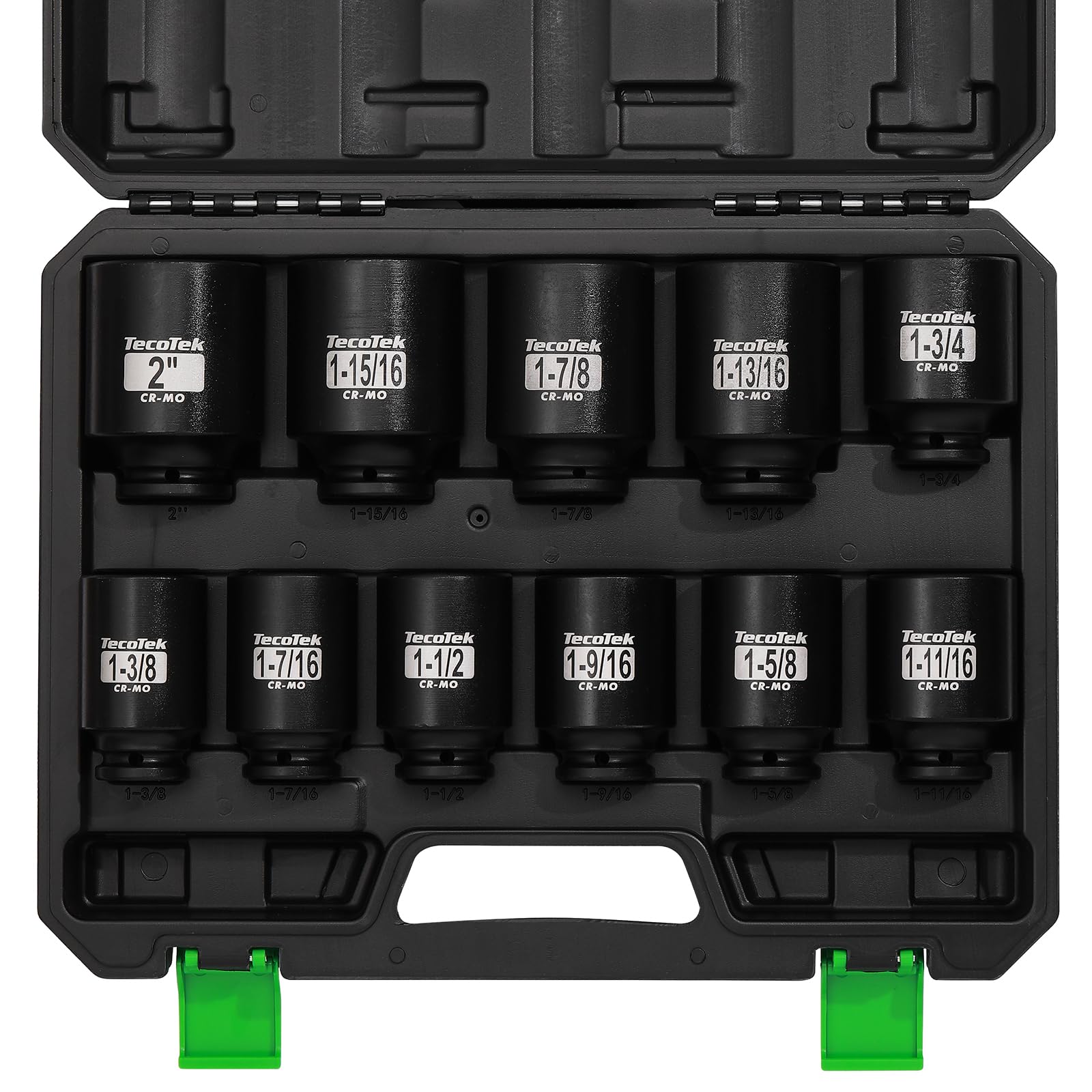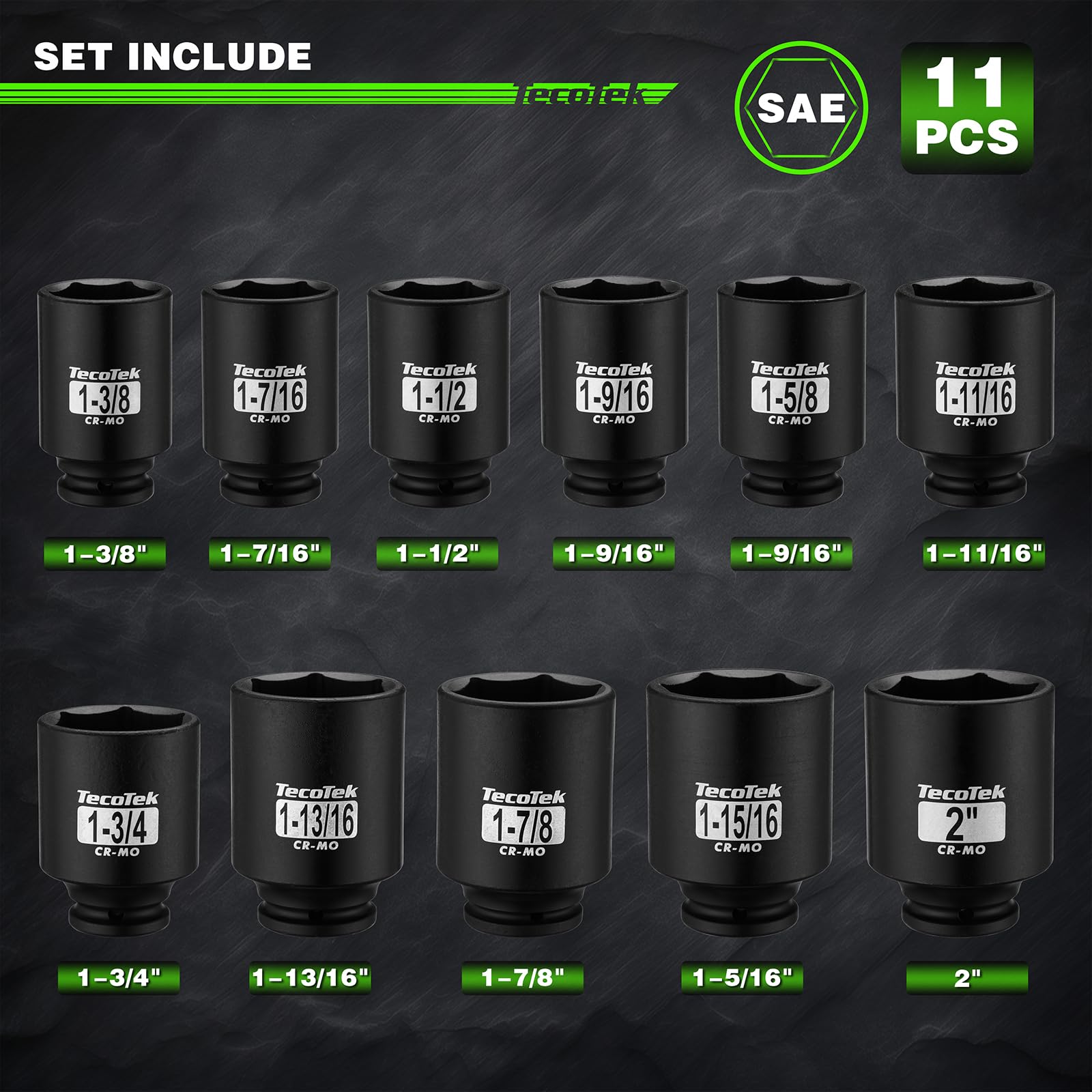 ✅【SET INCLUDES】11-Piece 6-Point Deep SAE: 1-3/8", 1-7/16",1-1/2",1-9/16",1-5/8", 1-11/16", 1-3/4", 1-13/16", 1-7/8", 1-15/16", 2". This 1/2" impact socket set is designed for use with impact wrenches, each socket is used to remove tough nuts and bolts on larger vehicles.