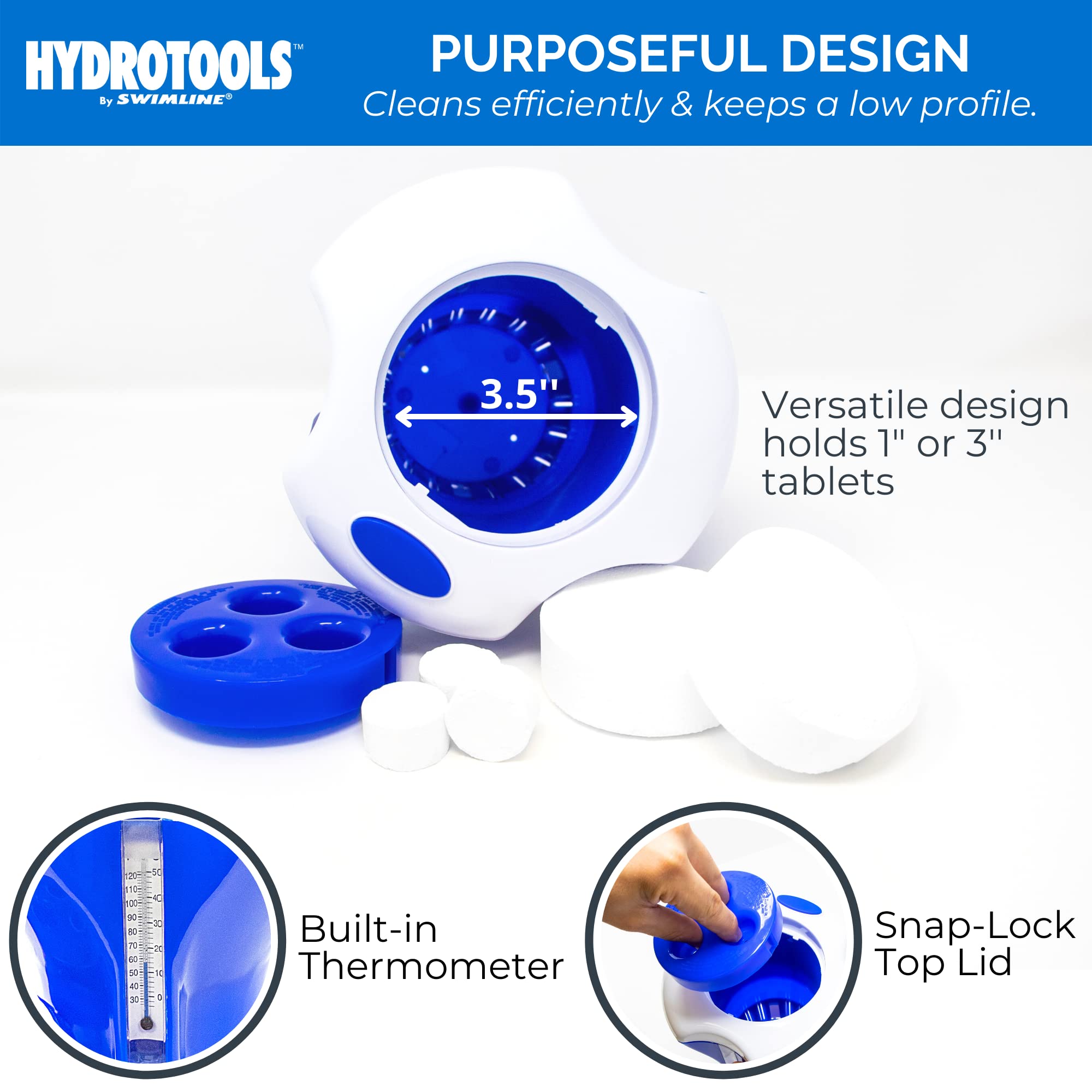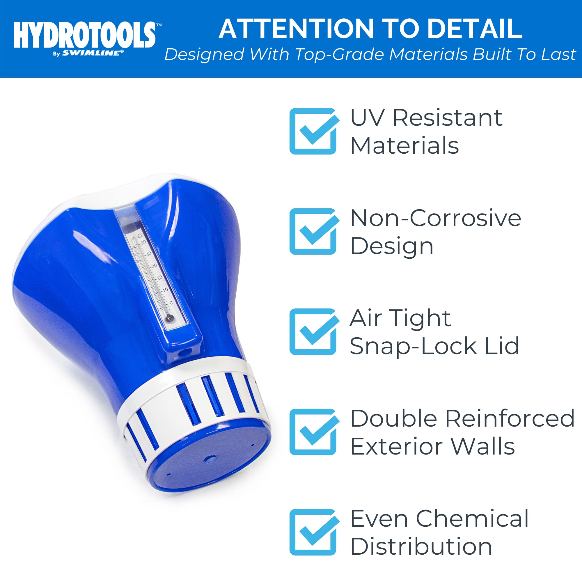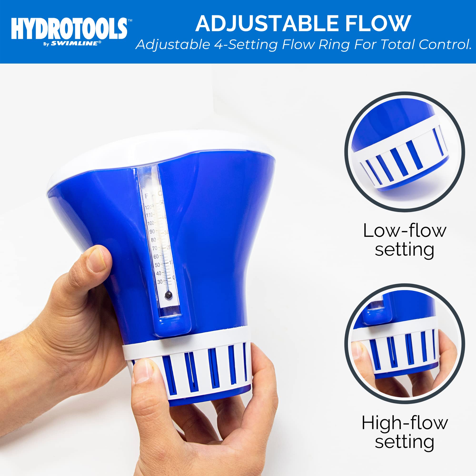 Introducing the Hydrotools By Swimline original line of floating pool chemical dispensers - the ultimate solution for maintaining sparkling clean and healthy pools and spas! With our high-quality dispensers, you can effortlessly keep your pool or spa clean and well-maintained, without having to worry about chemical imbalances or frequent refills. Our dispensers are incredibly easy to use. Simply load them with chlorine or bromine tablets, and they will float in your pool or spa, maintaining consistent chemical levels and ensuring crystal clear water. The adjustable flow rate allows you to customize the dispenser to suit the specific needs of your pool or spa, ensuring optimal chemical balance and water quality. Made with durable materials, our dispensers can resist the harsh chemicals used in pools and spas, and will not become damaged or corroded over time. The generous capacity of our dispensers means that they can accommodate multiple tablets, reducing the need for frequent refills and allowing you to enjoy your pool or spa without interruption. Our dispensers are compatible with most chlorine and bromine tablets, and can be used with various pool and spa types, making them highly versatile and suitable for a wide range of applications. Whether you have an in-ground or above-ground pool, a hot tub, or a spa, our dispensers can help you maintain optimal chemical balance and water quality. Hydrotools dispensers are also highly cost-effective. By helping to prolong the life of your pool or spa equipment, our dispensers reduce the need for costly chemical adjustments, making them an excellent investment for any pool or spa owner. With Hydrotools equipment, you can say goodbye to the hassle of maintaining your pool or spa, and enjoy crystal clear water and a healthy swimming environment.
