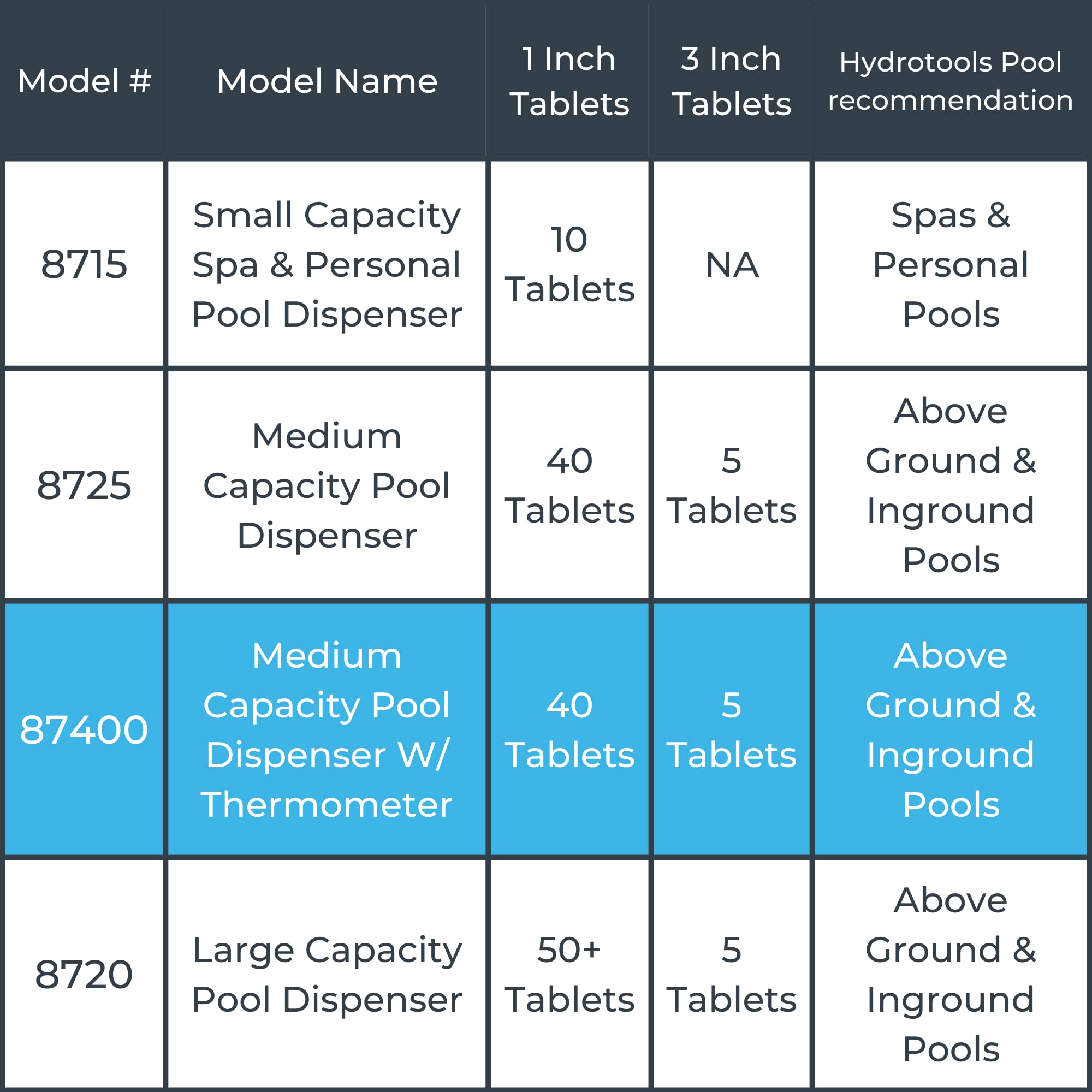 {LARGE CAPACITY}: The dispenser has a generous capacity, which means that it can accommodate multiple 1 and/or 3 inch tablets. This reduces the need for frequent refills, allowing you to spend more time enjoying and less time maintaining it.