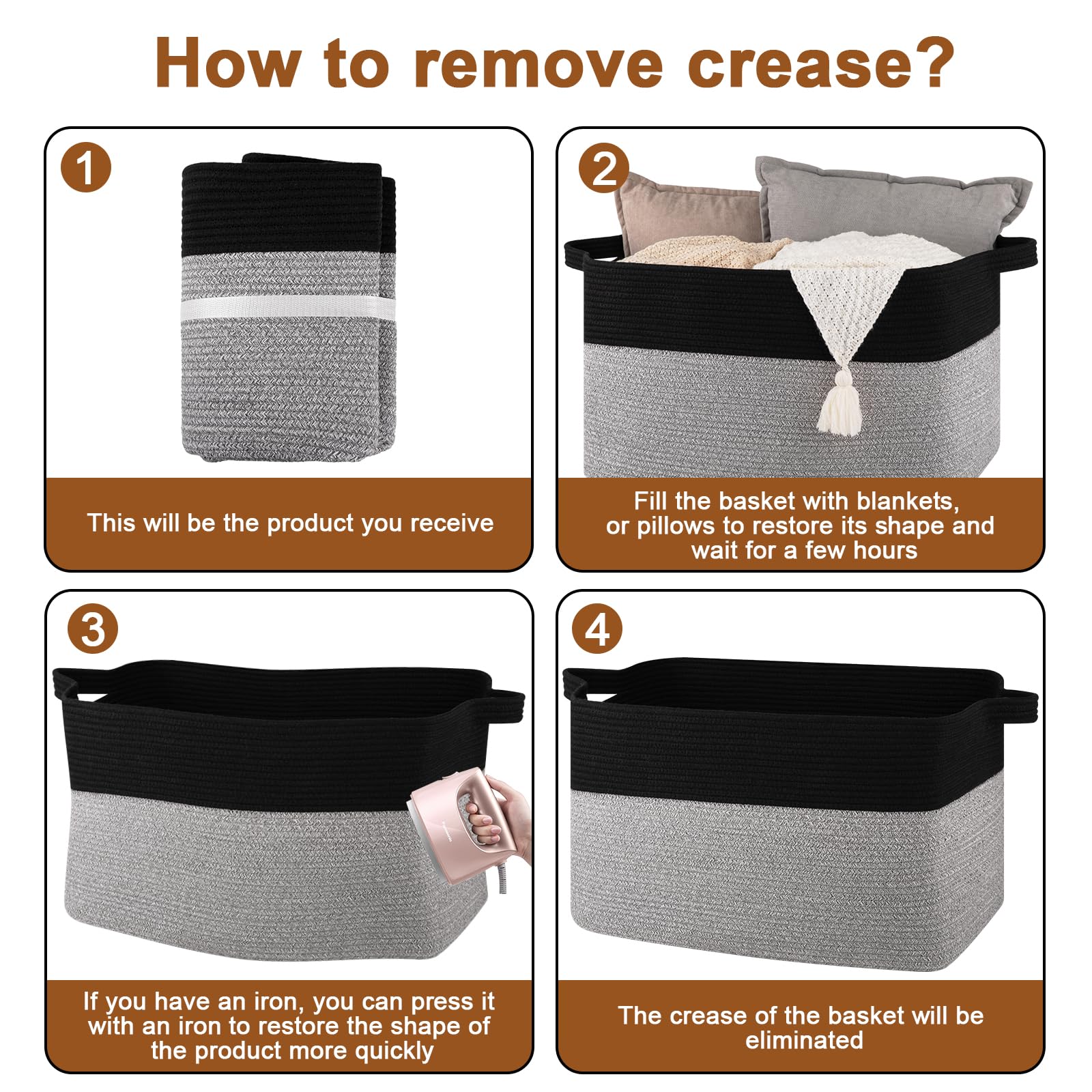 【Note】: The cotton rope basket is folded for shipping. Filling it up with towels or blankets could help it return to its best shape. Fast smoothing the creases by ironing them. The blanket basket is hand and machine-washable. It's built for long-term use