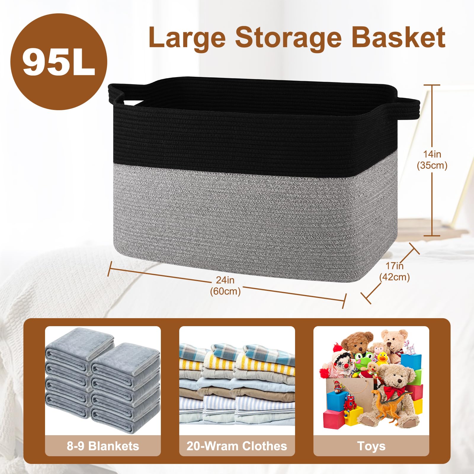 【MULTIPLE USE BASKETS】: The size of our large basket is 24"x16.9"x14.2". Perfect-size for a laundry basket to fit dirty clothes.They can also be used for storing pillows and blankets in the bedroom and the living room. Even as a storage basket for child's room to hold kids toys or stuffed animals