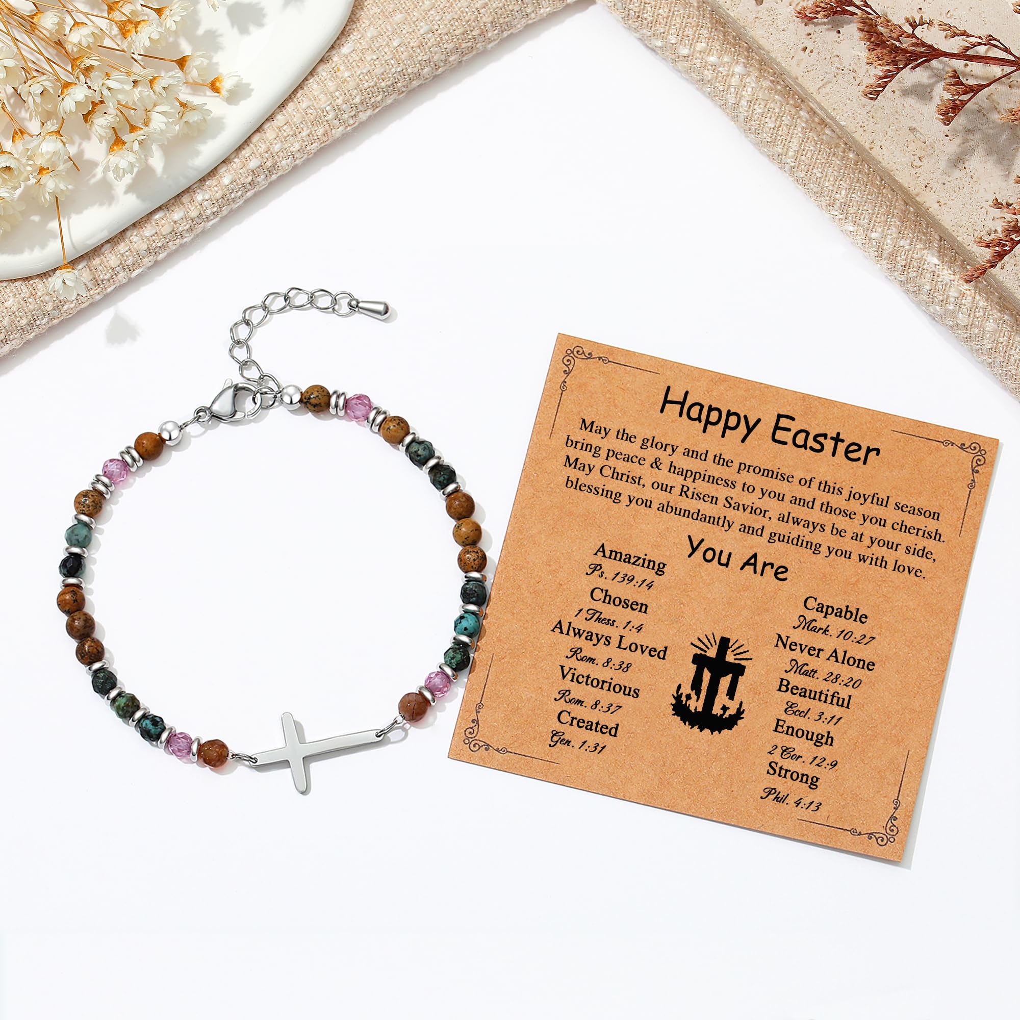 【 Adjustable Size 】Crafted for comfort and durability, this 7.4" beaded cross bracelet for women features a 1.5" extension chain for an adjustable fit (6.5"-8" wrists). The stones offer symbolic meaning while the cross adds spiritual protection—a beautiful blend of faith and craftsmanship in this essential piece of faith jewelry.