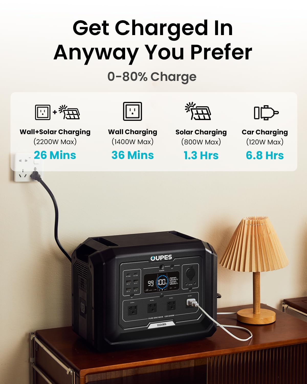 [Dual Charging] - Solar + AC simultaneous input for 2200W max charging speed.
