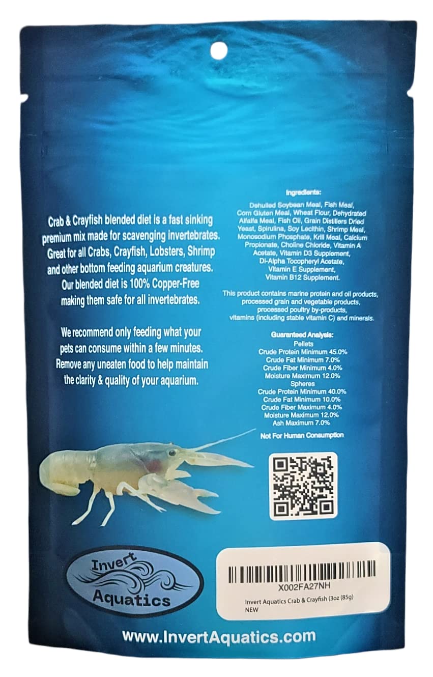 Crab & Crayfish Sinking Blended Diet is a Specially Formulated Diet made from Protein Packed Pellets and Growth Enhancing Sticks. Made with Spirulina and Added Vitamin E, D3 & B12! Great for Red Claw Crabs, Fiddler Crabs, Crayfish and Miniature Lobsters! Shrimp, Snails and other bottom feeders also love this Food! We recommend only feeding what your aquatic pets can eat within a few minutes. Remove any uneaten food to keep you aquarium water clean. Available in 1.5oz, 3oz & 9oz! Ingredients: Sticks - Dehulled Soybean Meal, Fish Meal, Corn Gluten Meal, Wheat Flour, Dehydrated Alfalfa Meal, Fish Oil, Grain Distillers Dried Yeast, Spirulina, Soy Lecithin, Shrimp Meal, Monosodium Phosphate, Krill Meal, Calcium Propionate, Choline Chloride, Vitamin A Acetate, Vitamin D3 Supplement, Dl-Alpha Tocopheryl Acetate, Vitamin E Supplement, Vitamin B12 Supplement. Pellets - This product contains marine protein and oil products, processed grain and vegetable products, processed poultry by-products, vitamins (including stable vitamin C) and minerals. Guaranteed Analysis: Sticks - Min Protein 45%, Min Fiber 4%, Min Fat 7%, Min Moisture 12%. Pellets - Crude Protein Minimum 40%, Crude Fat Minimum 10%, Crude Fiber Maximum 4.0%, Moisture Maximum 12%, Ash Maximum 7%