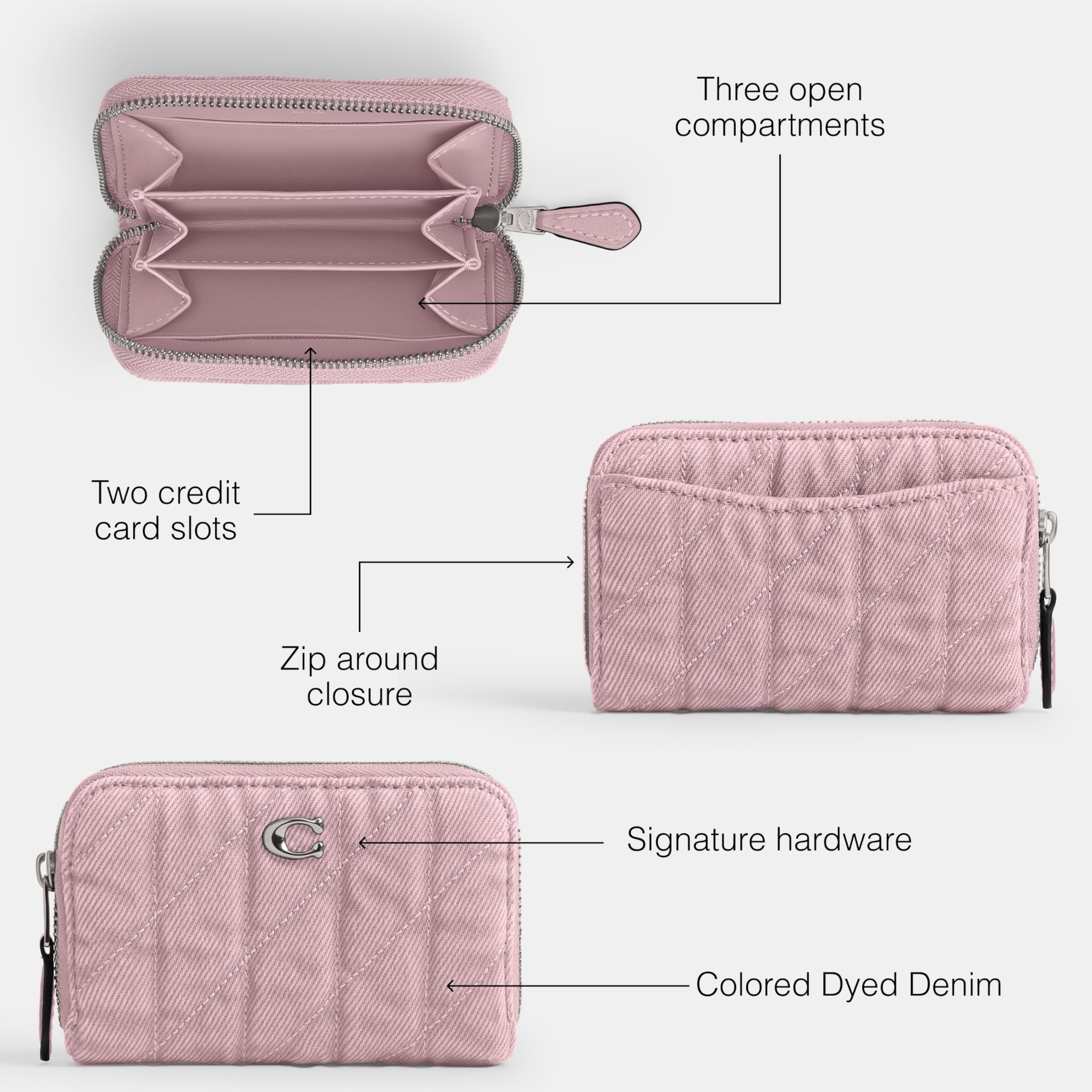 It's All in the Details: 2 credit card slots, 3 open compartments, zip around closure. 4 1/4" L x 2 3/4" H x 3/4" W