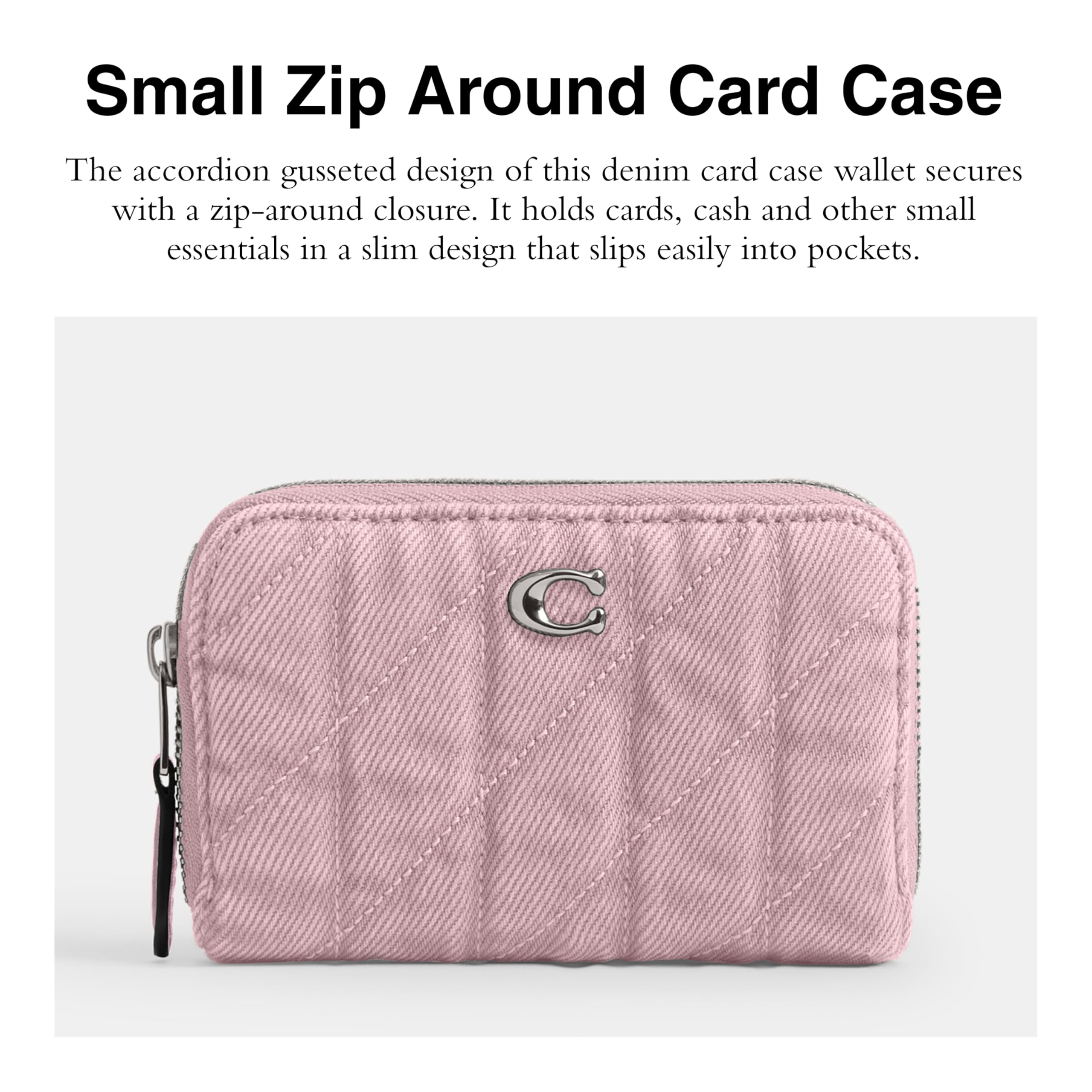 Description This front pocket wallet holds cards, cash and other small essentials in a slim design that slips easily into pockets. The accordion gusseted design of this denim card case wallet secures with a zip-around closure.