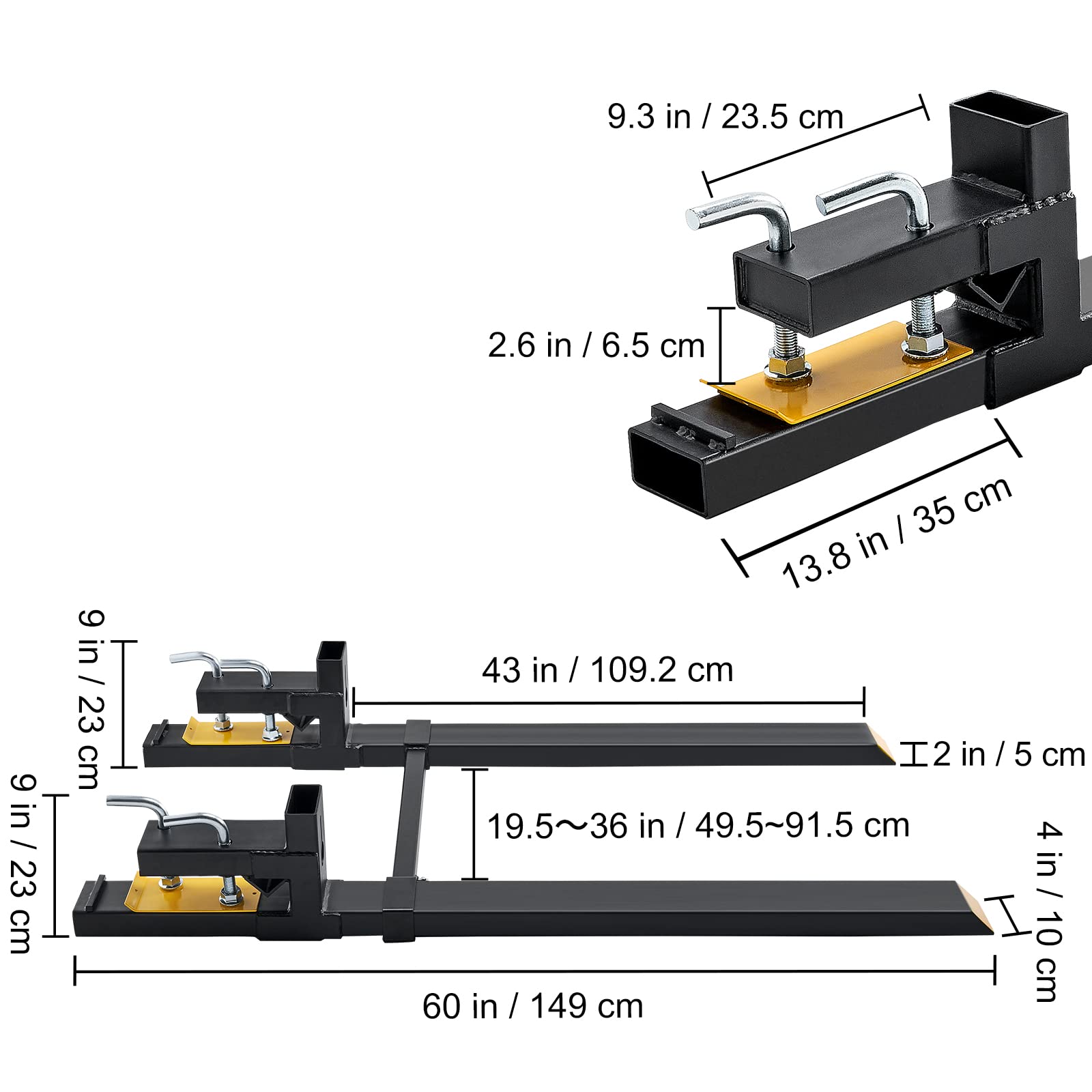 Compatible with Most Loaders: This pallet forks for tractor bucket is compatible with most tractor such as John Deere or Kubota Tractors. Overall Length: 60in. Fork Length: 43 in. Fork Width: 4 in. Fork height: 2 in. Lip Clearance: 2.6 in. Each package contains 2 x forks, 1 x stabilizer bar, and 1 x user manual.