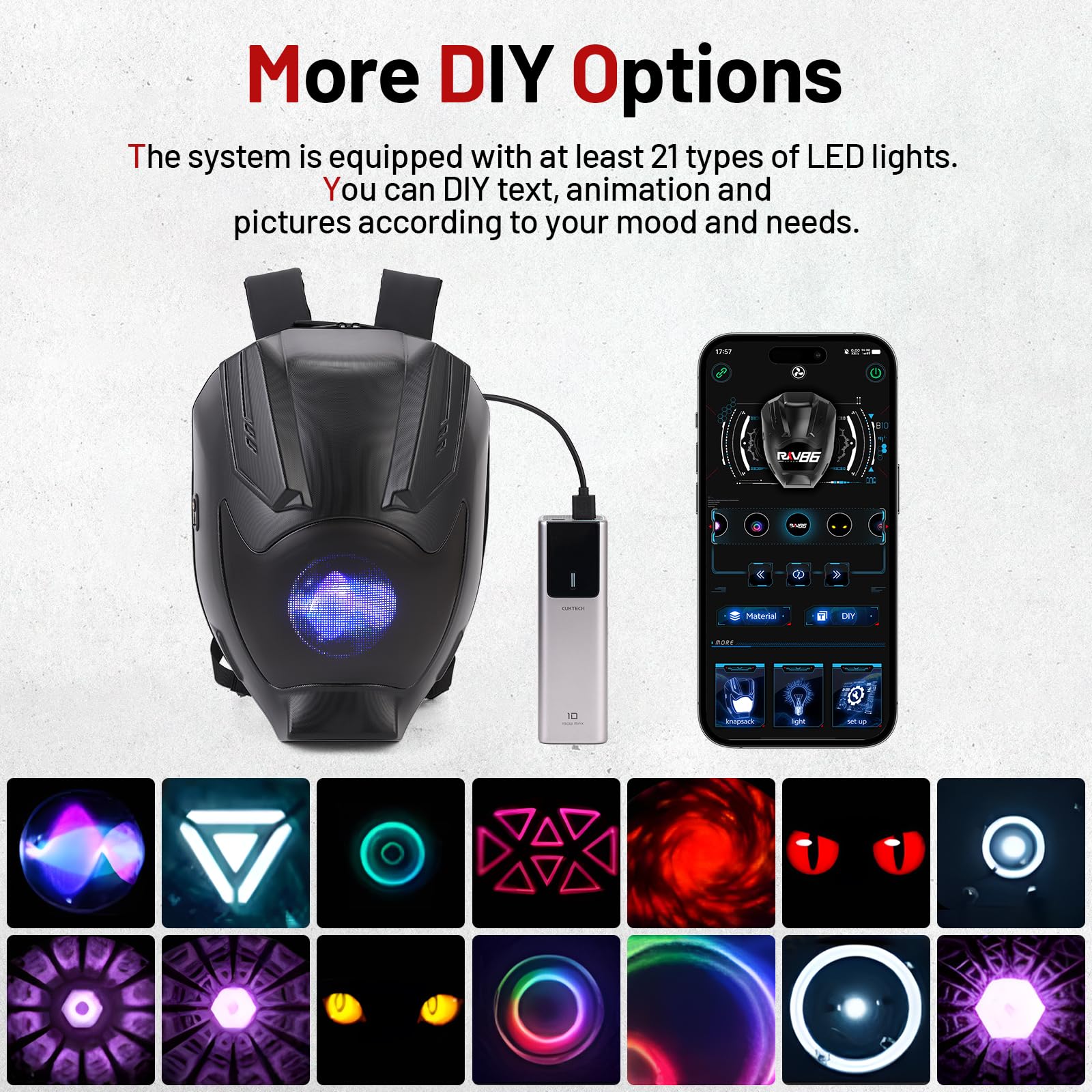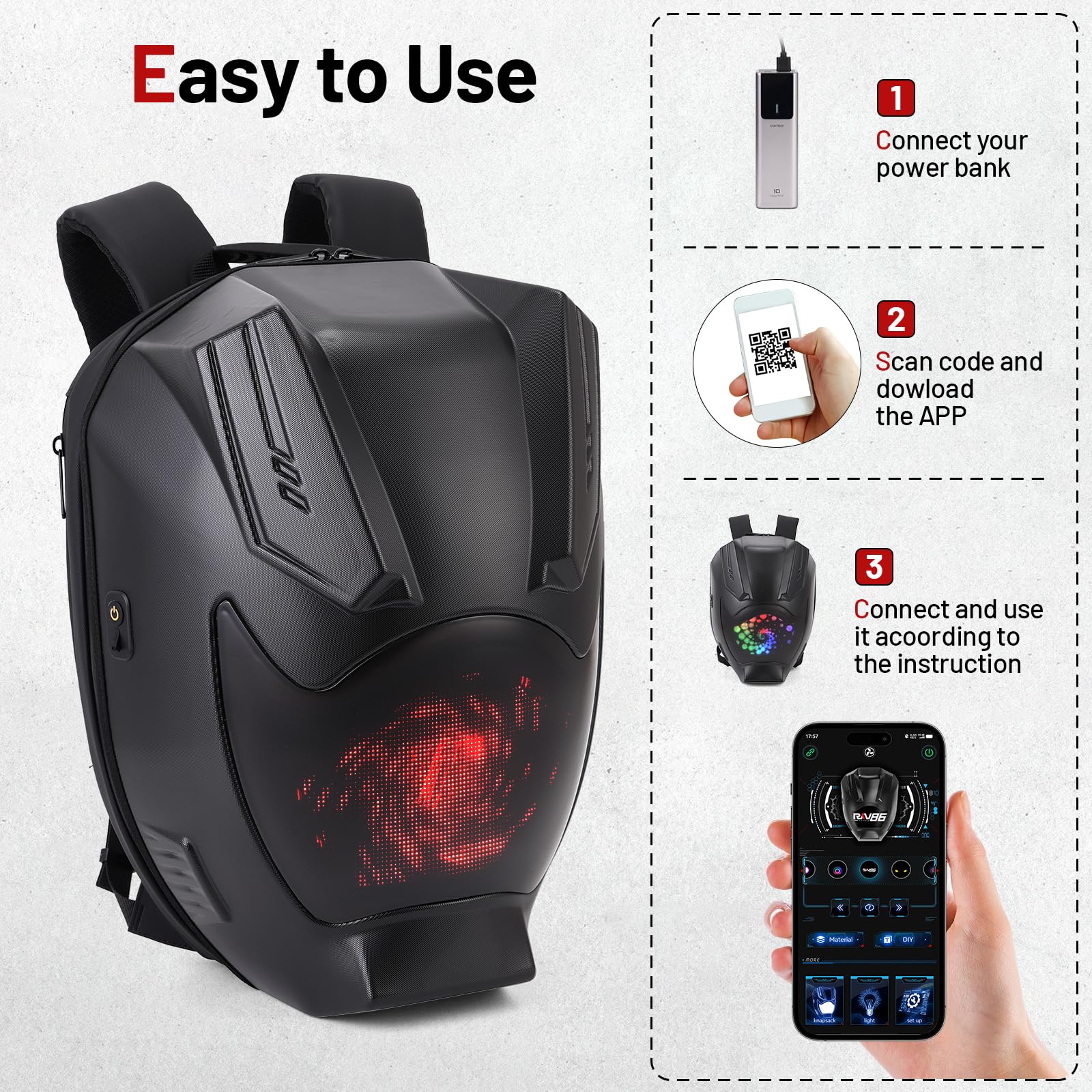 Easy to Use: Step 1: Plug the USB data port of the LED backpack into a power bank and turn on the power (The power bank is not included.). Step 2: Scan the QR code and download the APP.Step 3: Connect via Bluetooth and customize or choose different pattern effects according to your preferences.