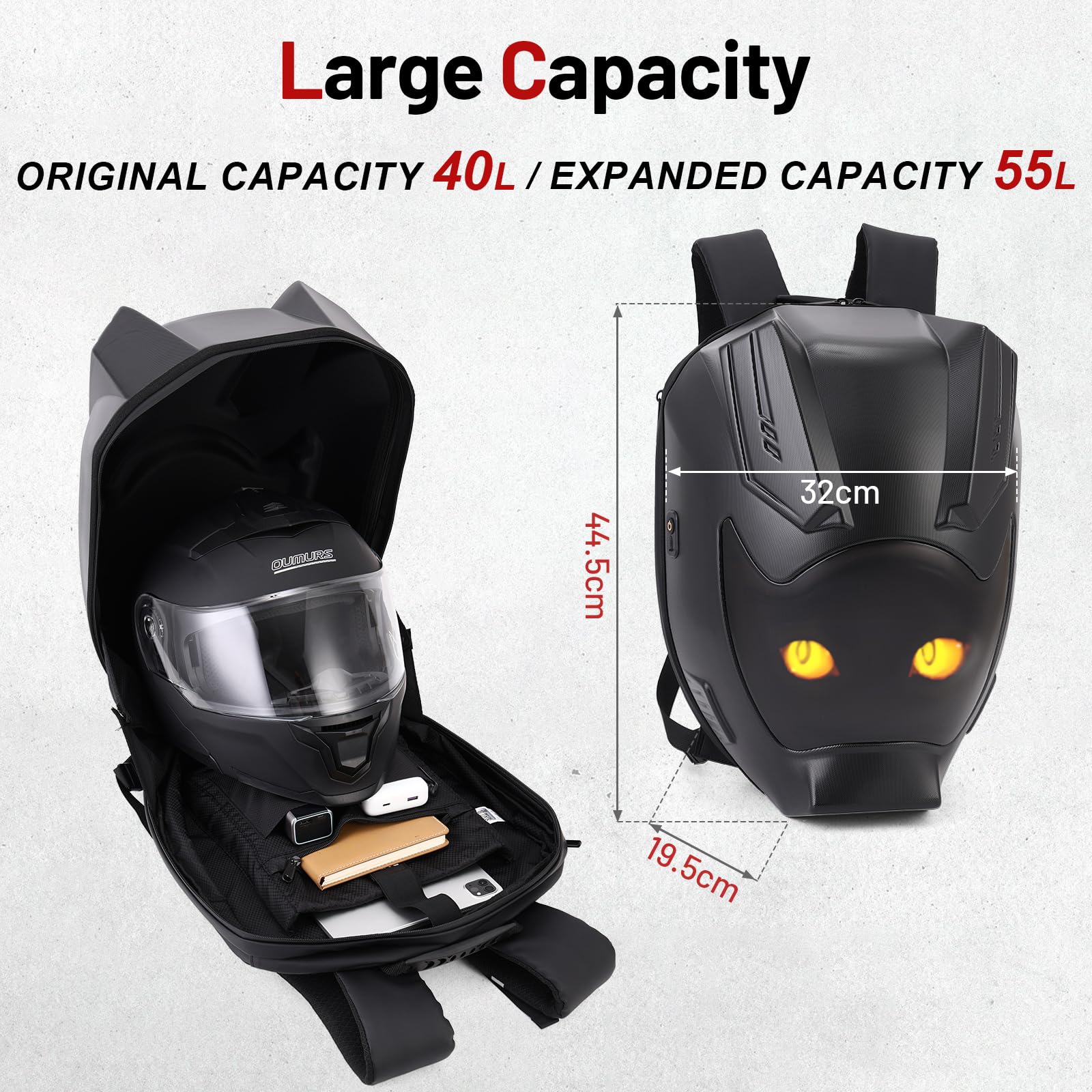 Expandable Space: The capacity of the LED backpack is 40L. After unzipping the expansion zipper of the backpack, the backpack capacity reaches 55L. The interior of the backpack has a multi-layer pocket design to meet the storage of different objects, documents, helmet and laptops.