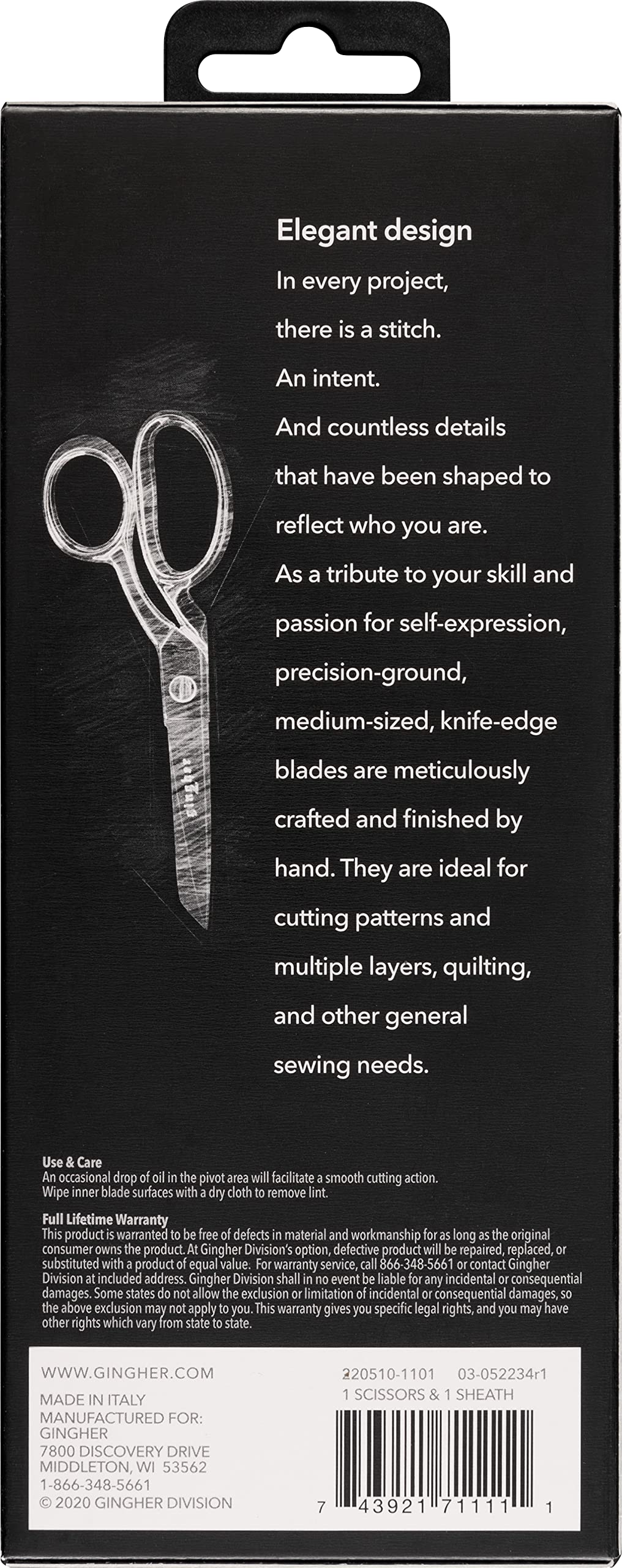 INCLUDES: 1 pair 7" Gingher Knife-edge Dressmaker Shears with nylon sheath; Full lifetime warranty
