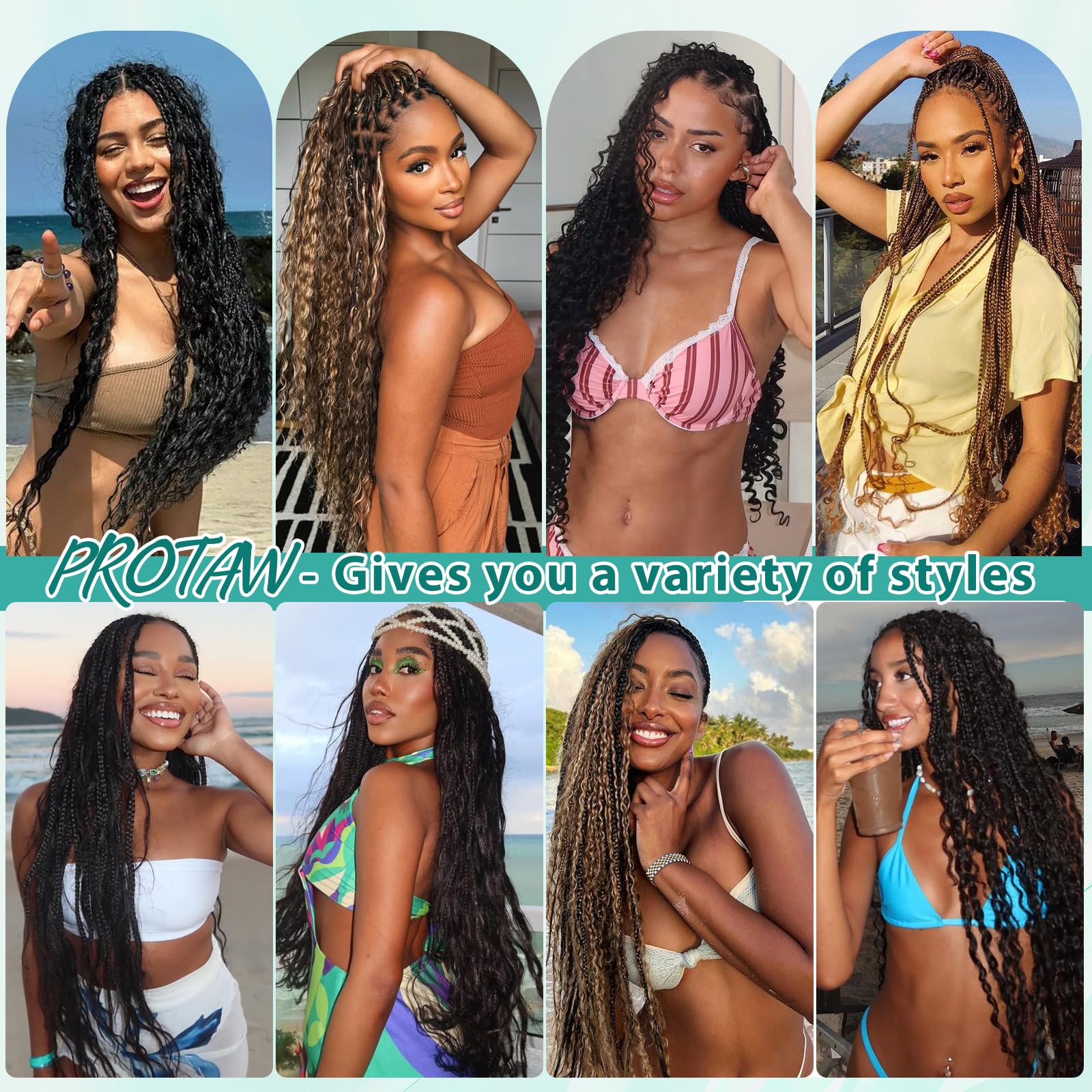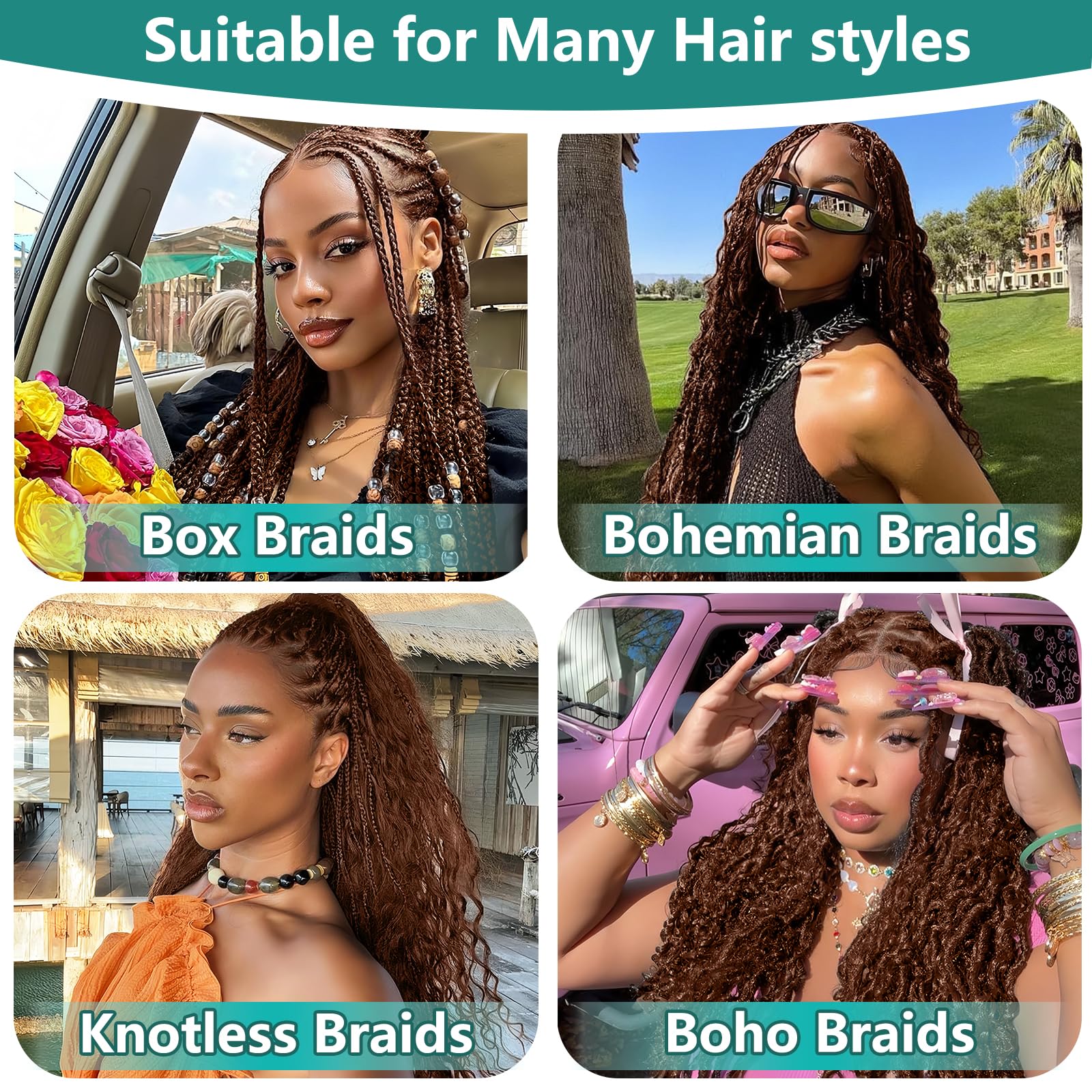 Braids Styling Options: Available popular colors- natural black, honey blonde, auburn, burgundy, and ombre highlight for trendy, head-turning looks. Let your creativity run wild! Ideal for boho knotless braids, bohemian crochet braids, boho Locs and goddess box braids with endless possibilities and stunning looks. No-Weft Design for Lightweight, reduces scalp tension, all-day comfort.