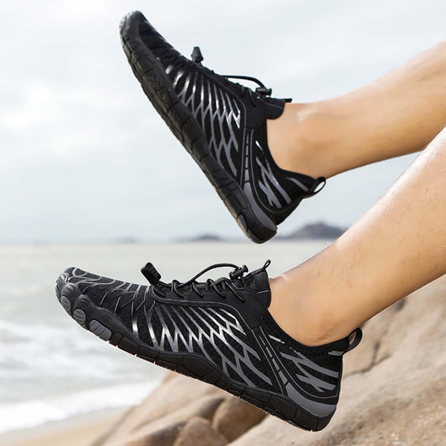 Non-Slip Sole - Advanced multi-directional treads and ultra-grip rubber conquer wet rocks, mud, and slippery surfaces. Deep grooves channel water while flex grooves mimic natural foot motion, trail runs, or alpine hikes without sacrificing barefoot agility.