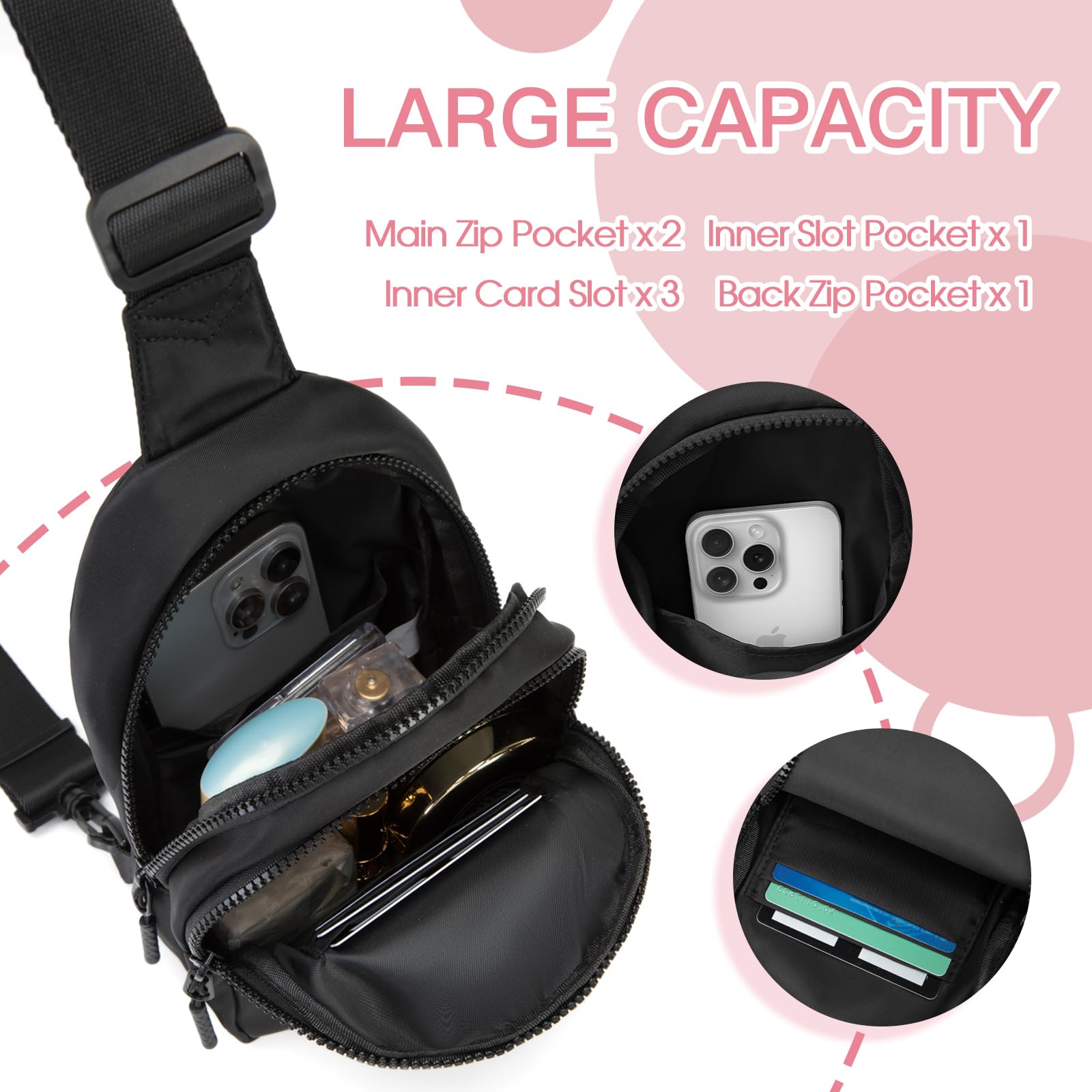 Adjustable Strap: With an adjustable strap that extends from 28.93 to 52.97 inches, our sling bag for women can easily transform into a fanny pack, crossbody bag, chest bag, or sling backpack. Perfect for any occasion such as traveling, ourdoors, dating, hiking, etc.