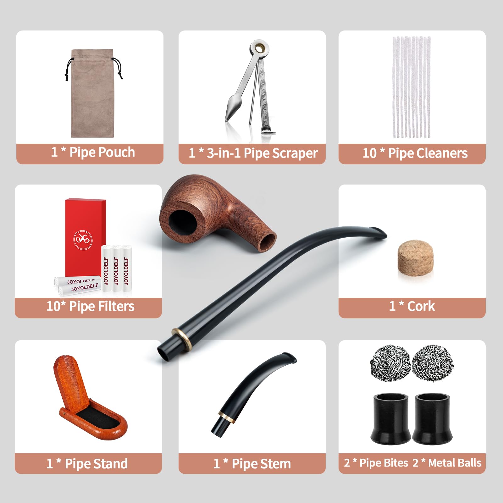 [All-Inclusive Accessories] This kit comes with a full range of accessories: a pipe stand for secure storage, 10 pipe filters, 10 pipe cleaners for maintenance, 2 pipe bits for protecting the stem, 2 metal balls, a 3-in-1 scraper tool, and a cork knocker for hassle-free cleaning. It’s perfect for beginners and seasoned smokers alike, providing everything needed for a premium smoking experience.